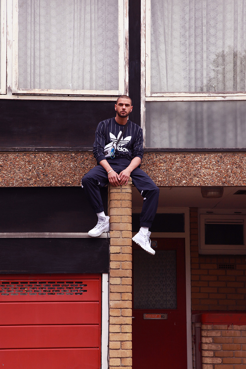 Sadiq wears ADIDAS sweater and trousers at URBAN OUTFITTERS, NIKE socks, PALLADIUM boots and EASTPAK bumbag.