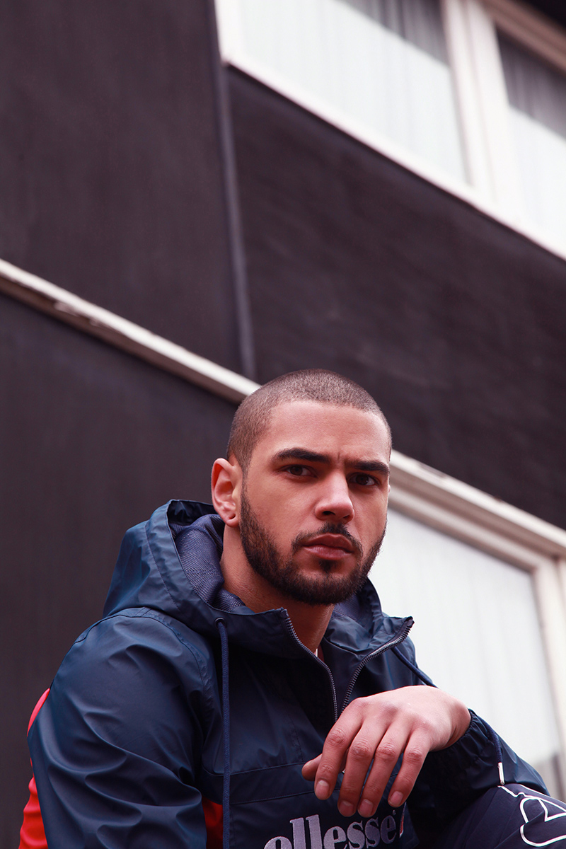 Sadiq wears ELLESE jacket and FILA trousers at URBAN OUTFITTERS.