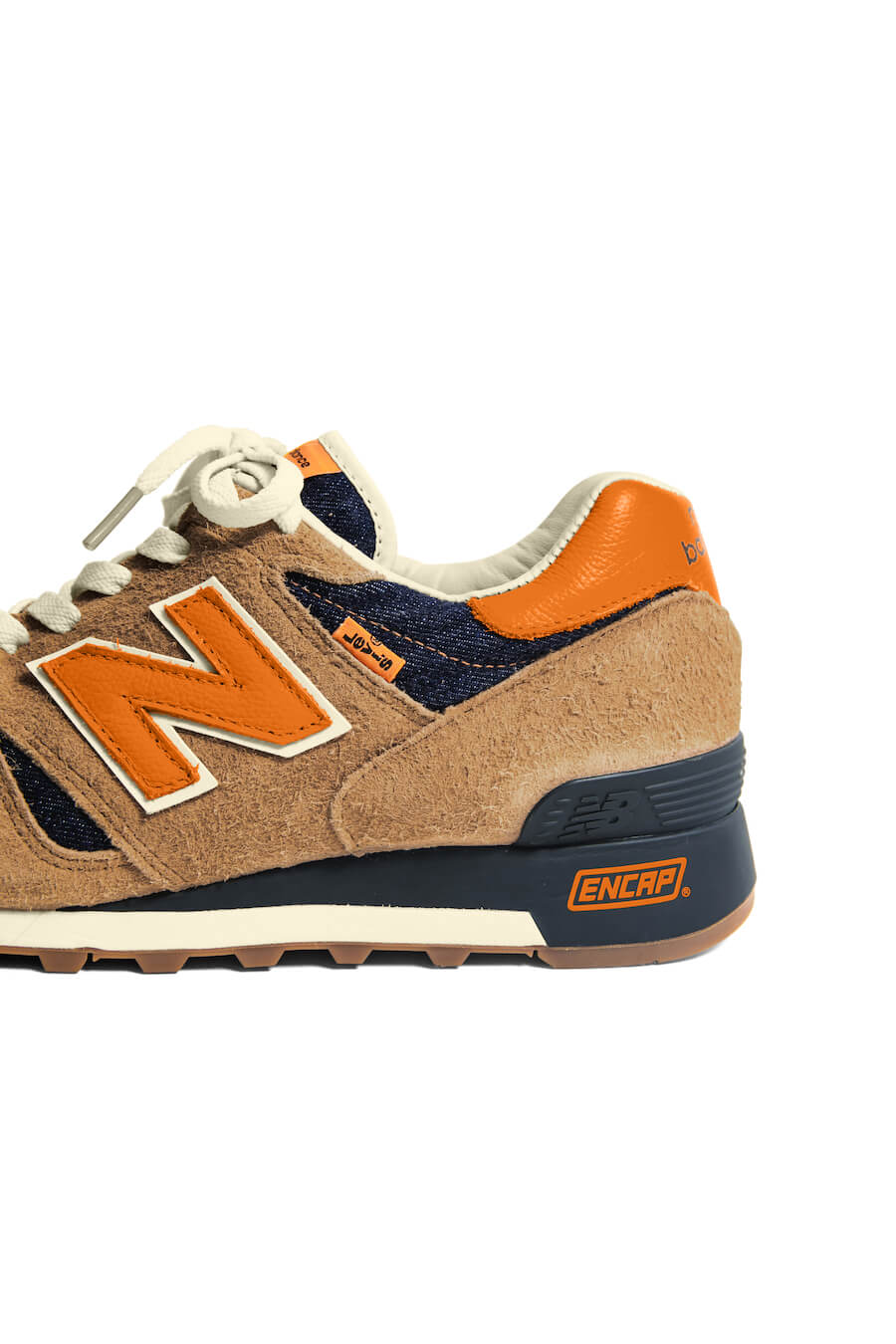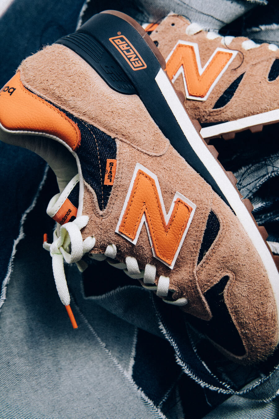 The sneaker — which is manufactured in New Balance’s facility in Skowhegan, Maine — is made with several Levi’s staples including suede that resembles the color of the signature back patch on its jeans and its deadstock White Oak XX52 denim (which comes from the now closed White Oak Mill, a manufacturer that produced selvedge denim domestically). It also features several hits of orange (including the Orange Tab on the outside left foot), a White Oak woven label on the tongue and a hangtag with “Levi’s for feet” branding that’s inspired by graphics from the archives of both brands. The dual-brand is also manifested via the orange and tan collector’s box.