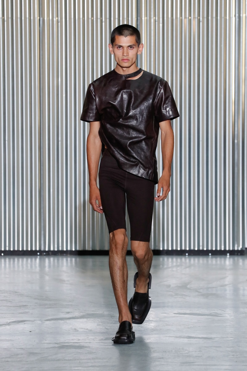 To commemorate his love for leather, the designer remained faithful to his collaboration with ECCO LEATHER, producing the “CRASHIER” express leather. The smooth biker Nappa leather has a shine and a delicate grain on a wax body, preserved to maintain its shape, reminding one of the violent shocks from the literature.
