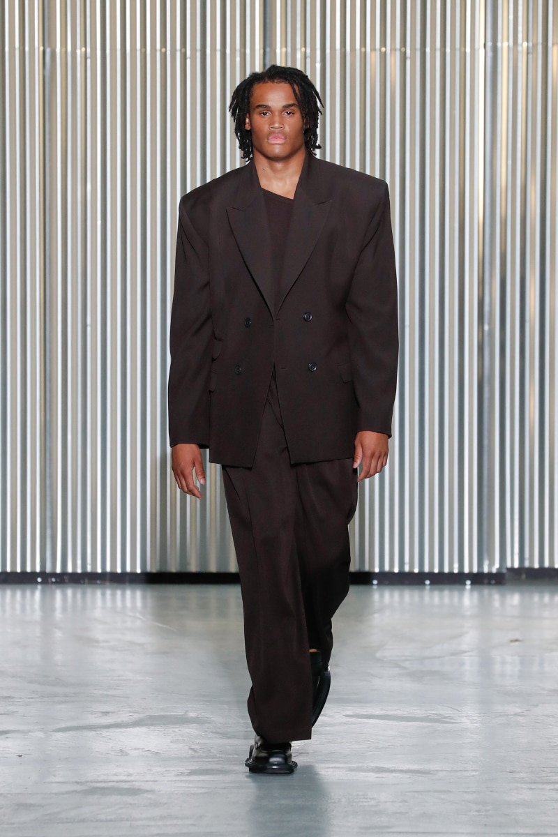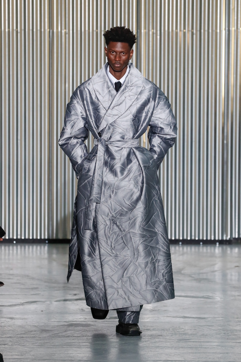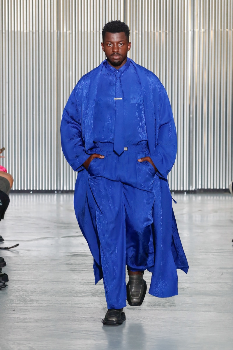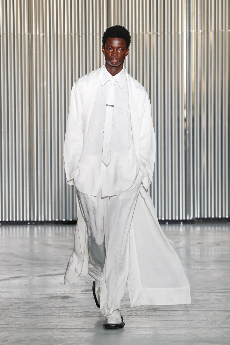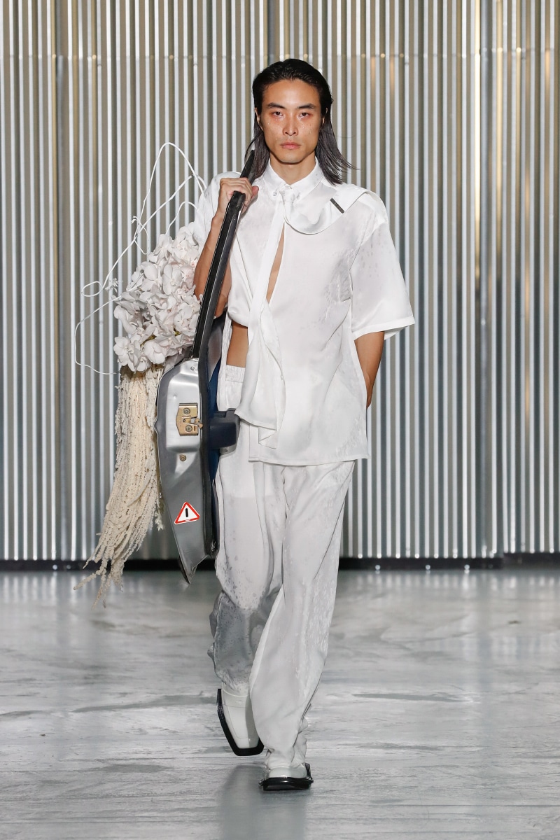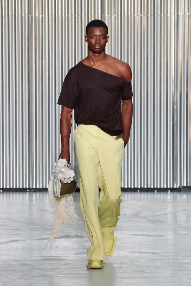 Amid all this tragedy, sensuality and representation of inclusivity flourish on the catwalk, with openings on tops, shirts, and jumpers, revealing the underwear. This is not a gender issue but an act of strength that LGN Louis Gabriel Nouchi wants to promote, as well as the inclusivity and diversity of male bodies; floral accessories represent mourning and the beauty of ephemeral and the renewal of life.