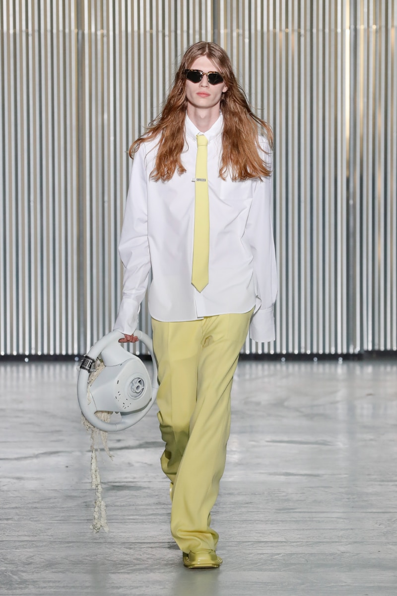 The twisted and shocked effect extends to sculptural pieces made from the same material and silver jacquard pieces, resembling crumpled sheet metal, jumpers, and shirts with twisted designs depicting emotions that can turn our hearts. The collection displays a variety of colours affected by George’s journey, from canary yellow to phosphor blue, to black, white, and espresso brown.