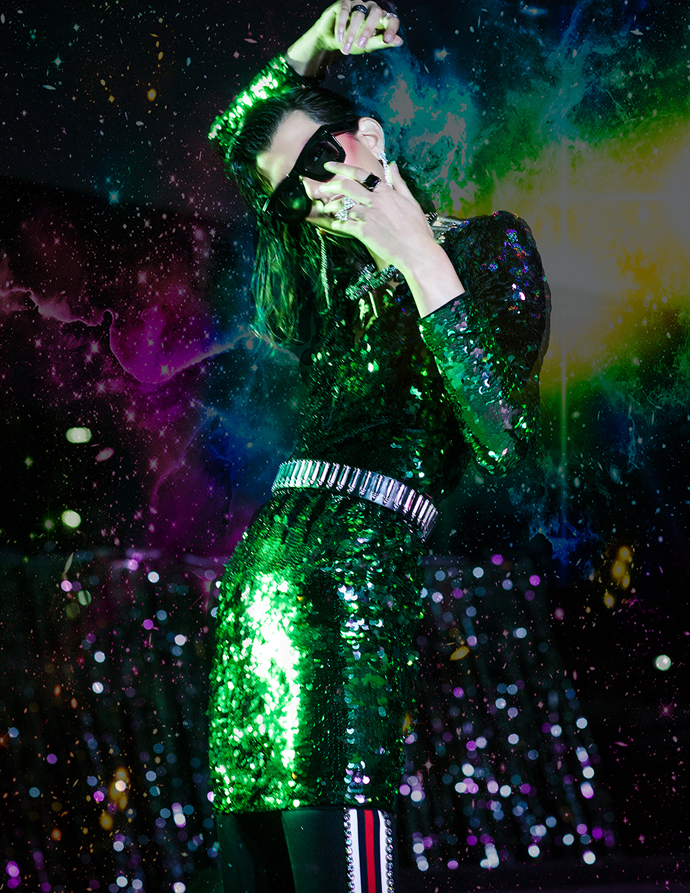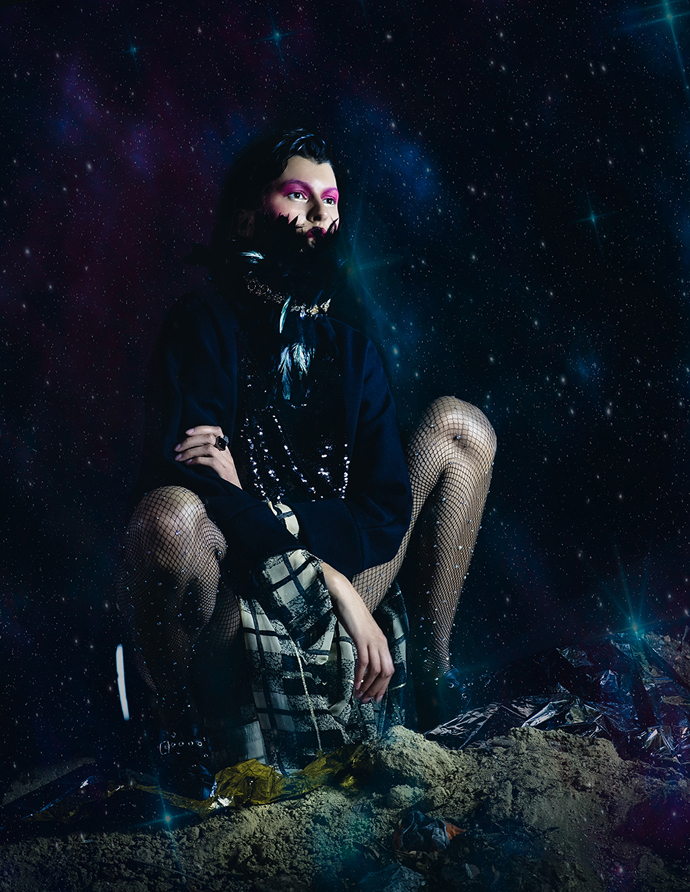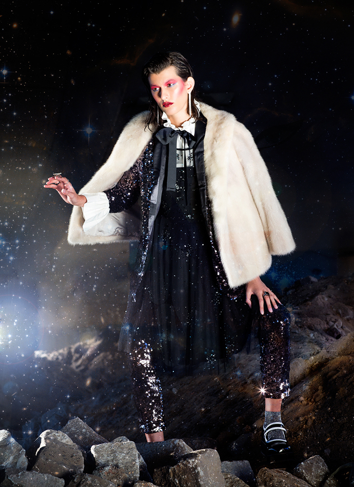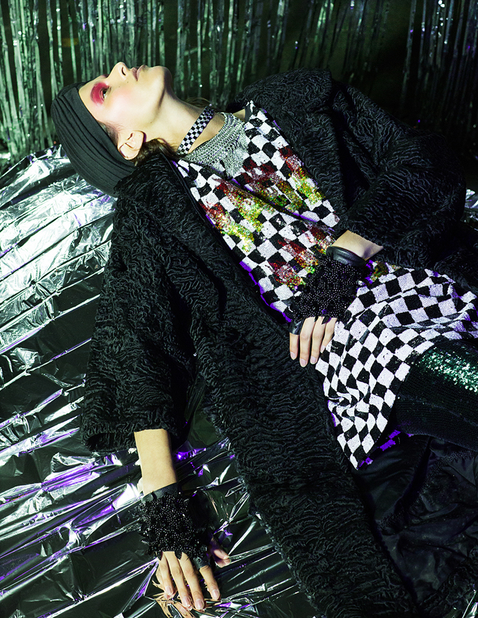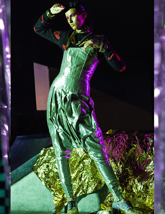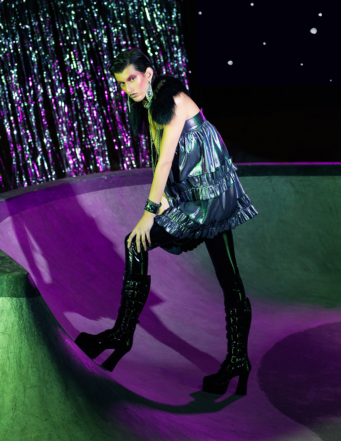 Blouse – ACBY, dress – Parosh, trousers and blazer – H&M, shoes – Demonia, fur – Vintage Jumper – ACBY, dress – Petar Petrov, shoes – Demonia, collar – ACBY , tights – Foot Power, socks – Cos, jewelry – stylists own Overall – ACBY, jumper – Saint Laurent, shoes – Funtaisma, jewelry – stylists own Jewelry – stylists own, leather jacket – Rich and Royal, scarf – Versace Shirt – Jaded, trousers – H&M, coat – vintage, shoes – Pleaser, gloves & turban – ACBY, jewelry – stylists own Skirt worn as dress – Asos, fur collar – Tom Rebel , jewelry – Stylists own Skirt worn as dress – Asos, latex leggings H&M, boots – Demonia, fur collar – Tom Rebel , jewelry – Stylists own Dress – H&M, trousers – Gucci, shoes – Pleaser, belt & jewelry stylists own, sunglasses Lanvin for H&M Dress – H&M, trousers – Gucci, shoes – Pleaser, belt & jewelry stylists own, sunglasses Lanvin for H&M Top – H&M, skirt – Saint Laurent, jacket – ACBY, socks – Topshop, shoes – Funtaisma, accessoires – stylists own
