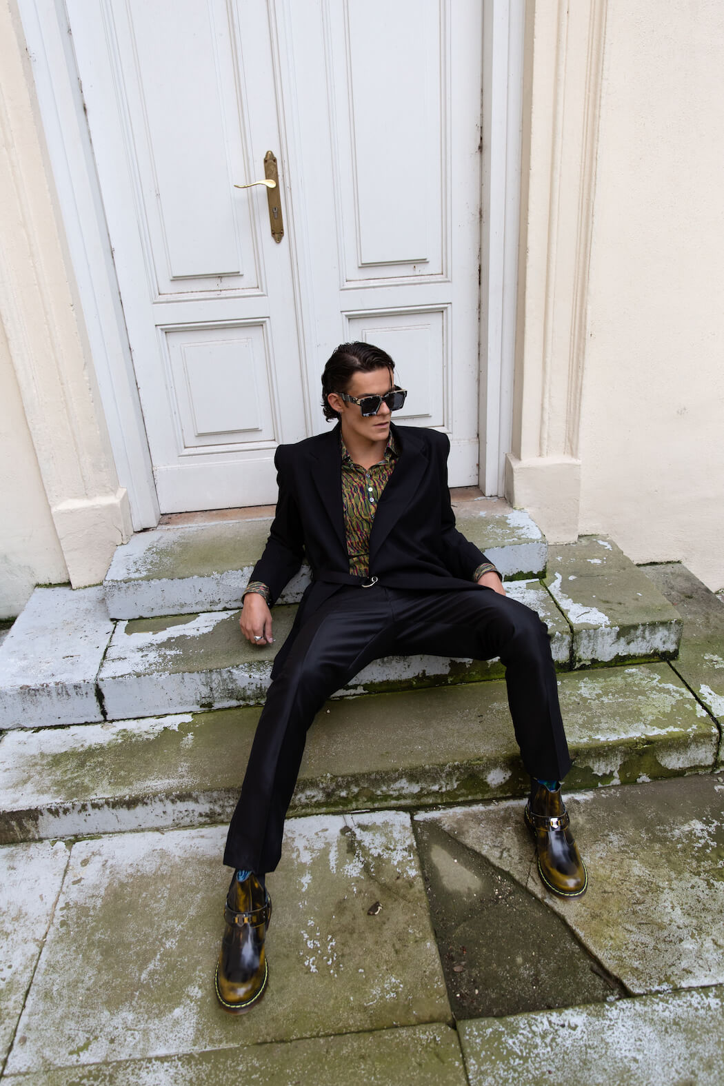 suit: Neige, shirt: Rage Age, shoes: Rage Age, sunglasses: The Blog Shop, signet: Juzam