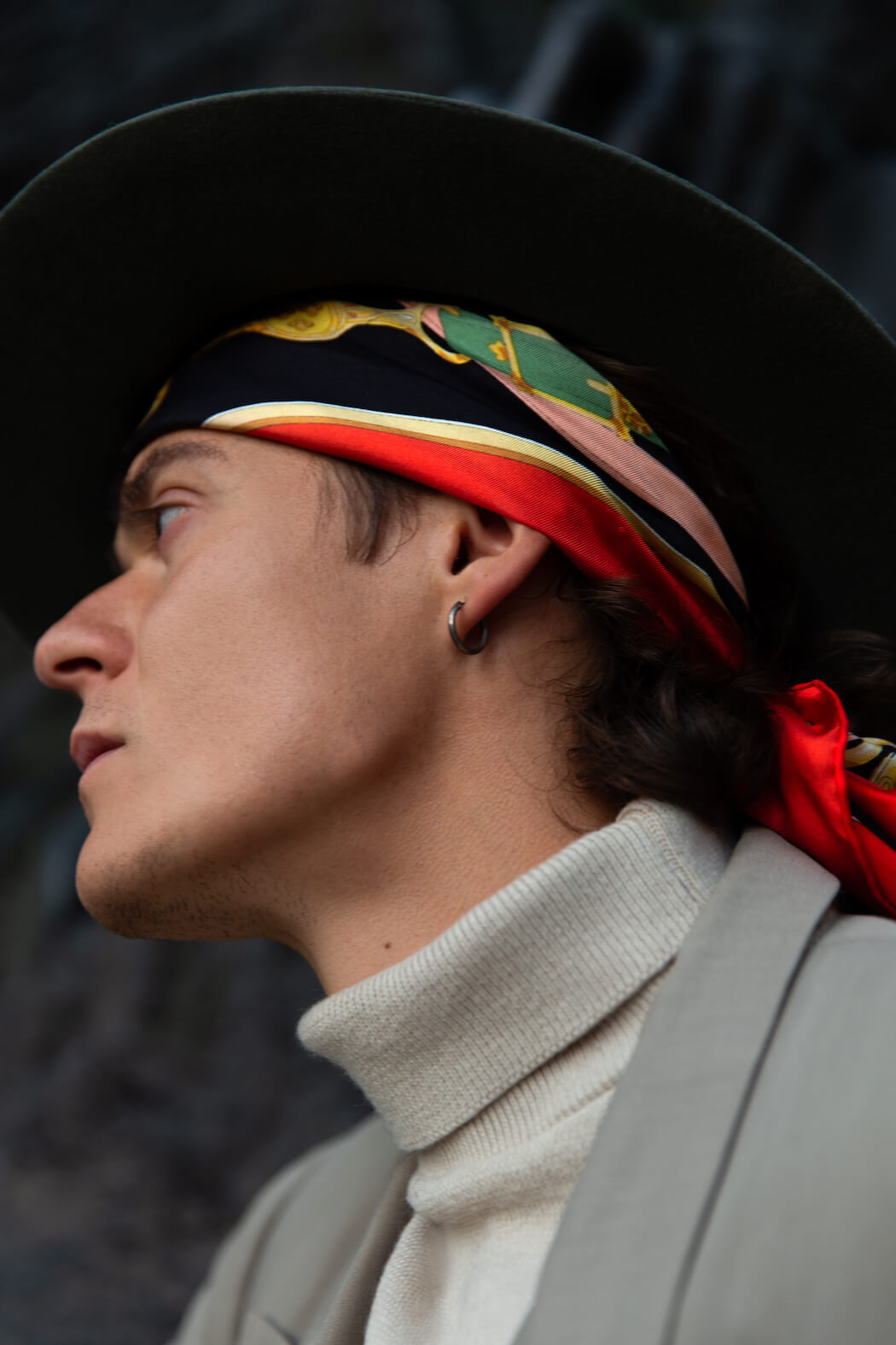 turtleneck: Peter Werth London / Gloria Vintage, jacket: Saint Warsaw, scarf: Hermes, hat Wanatowicz Design