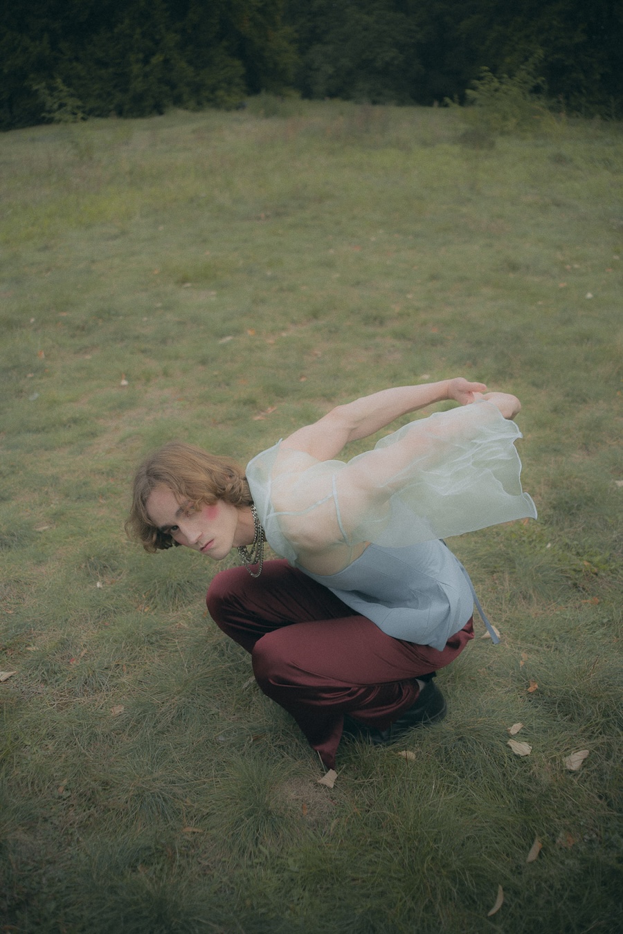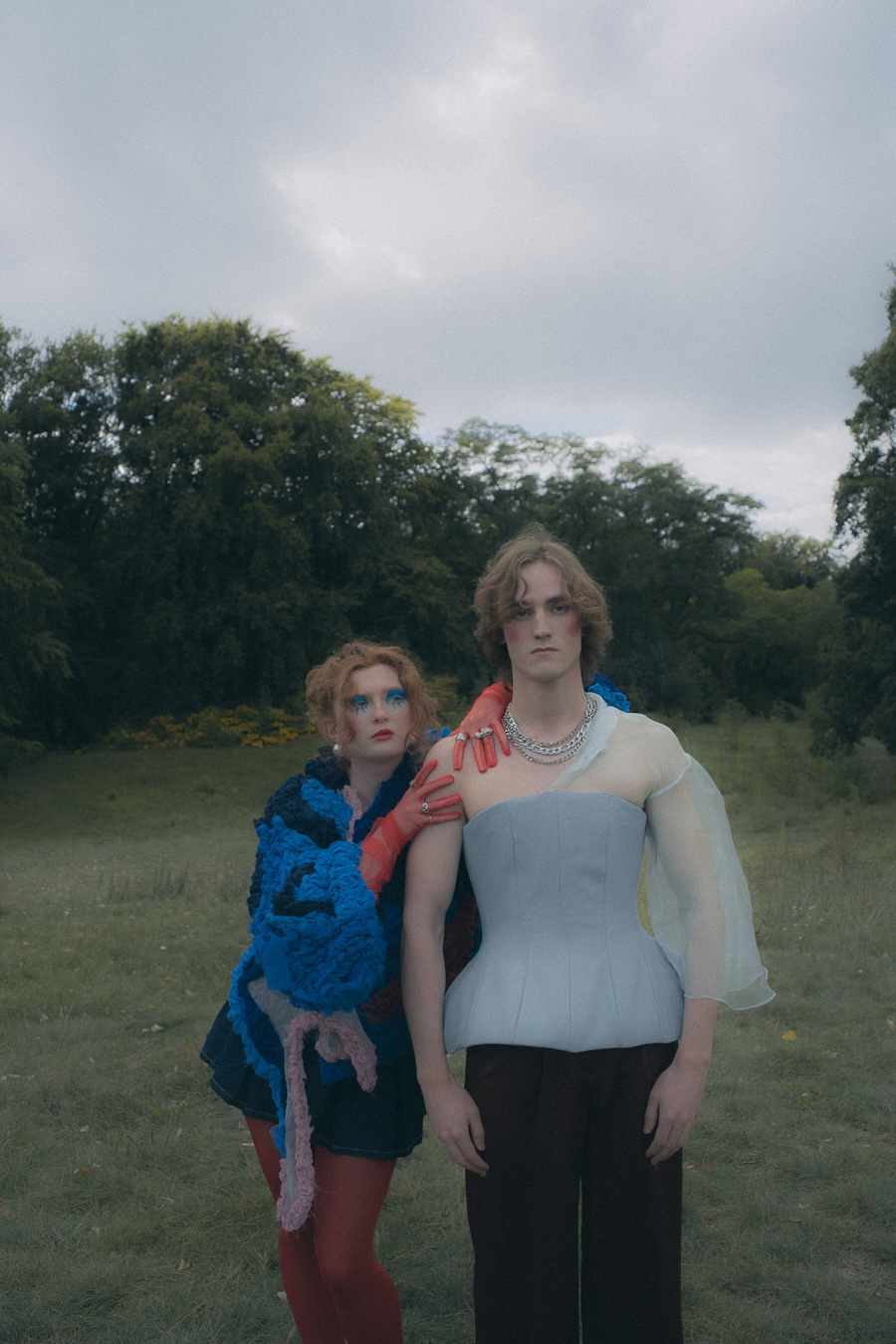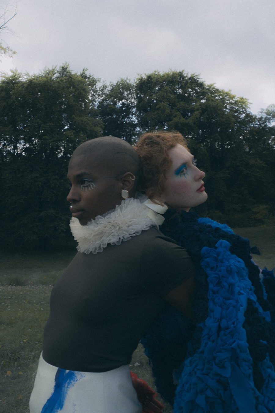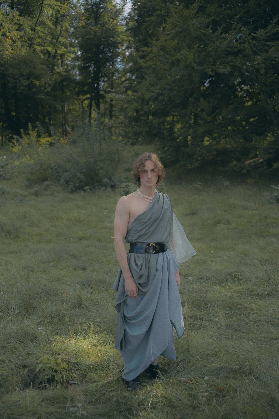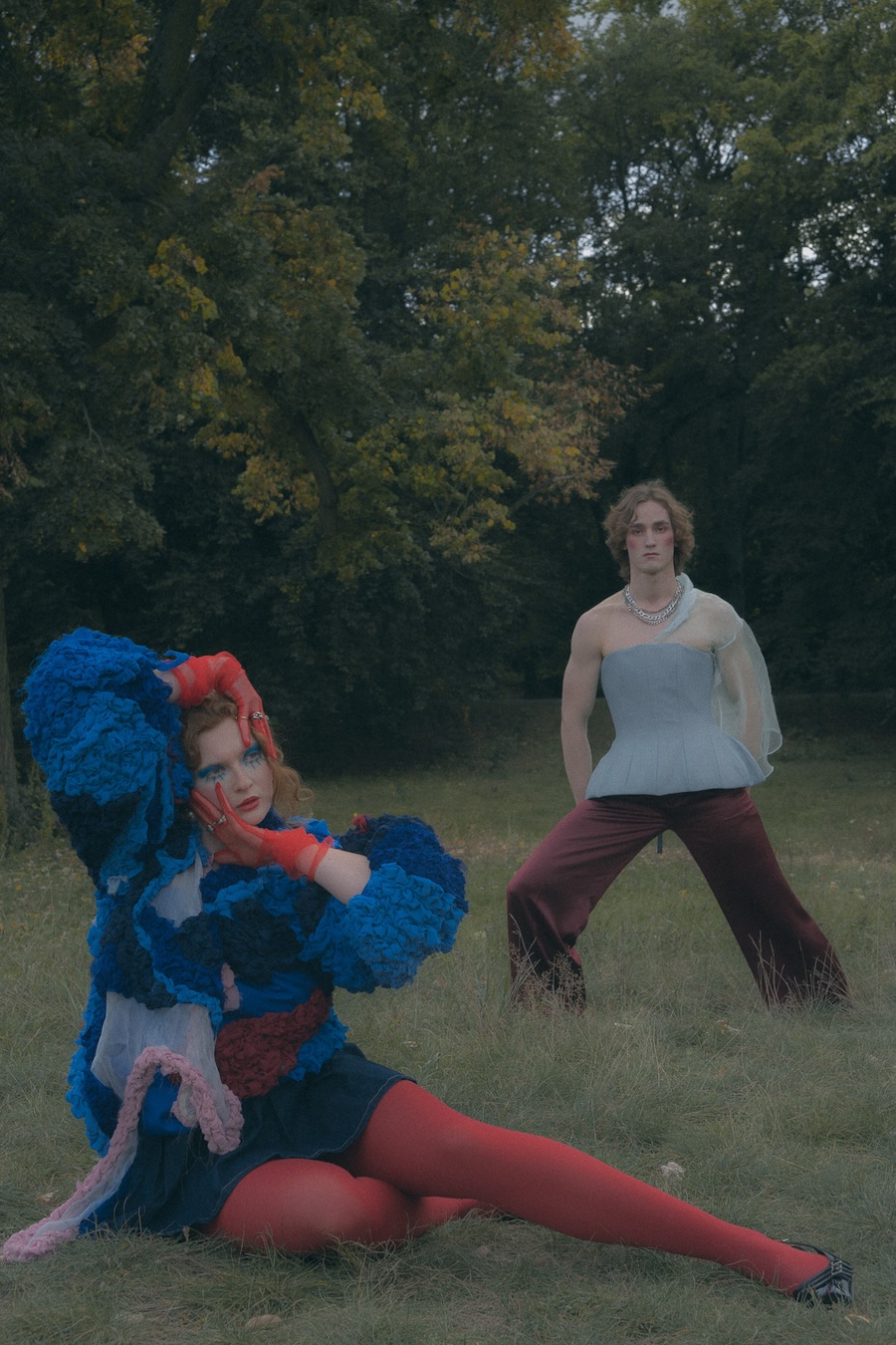 Fashion as a dreamscape, a place where clothing transforms the body into something symbolic, collectable, and slightly unreal. A KALTBLUT exclusive. Photography by Melih Demirkol. The models are Benjamin Lucca, Lina Förster and Stevie Gunter. Make up by Katsiaryna Mikhailava. Styling by Diana Abdo and Evgeniia Druzhinina.