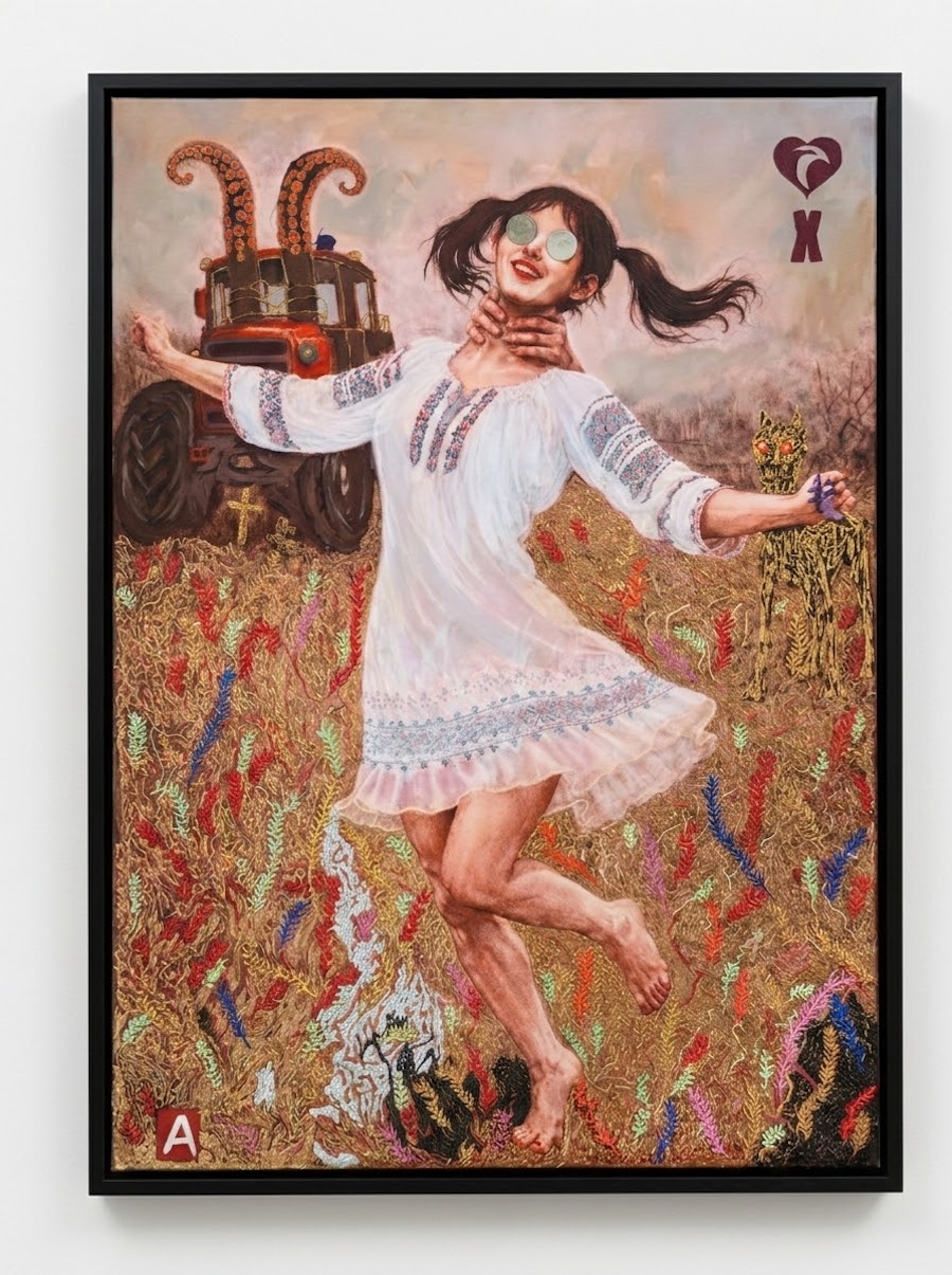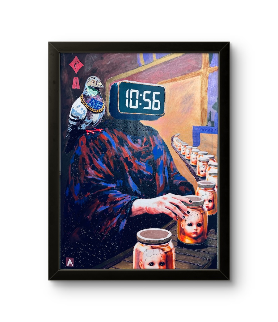 “The King of Parents.” A pudgy child with a malicious expression walks his parents on a leash studded with blue rhinestones. The parents don’t protest the inverted hierarchy – they’re also handcuffed to each other by their child-king. Why? So they can’t divorce. Divorce has become the unspoken terror of modern children, a bogeyman constructed from schoolyard stories of friends whose lives fell apart when parents split. The painting isn’t a moralistic critique of spoiled kids. The child-king isn’t happy – he’s an accidental tyrant, product of abdication. The parents put themselves on all fours, allowing their children to dominate them. The playing card symbolism – King of Spades – moves the image from realism into allegory: not a family scene but a modern archetype of authority received without initiation.