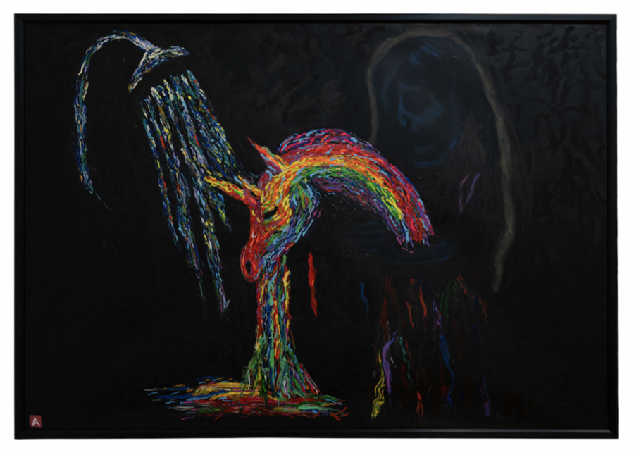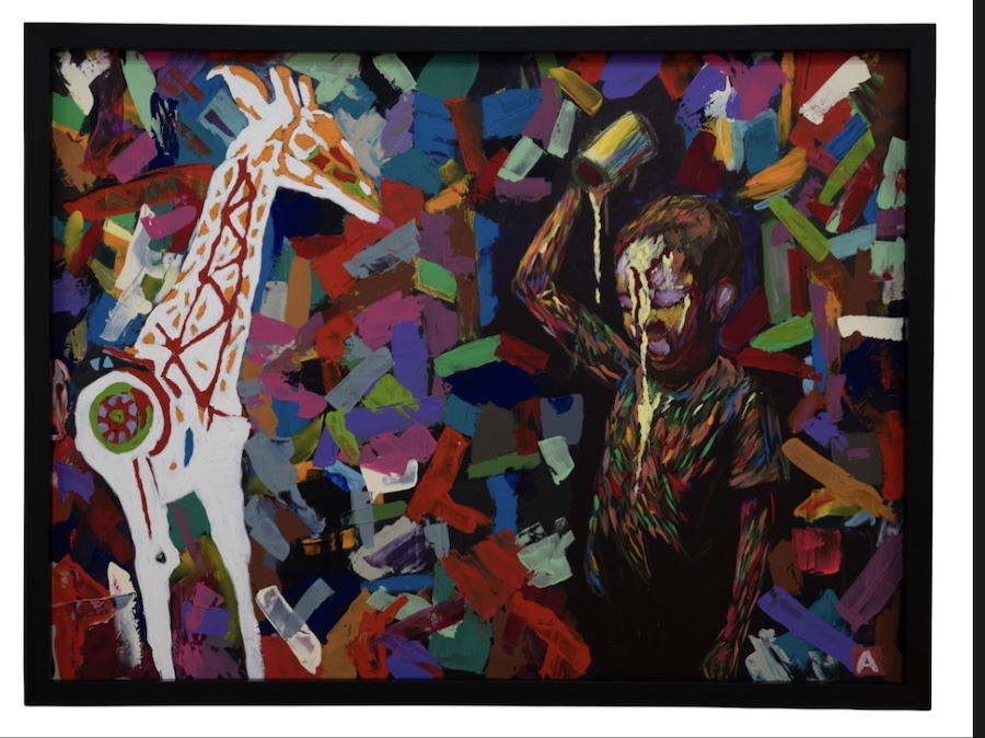 His canvases are large, aggressive, and loaded with impasto thick enough to cast shadows. The palette runs through what he calls rotten golds and bruise purples, colours that feel like something healing badly. Nothing here decorates. Nothing soothes. Alexa doesn’t paint for people who want their walls to feel peaceful – he paints for people willing to sit with images that interrogate them, that follow them home and ask questions at 3 AM when the defences are down.