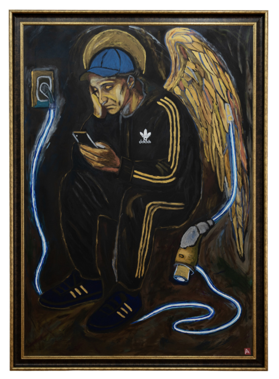 “Depleted Gabriel.” Archangel Gabriel – the one who brought Mary the news that changed history – squats in an Adidas tracksuit, cap on head, phone in hand, a blue neon cable running from his wing into a wall socket. Gabriel hasn’t fallen. He’s not Lucifer, not a rebel – just drained, which is infinitely sadder than revolt because revolt requires energy and he has none left. He’s plugged in like an electric car. The angel who delivered every message, crossed every distance between divine and human, has arrived at the position everyone exhausted by a world that demands too much: squatting, scrolling TikTok miracles about magic diets. The neon cable is the umbilical cord of our age – feeding and imprisoning simultaneously. When you see it coming from an archangel’s wing, you understand no being, however sacred, has escaped the screen.