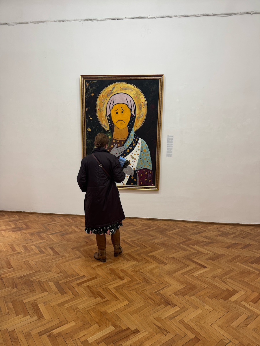 The subject matter ranges across religious iconography, mythology, digital culture, and the quiet catastrophes of contemporary family life. What unites it is a refusal to let any symbol rest easy. Every sacred image gets recontextualised for an age that has flattened transcendence into content. Every myth gets updated to reveal what it always meant, but we were too comfortable to notice. The paintings don’t mock – they diagnose. They hold up a mirror, and the reflection isn’t flattering.