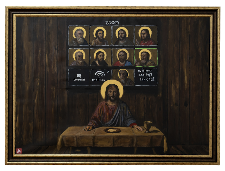 “Judas Is Busy Today.” The Last Supper happens on Zoom. Jesus sits alone at a table with a glass and an empty plate while apostles appear in grid view – some with halos, one with the green outline of an active speaker, another with camera off, another with connection lost, Matthew has left the chat. Judas doesn’t appear at all. He’s busy today. The painting says one thing about community: we’ve replaced it with video calls and pretend it’s equivalent. The Last Supper was the most important moment of physical presence in Christian history – thirteen people in one room, one of them betraying while looking the other in the eye. On Zoom, you cannot betray by eye contact, but you also cannot love, conspire, break bread, or wash feet. You can only be technically present and absent in every other way. Judas is missing because betrayal no longer requires showing up. It happens in background tabs, camera off.