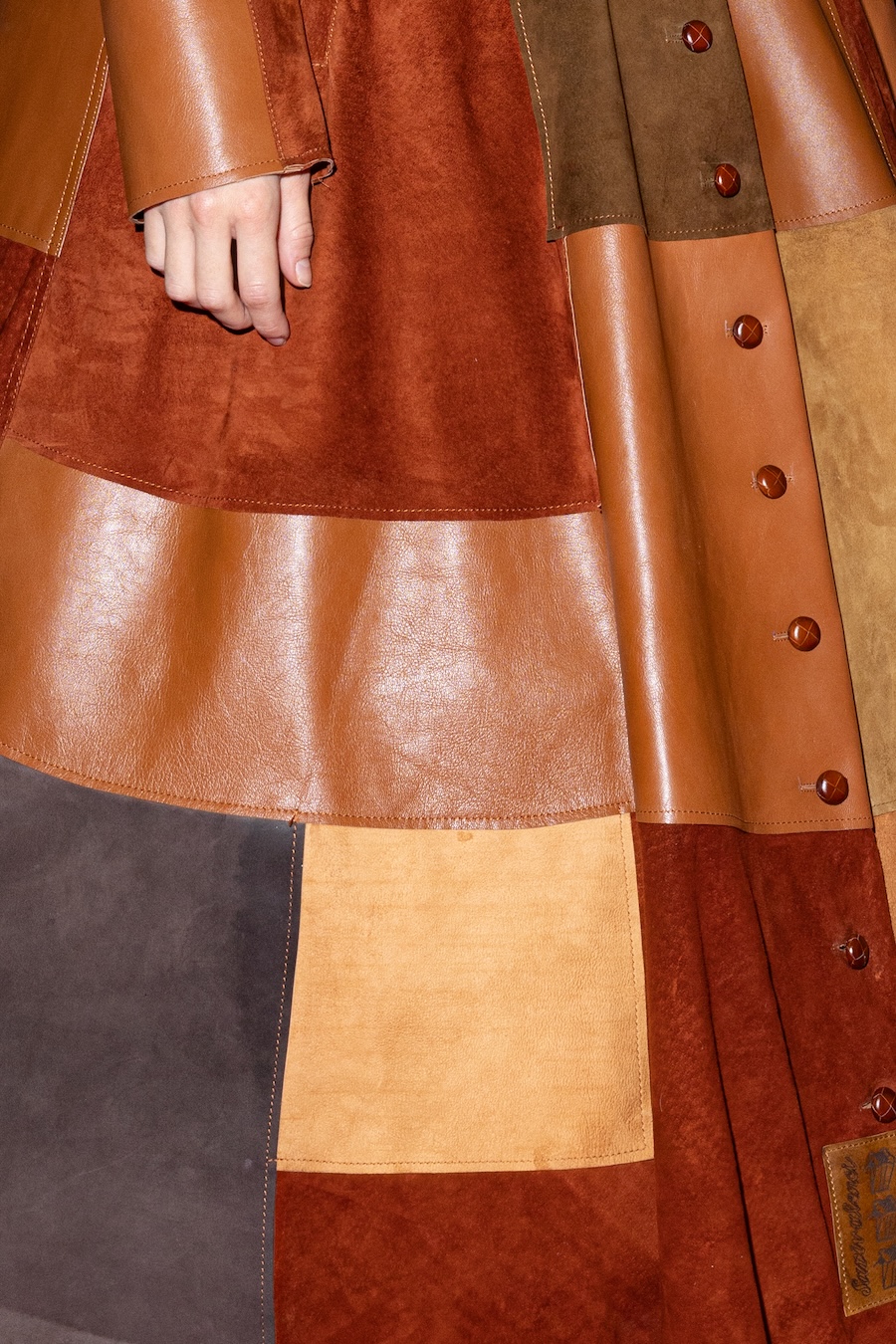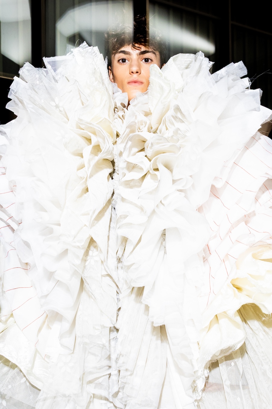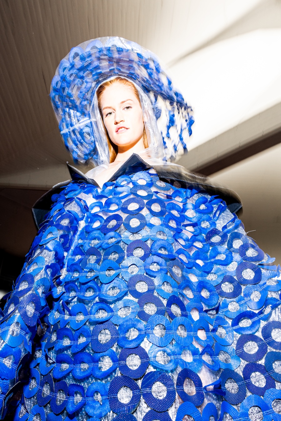 Then came the blue look from Zoja Muhič, a hypnotic, scale-like eruption of satin circles layered so thickly they created their own micro-climate. The model looked like a cosmic mermaid priestess rising from a digital lagoon, glowing with that “I am both human and aquatic WiFi router” aura.