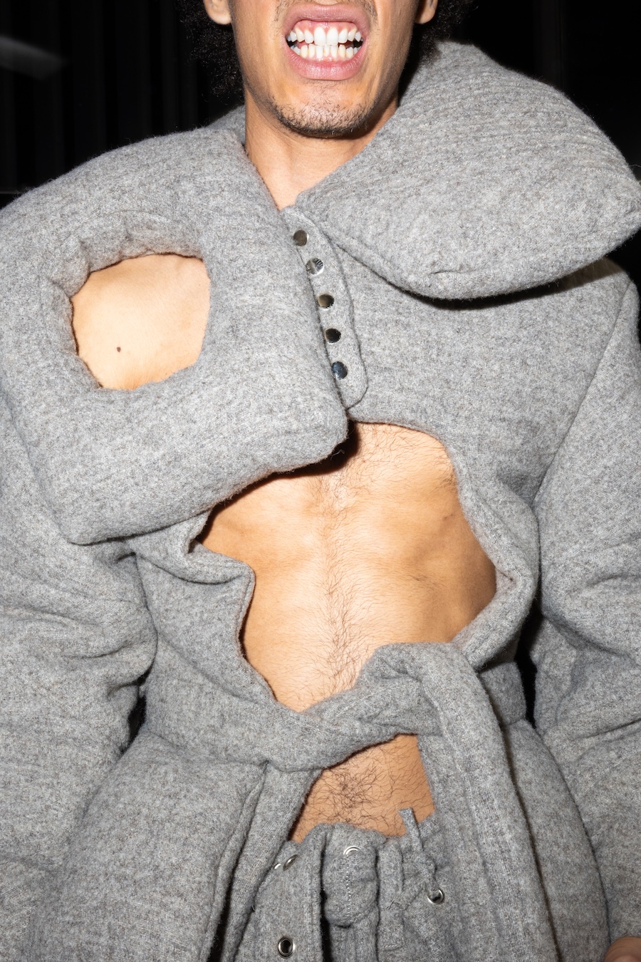 One of the most talked-about looks of the week came from Szarvas Valentin, who may or may not hate the human torso. Imagine a giant, boiled-wool creature with cutouts that feel more like bite marks than openings. Valentin showcased his designs as part of the BCEFW Collective show in partnership with LJFW, presenting three extremely talented Hungarian brands: Szarvas Valentin, WINNA and FANNILSZ.