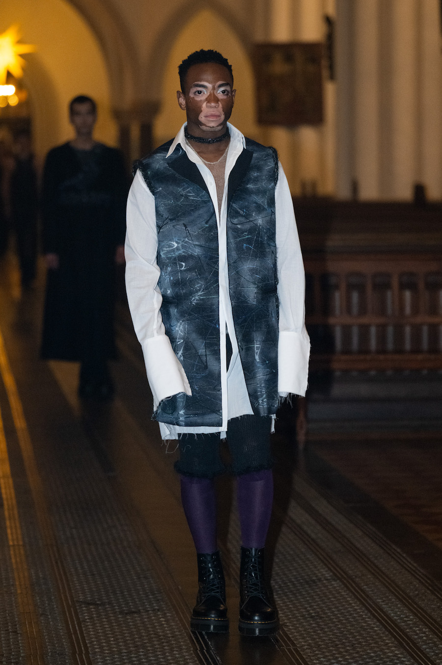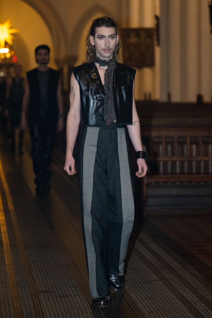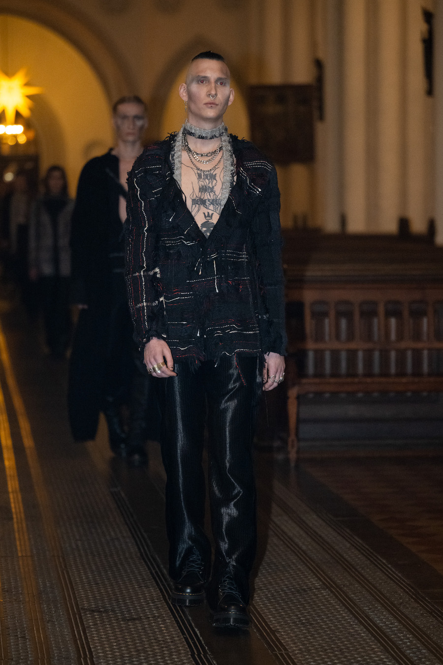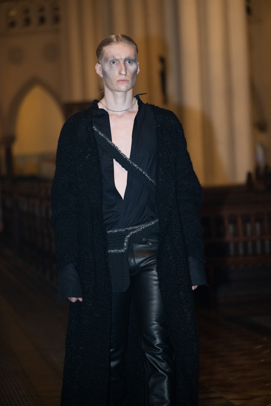 collection in St. Marienkirche on Alexanderplatz. He consciously breaks the typical pace and choreography of a classic fashion show, letting his models pause between candlesticks to give guests the opportunity to look at his designs in peace. The LML studio show was accompanied by an organist who played historical and contemporary works.
