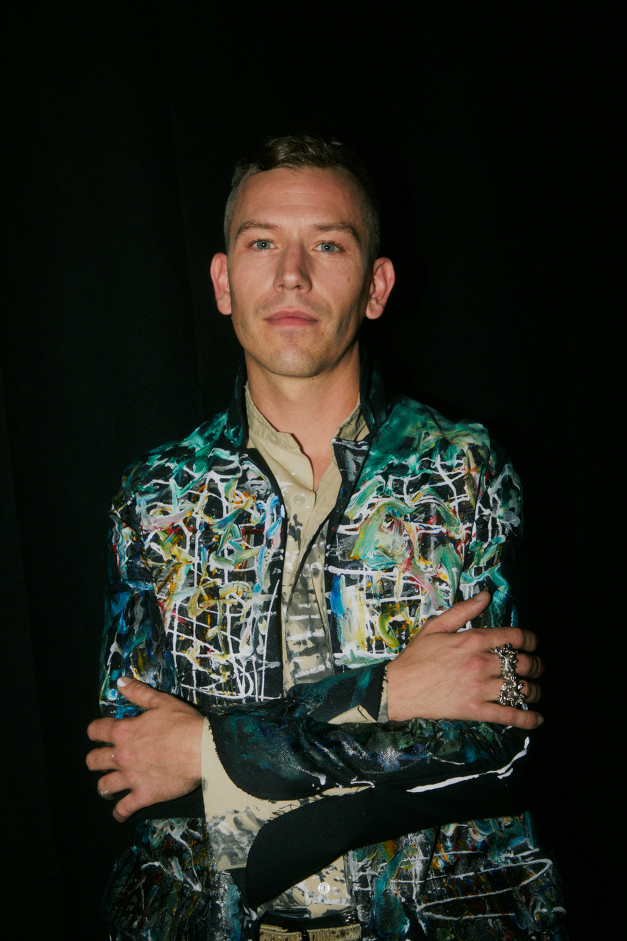 A favourite look of the designer is a hand-knit recycled polyester blazer worn over tailored shiny black jacquard trousers and hand-painted shoes. All of his designs are one-offs or only available in very limited numbers, they are intended for every gender and body shape and are created by hand in his studio in Berlin. This doesn’t just mean the silhouettes, but the native Frenchman also develops many of his materials himself. He decorates and paints fabrics by hand, using only recycled yarns. In collaboration with textile designer Joy Weinberger, he also designed all the woven fabrics himself for fall/winter 2023.