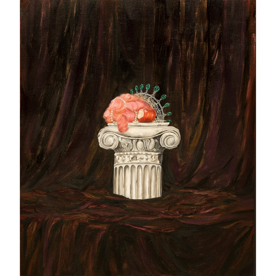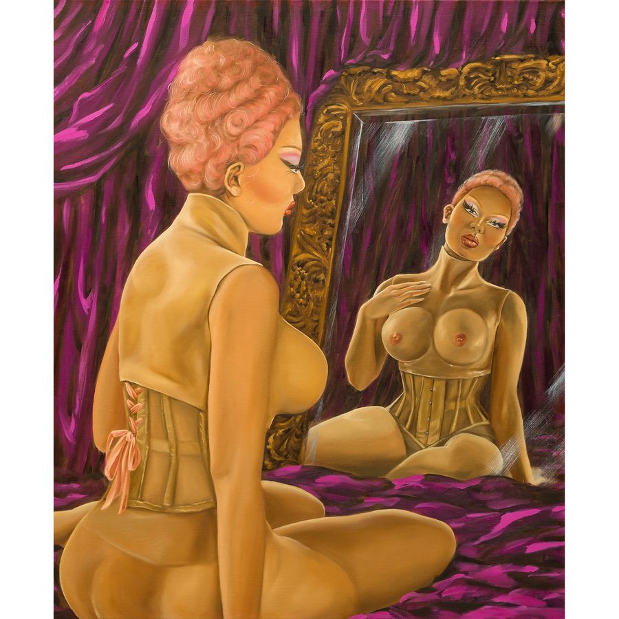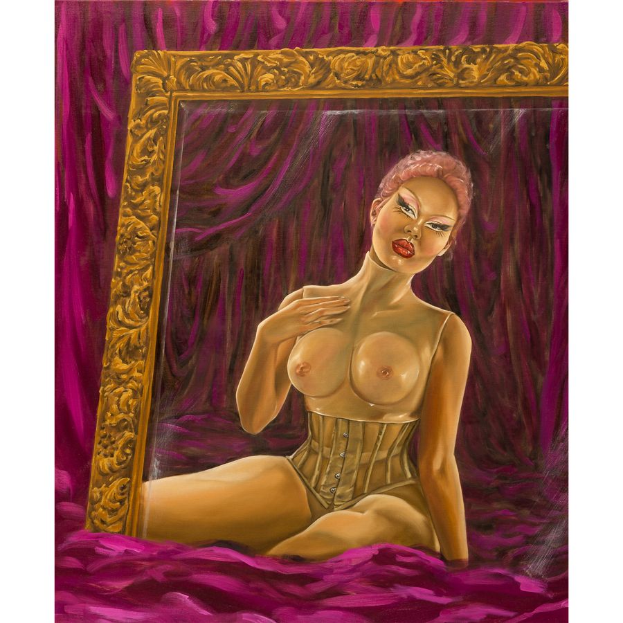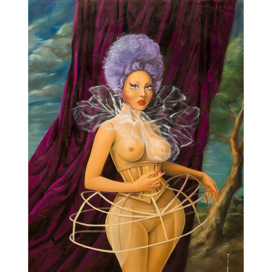 While the performative post-structural aspect is found to be temporal, our core is timeless and universal, and as the artist regards her constructed identity and performance as an artwork, she makes use of manual photoshopping, in a postmodernist pastiche that brings together Instagram pop culture and stereotypes of female beauty, silicone boobs, lush dresses, hip-pads, fetish petticoats and classical sculpted busts. All-in-all, the artist’s oil paintings incorporate diverse elements to which separate groups may relate — connecting to the drag element, the queer identity, surgery & body modification, makeup, fashion or female narratives, respectively — upscaling her symbolism to universal-level status.