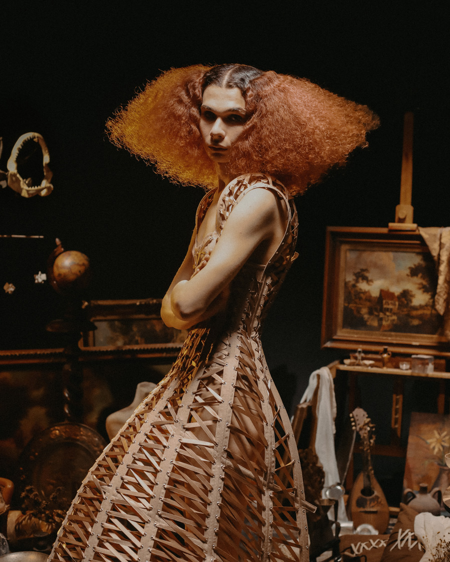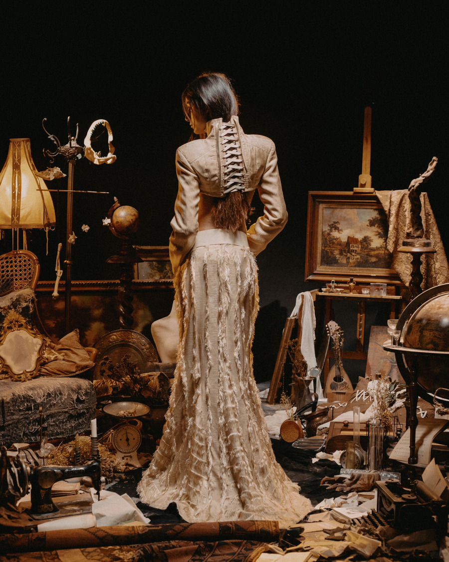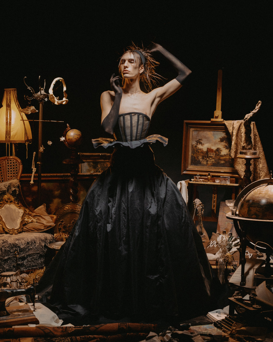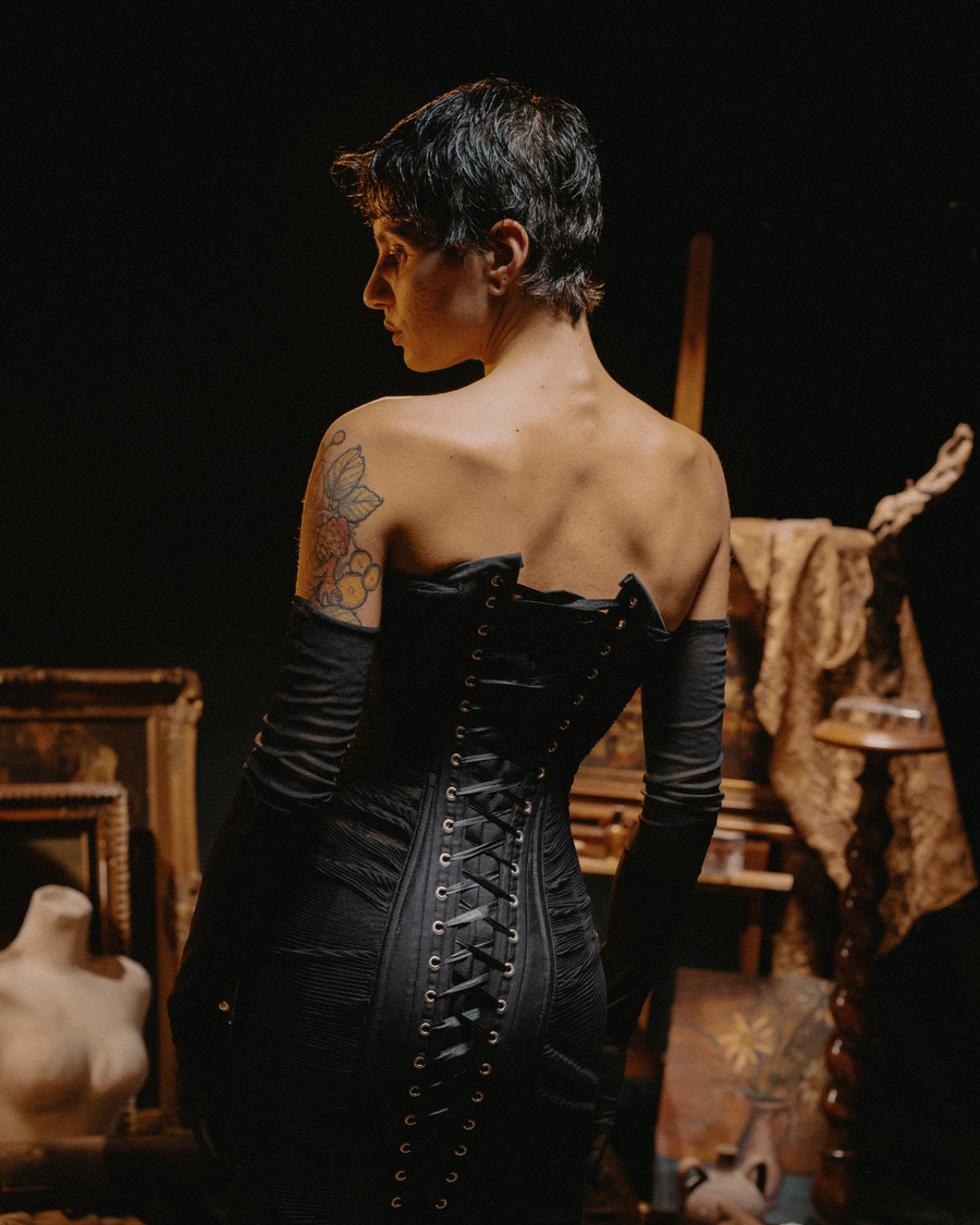 At its core, Epitelio is a raw and poetic exploration of self-perception. Inspired by the complexities of body dysmorphia and gender dysphoria, the collection translates these deeply personal experiences into bold sartorial statements. Imagine silhouettes that feel slightly “misplaced,” pieces structured to embrace—or sometimes constrain—the body, reflecting the struggles of aesthetic and gender conformity. Corsets and understructures shift between empowerment and restriction, playing with the dualities of oppression and liberation.