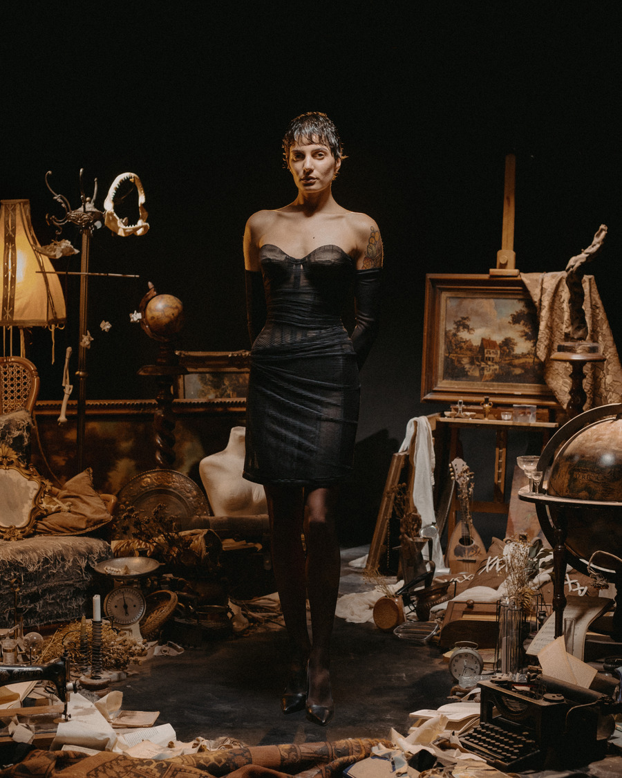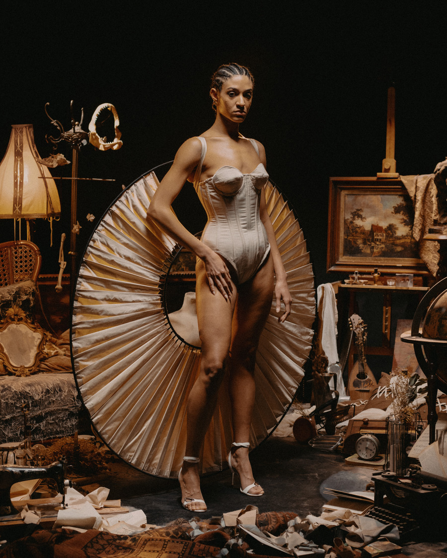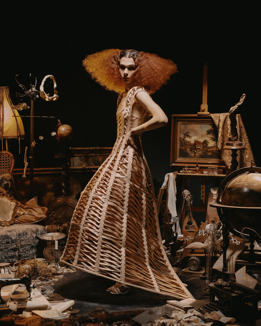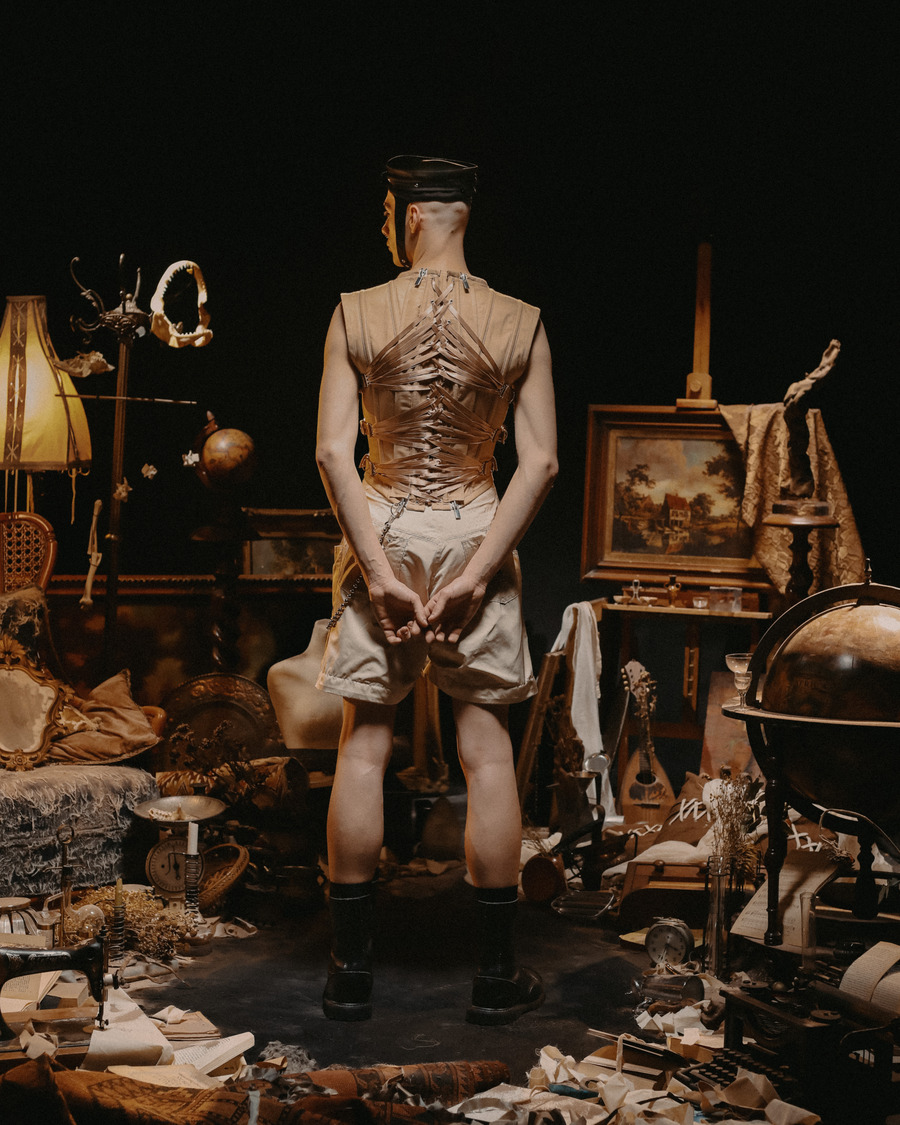 At its core, Epitelio is a raw and poetic exploration of self-perception. Inspired by the complexities of body dysmorphia and gender dysphoria, the collection translates these deeply personal experiences into bold sartorial statements. Imagine silhouettes that feel slightly “misplaced,” pieces structured to embrace—or sometimes constrain—the body, reflecting the struggles of aesthetic and gender conformity. Corsets and understructures shift between empowerment and restriction, playing with the dualities of oppression and liberation.