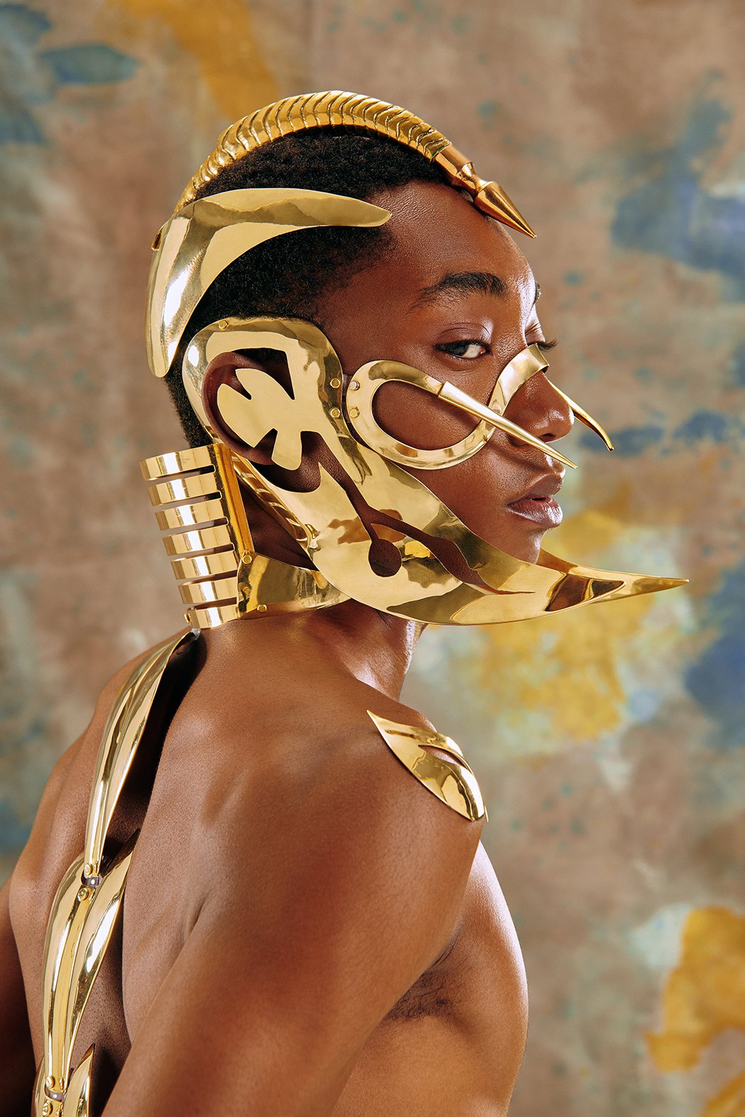 A KALTBLUT exclusive. Photography by Marc González. Art Direction by Manuel Albarran & Angel Cabezuelo. All Metal couture & Metal gear by Manuel Albarran. Model is Luis Mba at Elite Milan & Rock Men Model Managment Paris. Styling by Angel Cabezuelo. Make up & hair by Raquel Pintado.