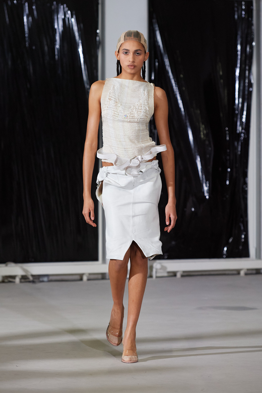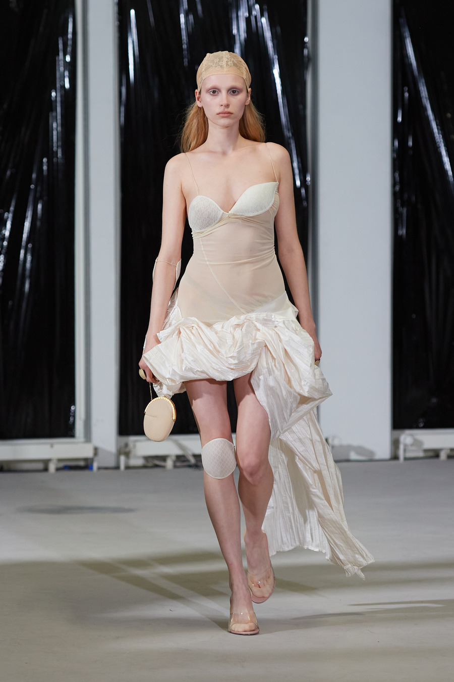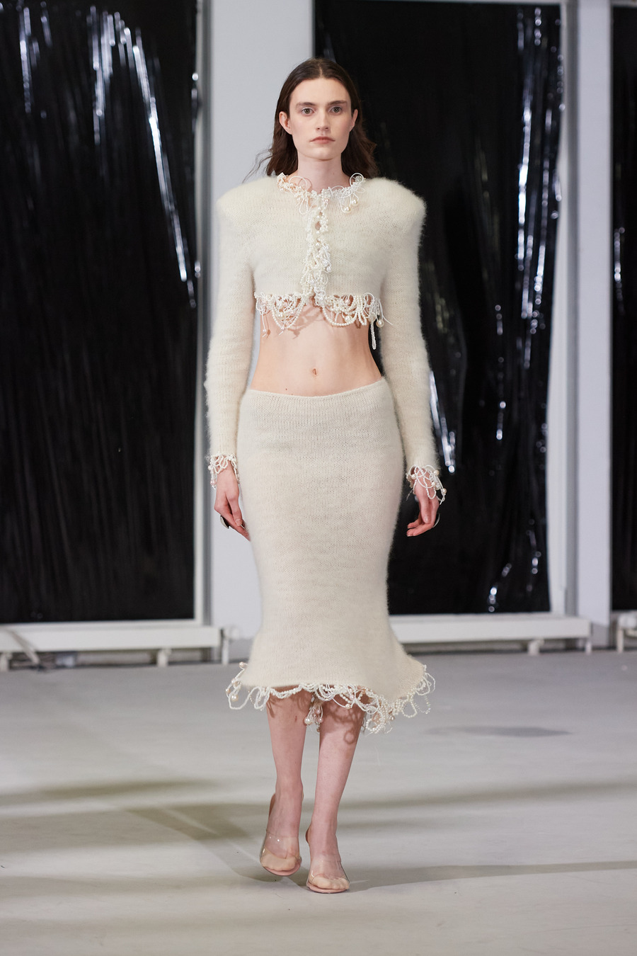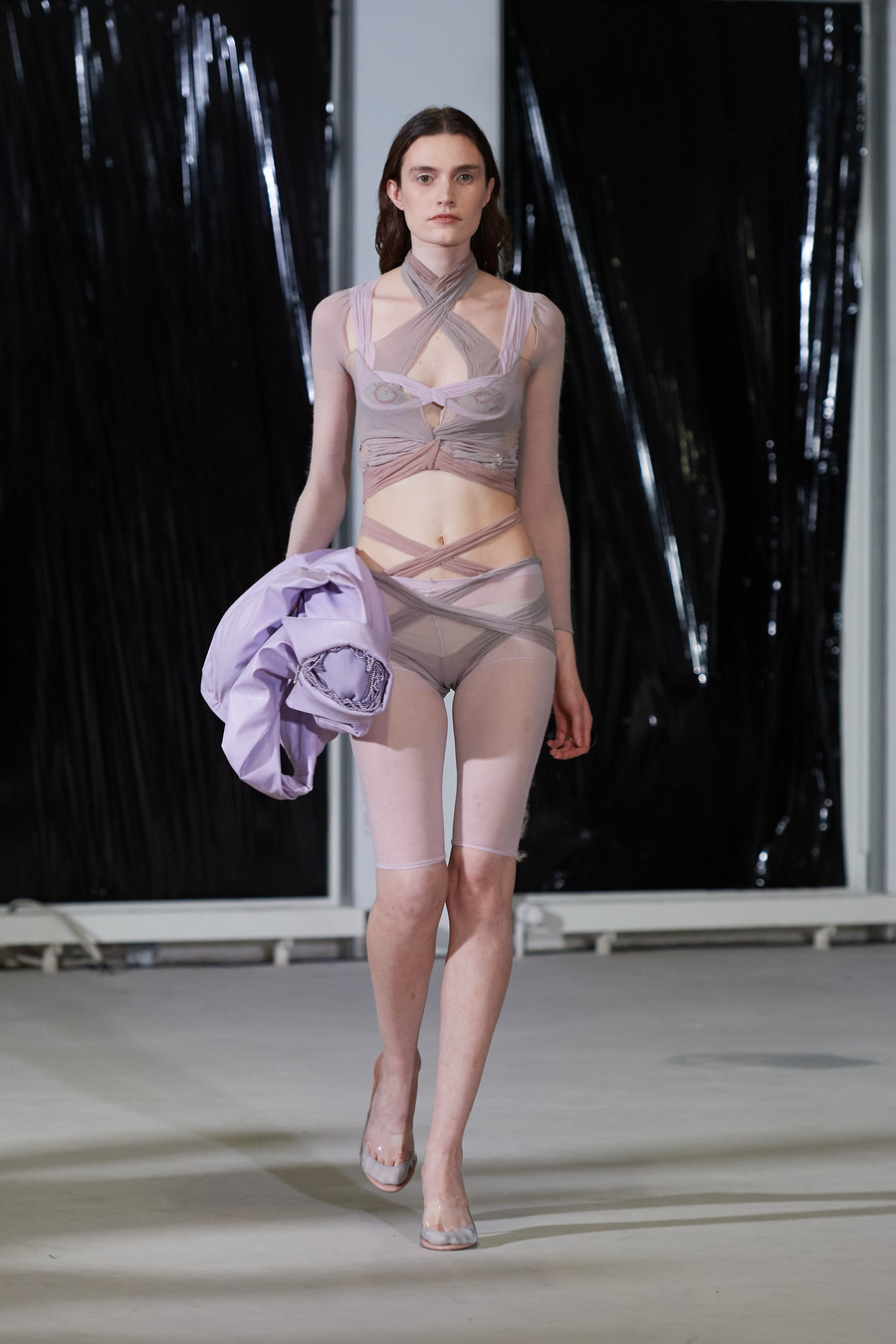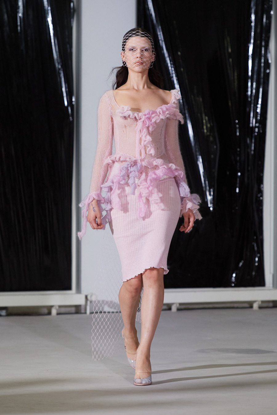 The collection’s textural tableau sees fabrics in a balletic push and pull, “trapping” one another to sculpt innovative textures and shapes. The silhouettes are an odyssey through delicately laced fittings to voluminous, fluffy dresses, and on to coats cunningly contorted.