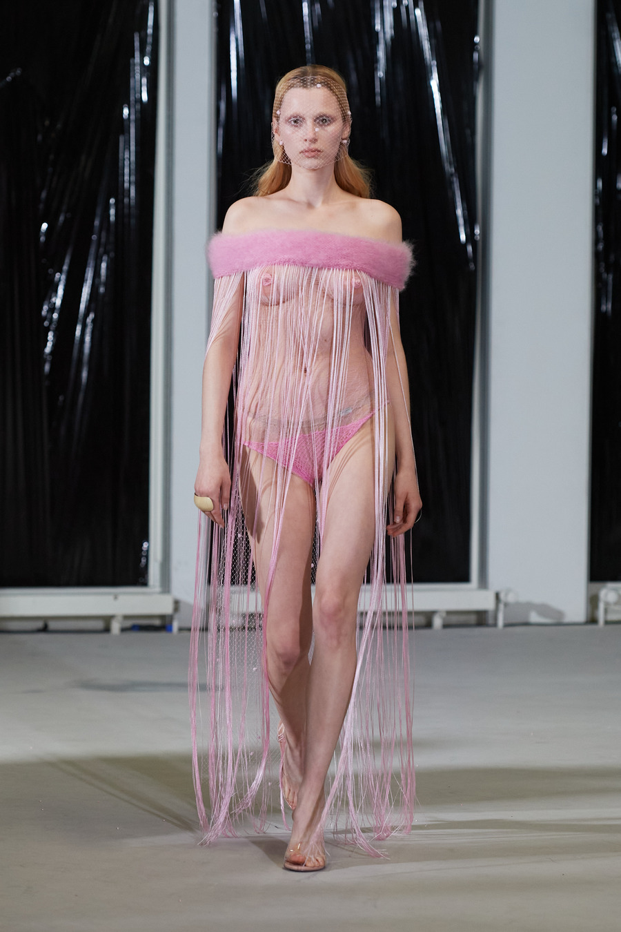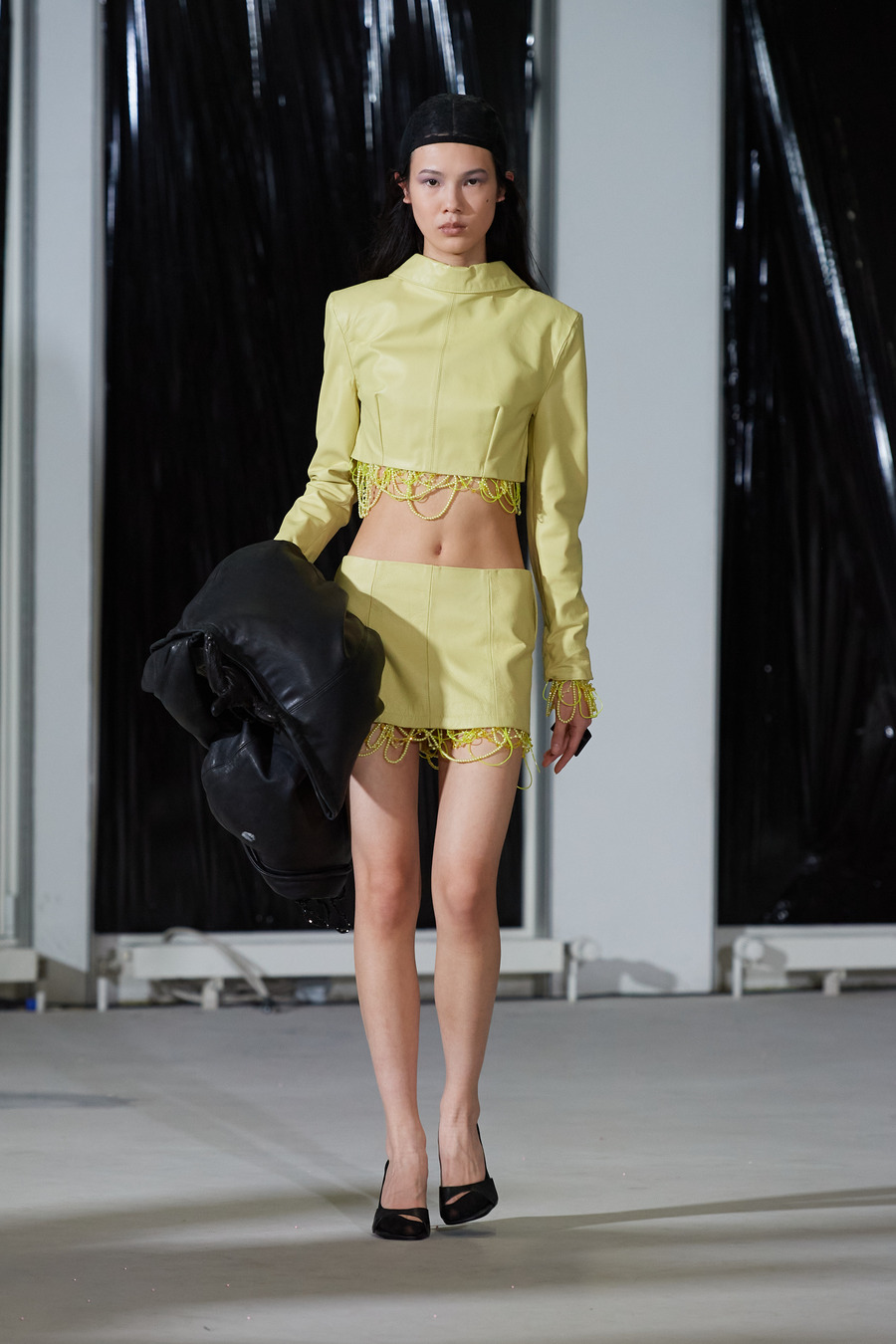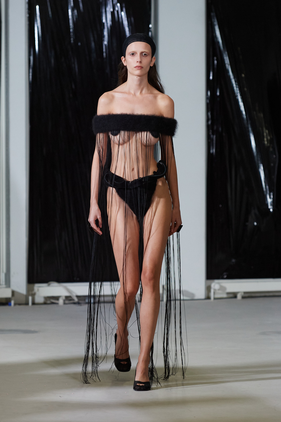 It was a stage set with black foil finery, reminiscent of a dystopia sprung from the designer’s deep well of inventiveness—a stark departure from her previously lighter expressions. This new collection toys with illusions distorts expected realities, and defies the conventional.