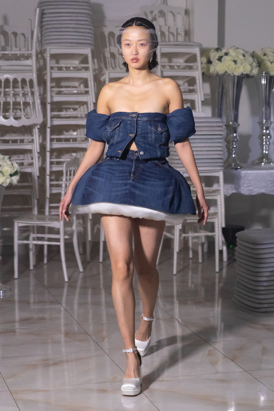 A defining element of the collection was its choice of materials. From reworked silk, wool and denim to yarn spun from vintage handkerchiefs, garments were crafted exclusively from second-hand textiles and transformed into contemporary Haute Couture through sophisticated handiwork.