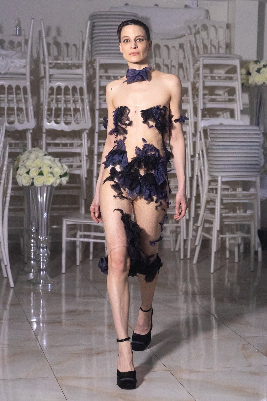 From second-skin dresses to voluminous drapery, silhouettes oscillated between fragile and pompous, giving a self-conscious nod to old-established design houses. Discerning references to a bygone era of couture were echoed by a colour palette of florid pastels broken up by oily blacks and the choice of location: a grandiose ballroom in all-white, usually reserved for wedding celebrations.