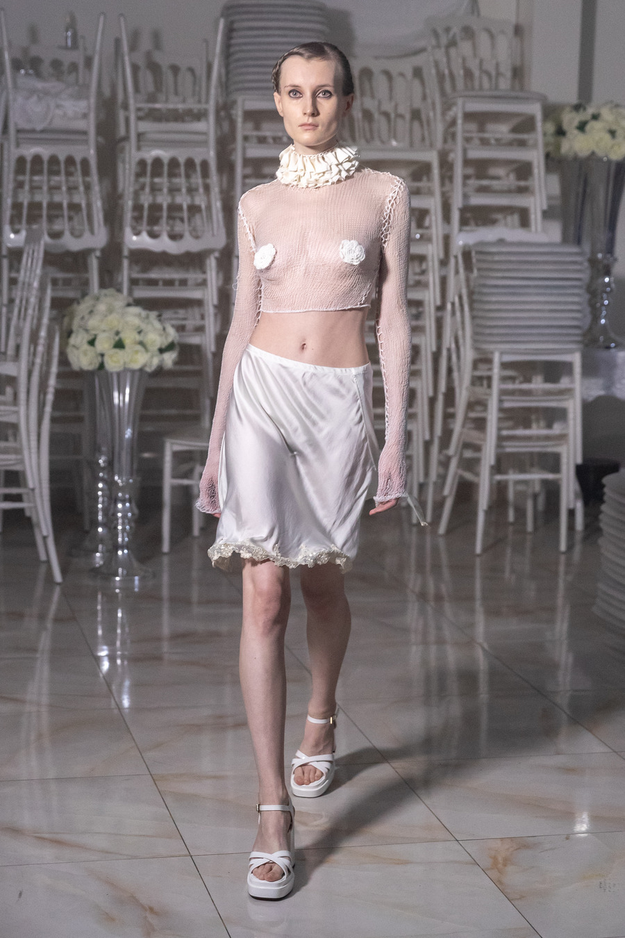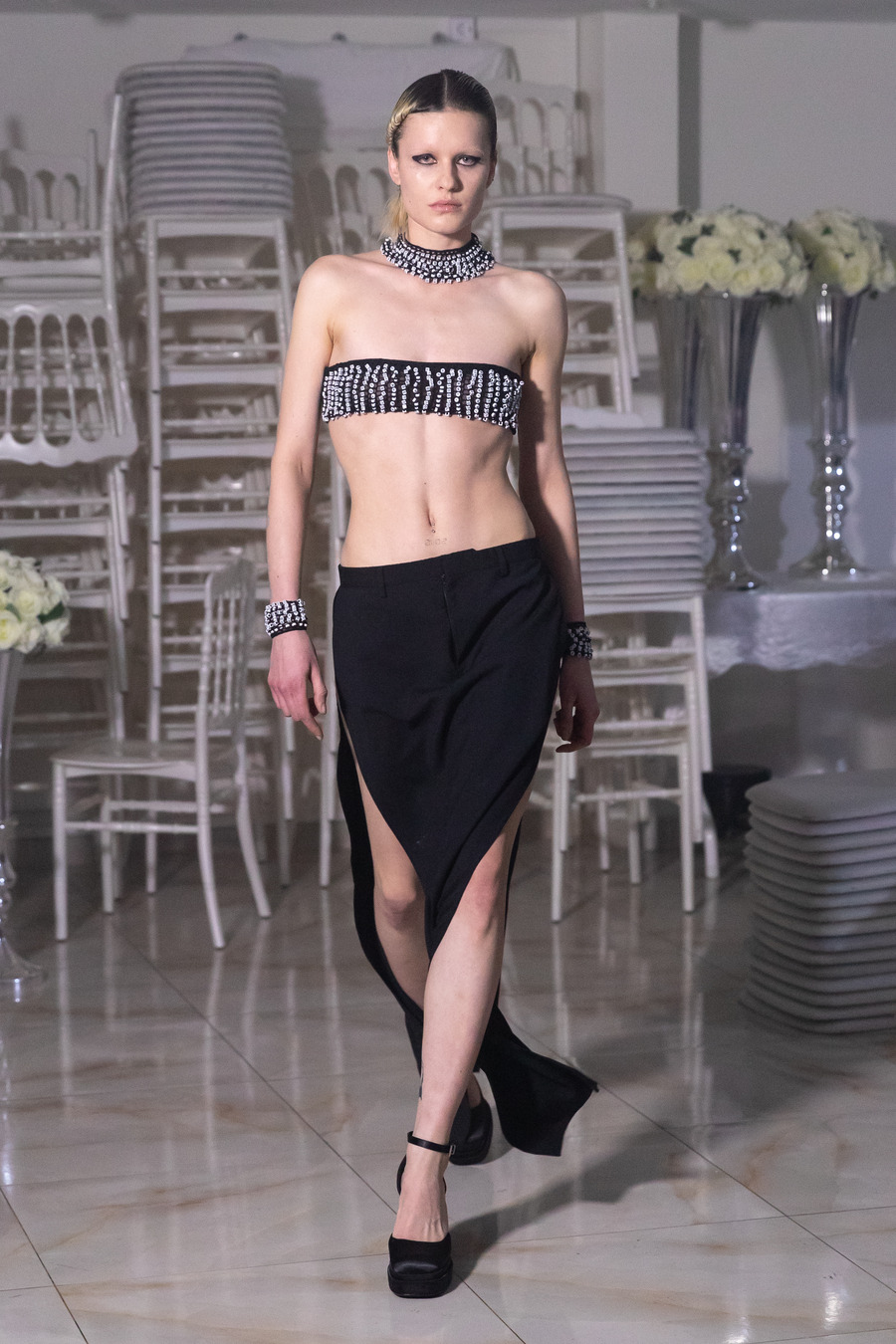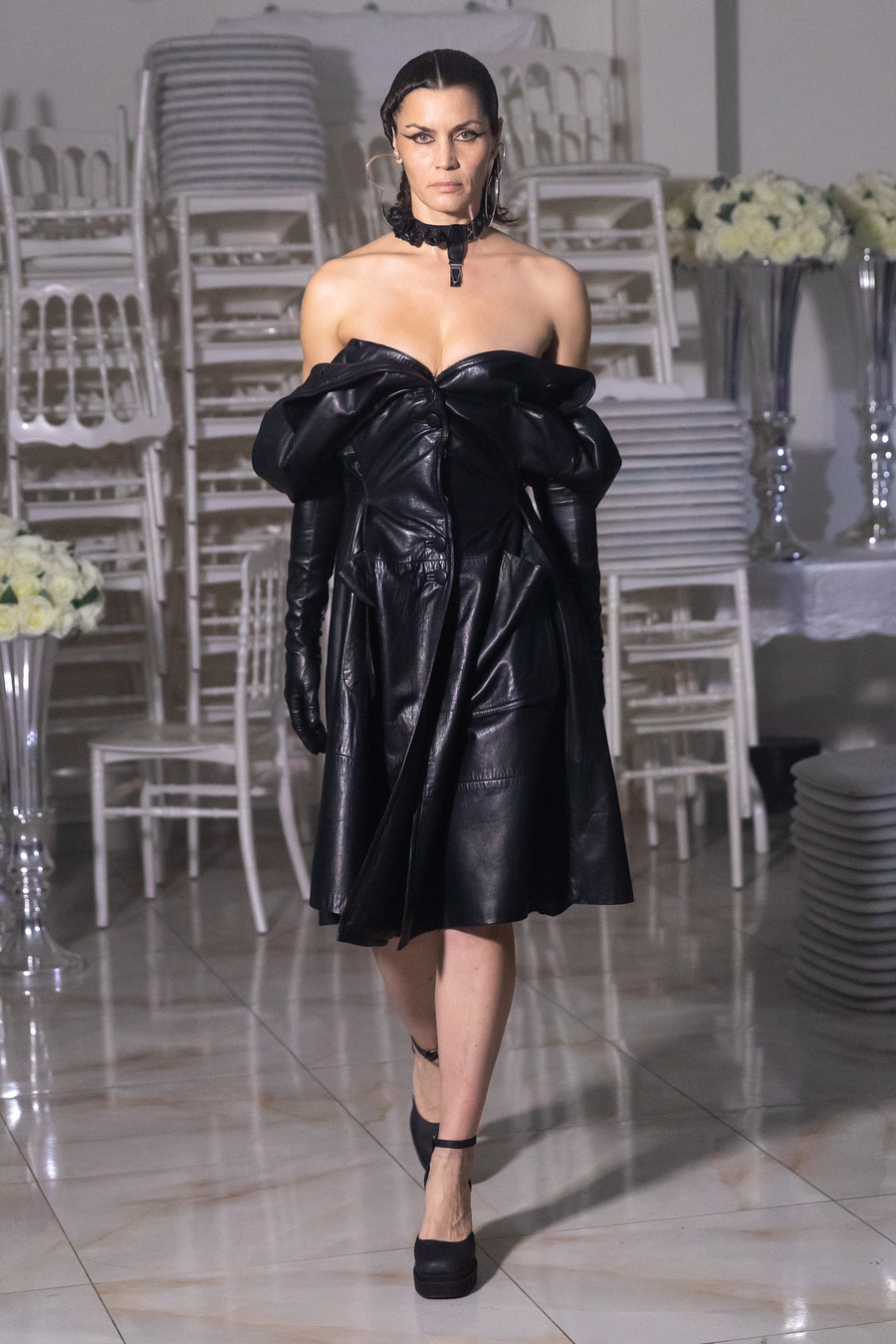 From second-skin dresses to voluminous drapery, silhouettes oscillated between fragile and pompous, giving a self-conscious nod to old-established design houses. Discerning references to a bygone era of couture were echoed by a colour palette of florid pastels broken up by oily blacks and the choice of location: a grandiose ballroom in all-white, usually reserved for wedding celebrations.