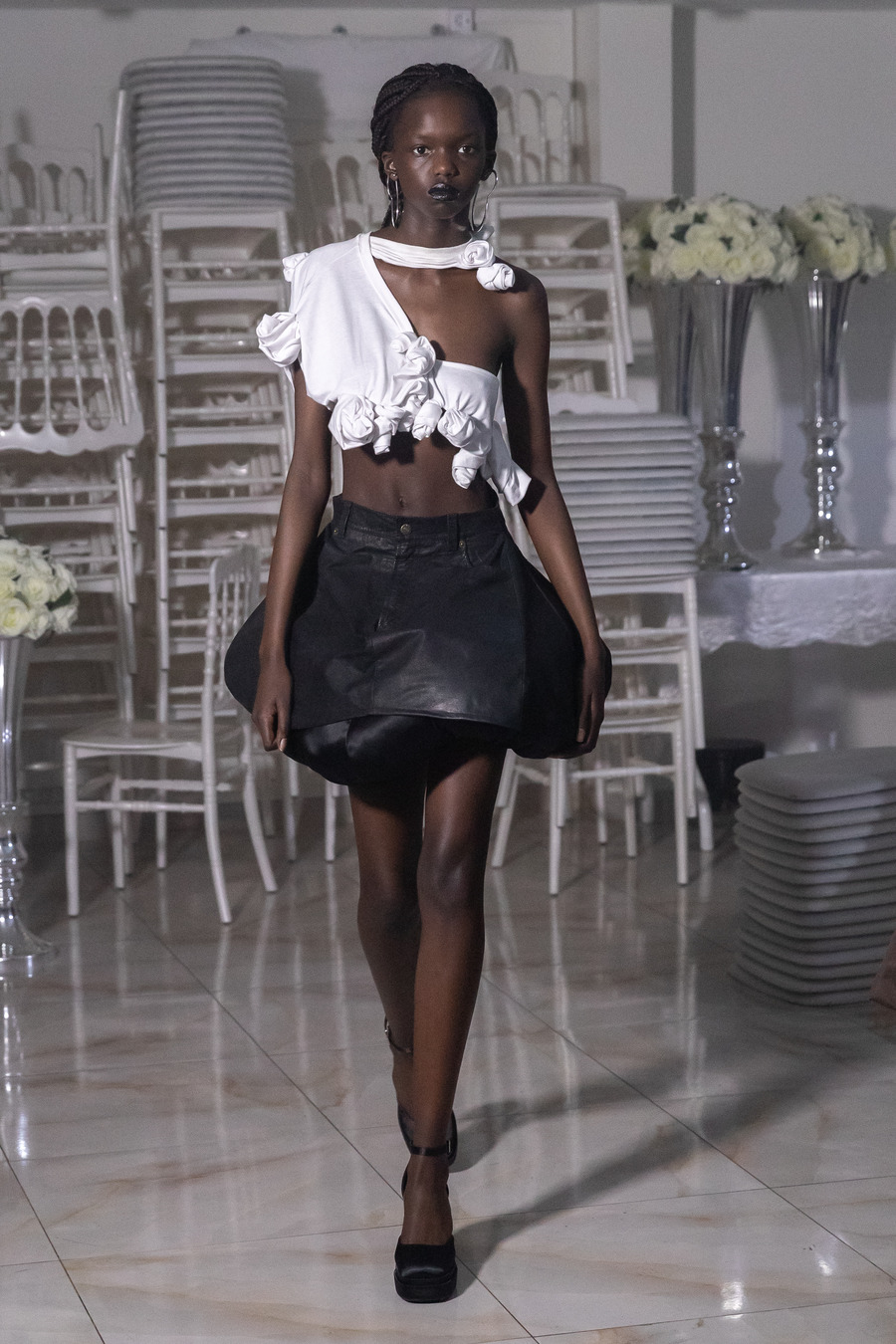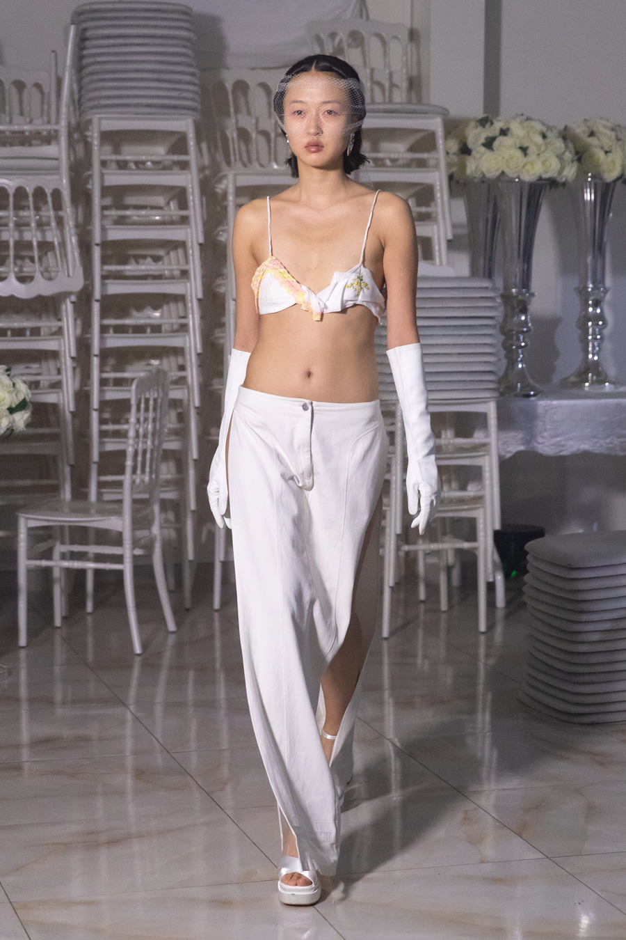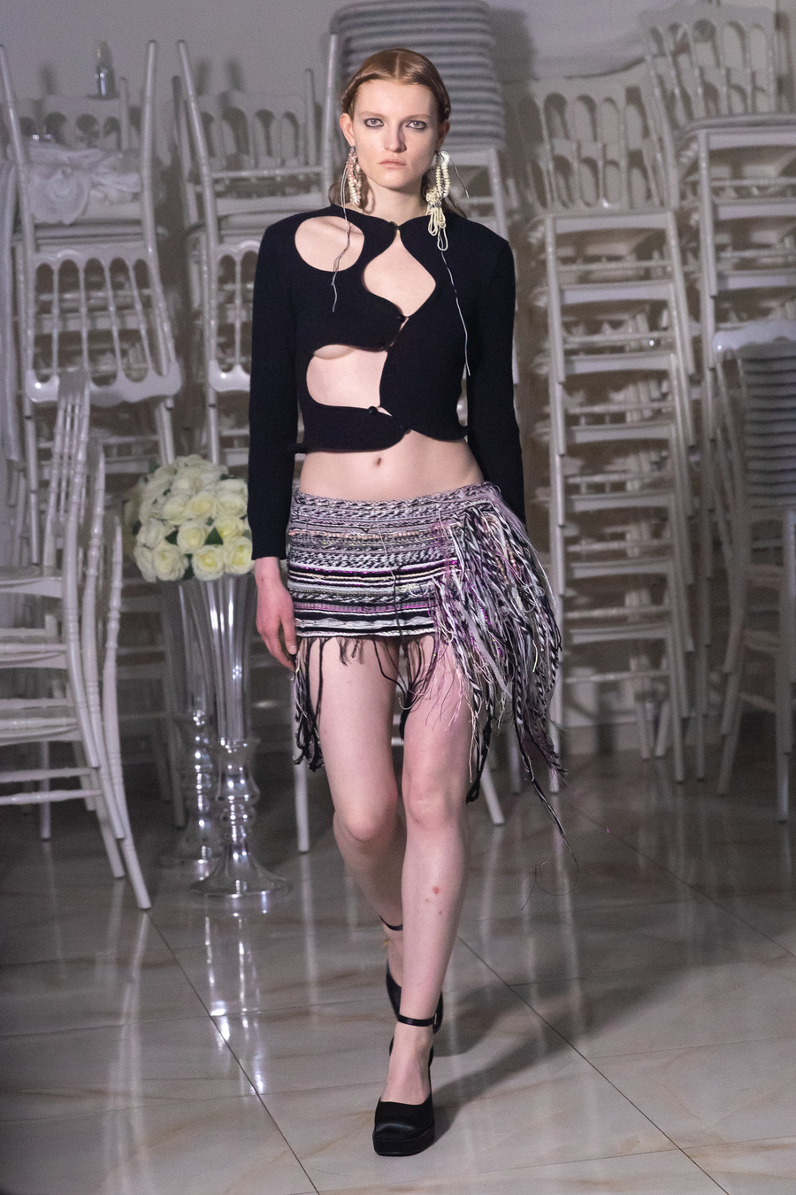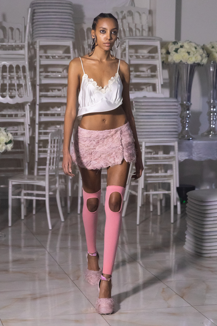 From second-skin dresses to voluminous drapery, silhouettes oscillated between fragile and pompous, giving a self-conscious nod to old-established design houses. Discerning references to a bygone era of couture were echoed by a colour palette of florid pastels broken up by oily blacks and the choice of location: a grandiose ballroom in all-white, usually reserved for wedding celebrations.