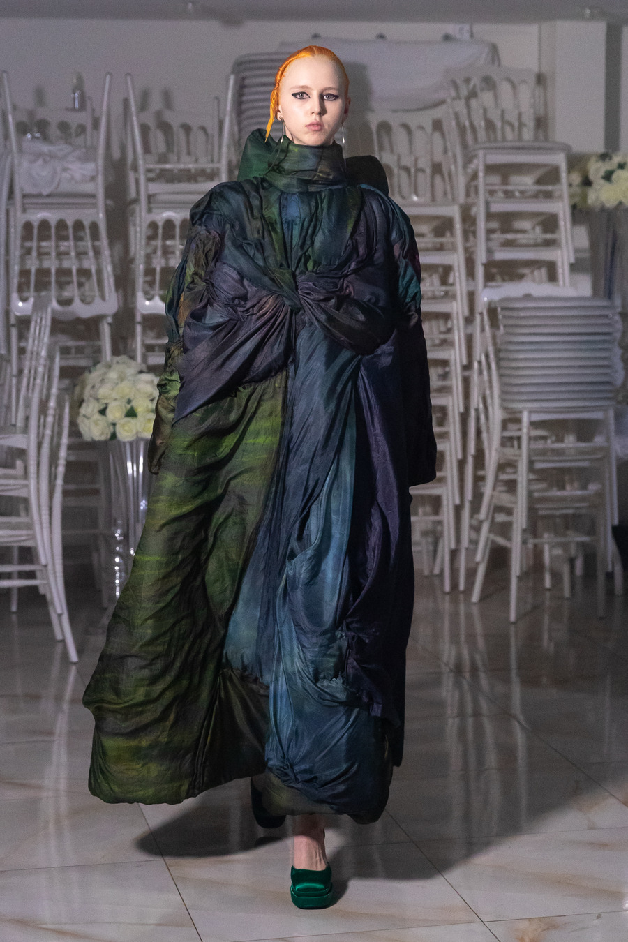 A defining element of the collection was its choice of materials. From reworked silk, wool and denim to yarn spun from vintage handkerchiefs, garments were crafted exclusively from second-hand textiles and transformed into contemporary Haute Couture through sophisticated handiwork.