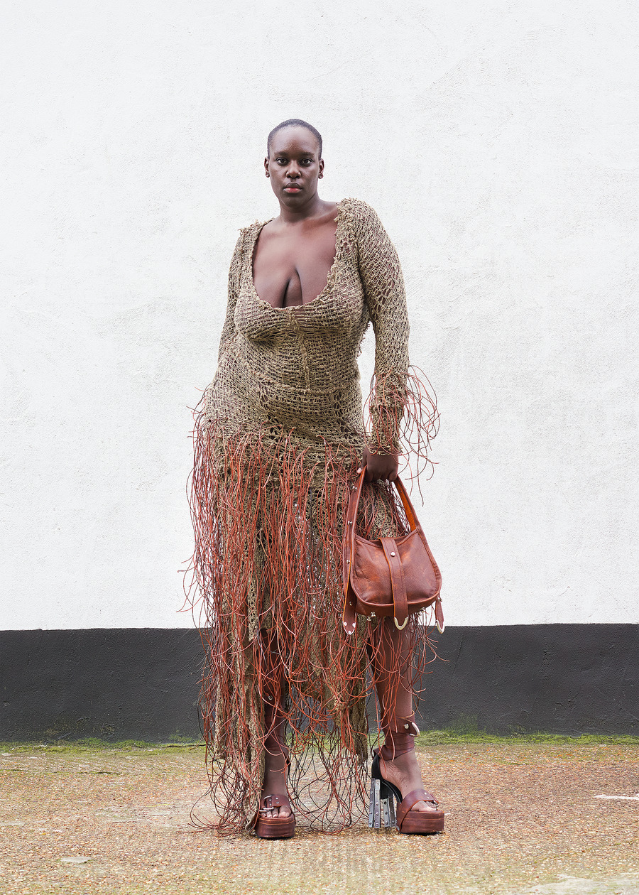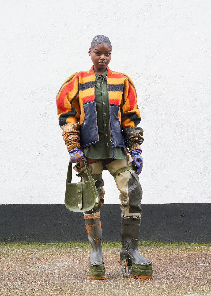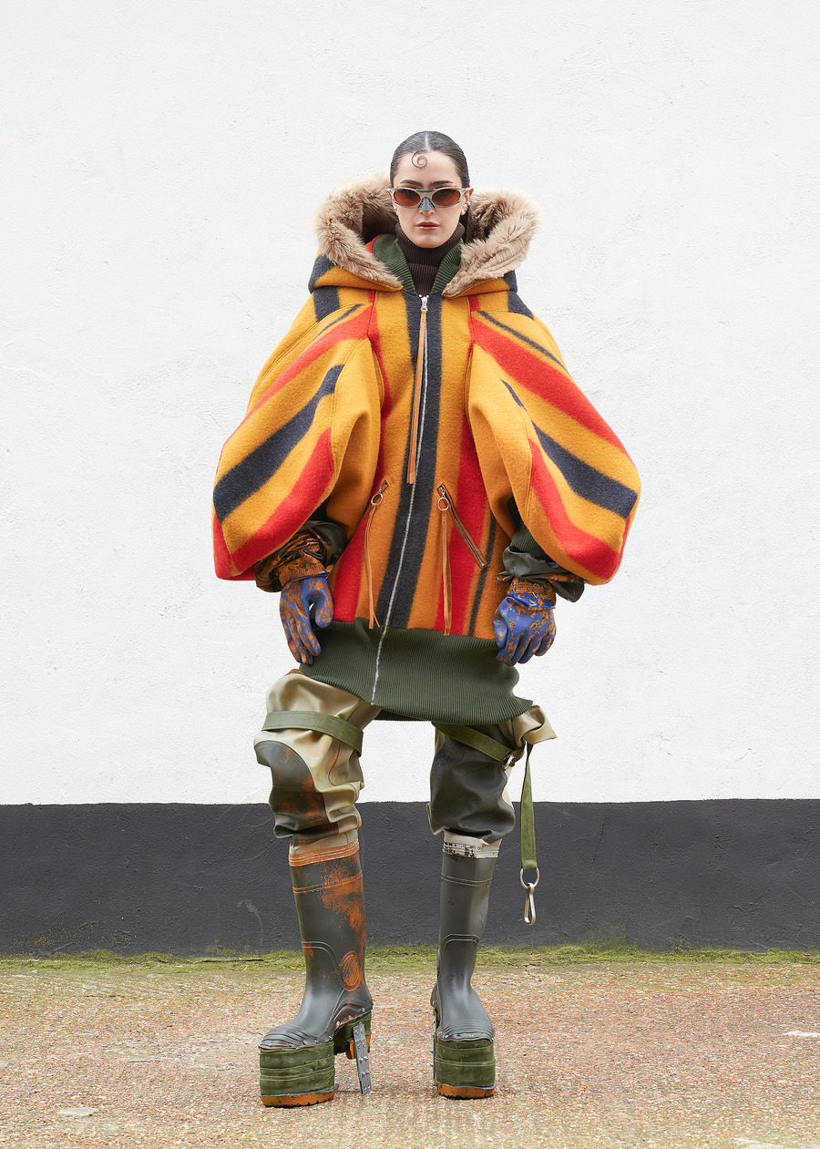 Not content to let the past inform only the fabric, the designer’s innovation shines through the transformation of heavy wool horse blankets into sculptural garments—pieces that reimagine the functional into the abstract. Silhouettes, inspired by Hede Bühl’s evocative sculptures, play with structure and movement, allowing for an organic fit that feels both intentional and fluid.