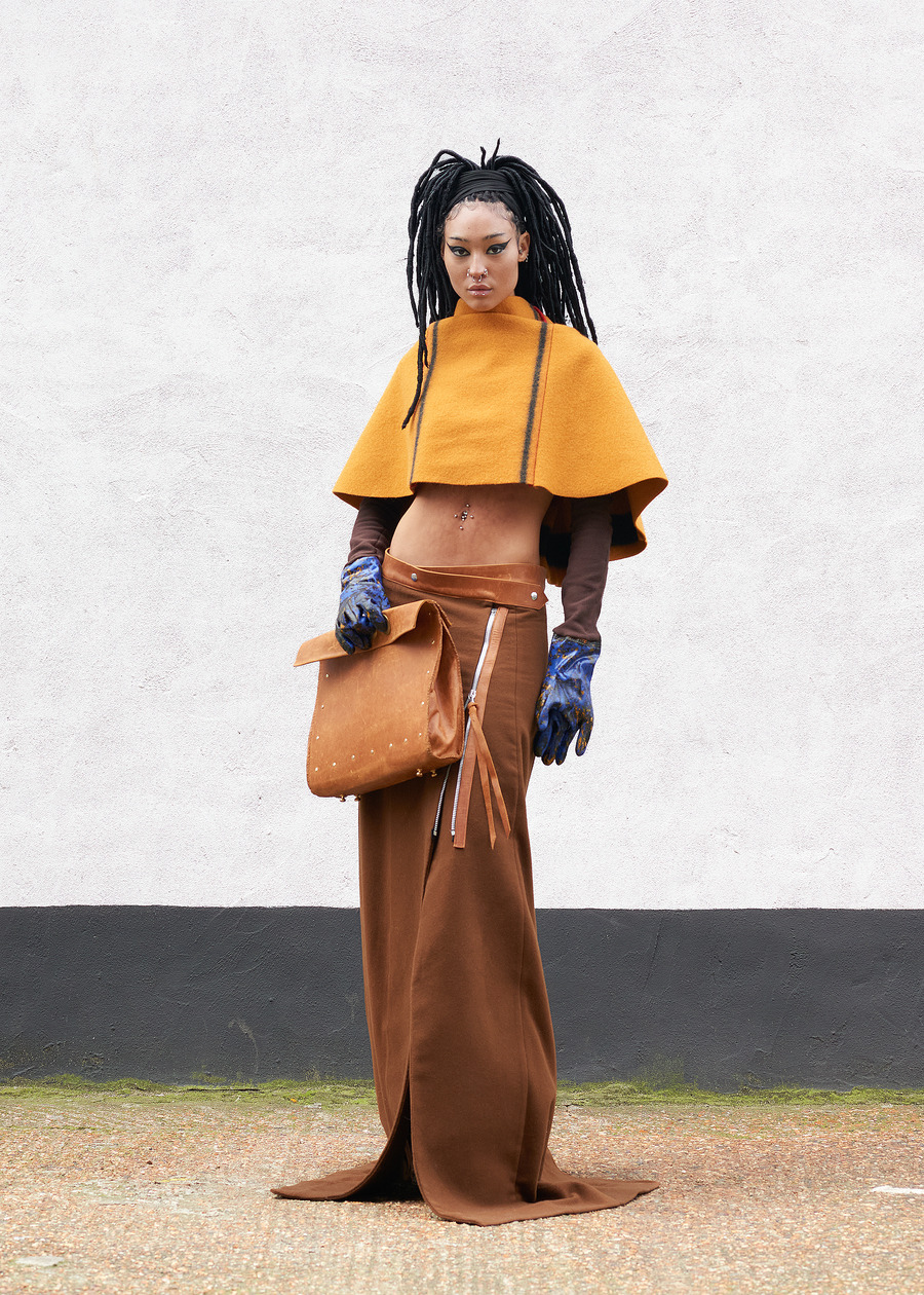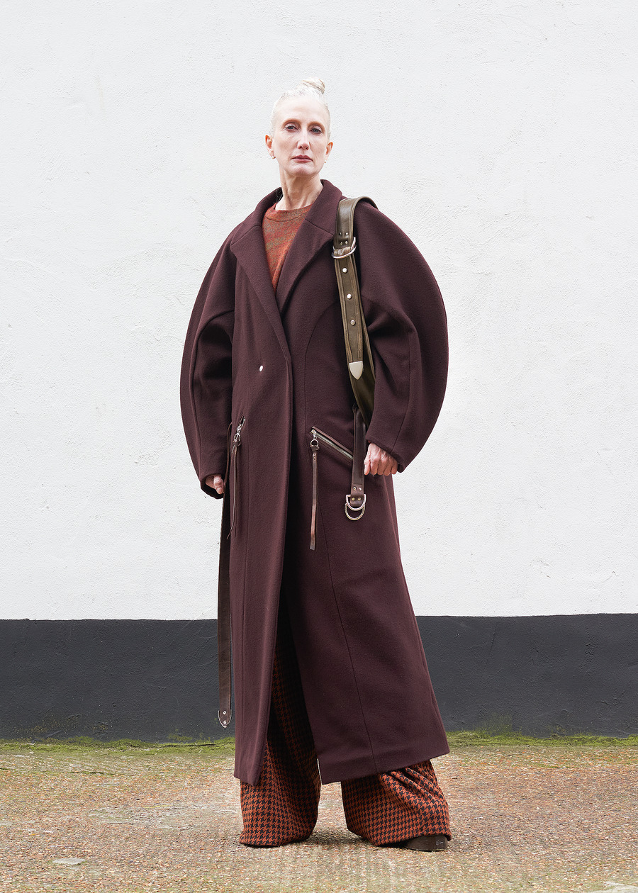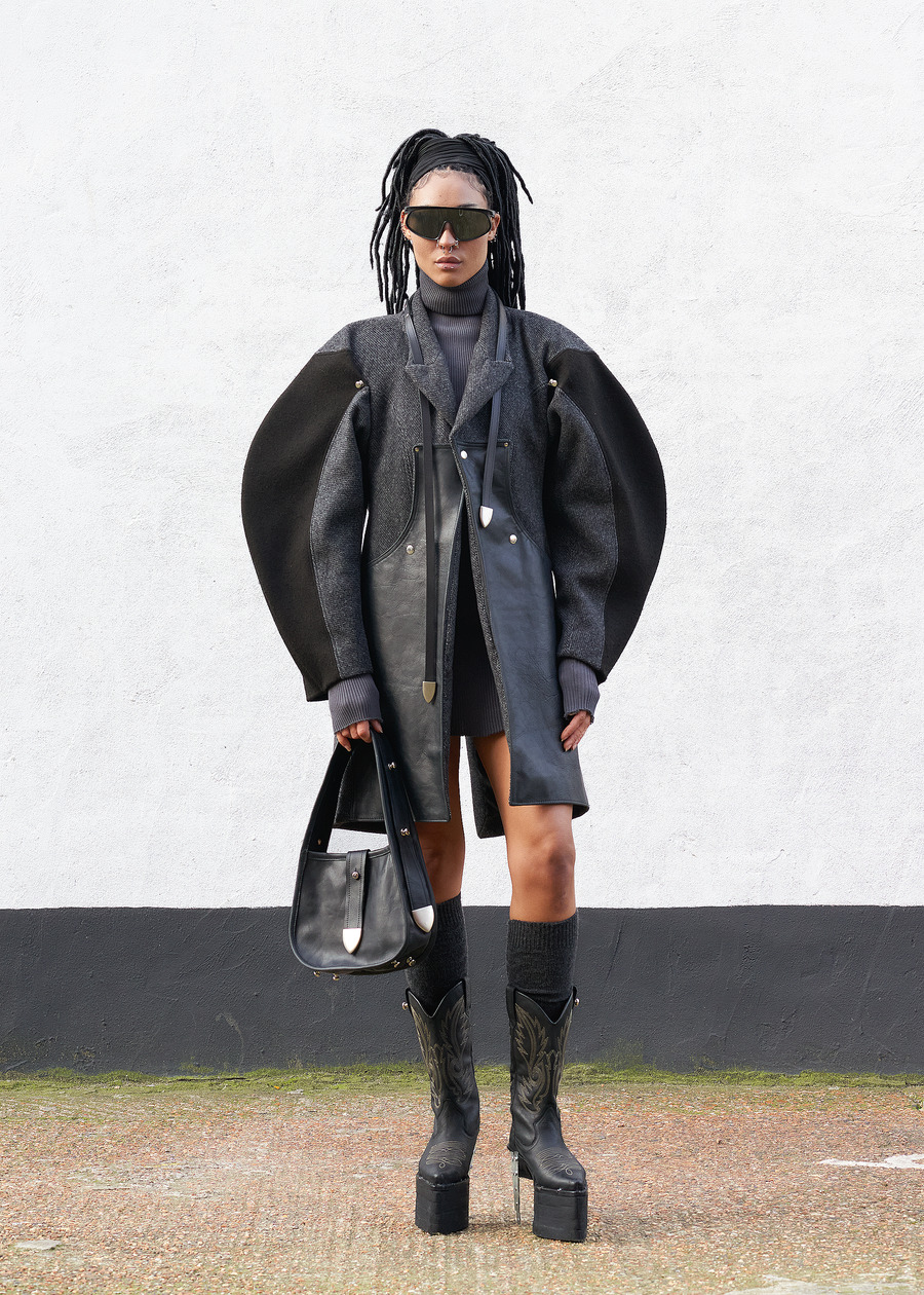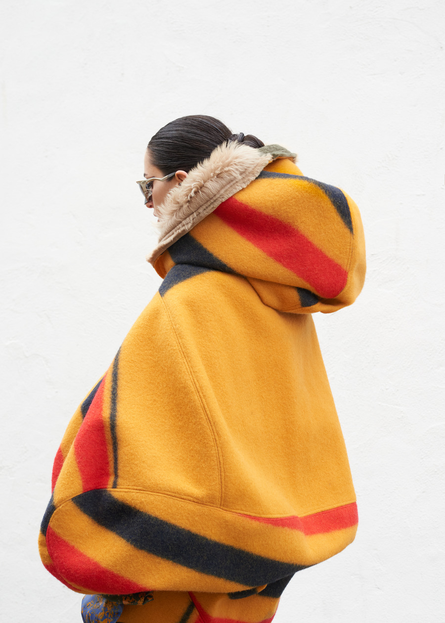 Not content to let the past inform only the fabric, the designer’s innovation shines through the transformation of heavy wool horse blankets into sculptural garments—pieces that reimagine the functional into the abstract. Silhouettes, inspired by Hede Bühl’s evocative sculptures, play with structure and movement, allowing for an organic fit that feels both intentional and fluid.