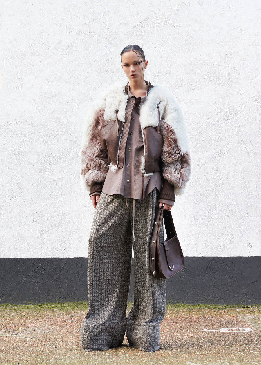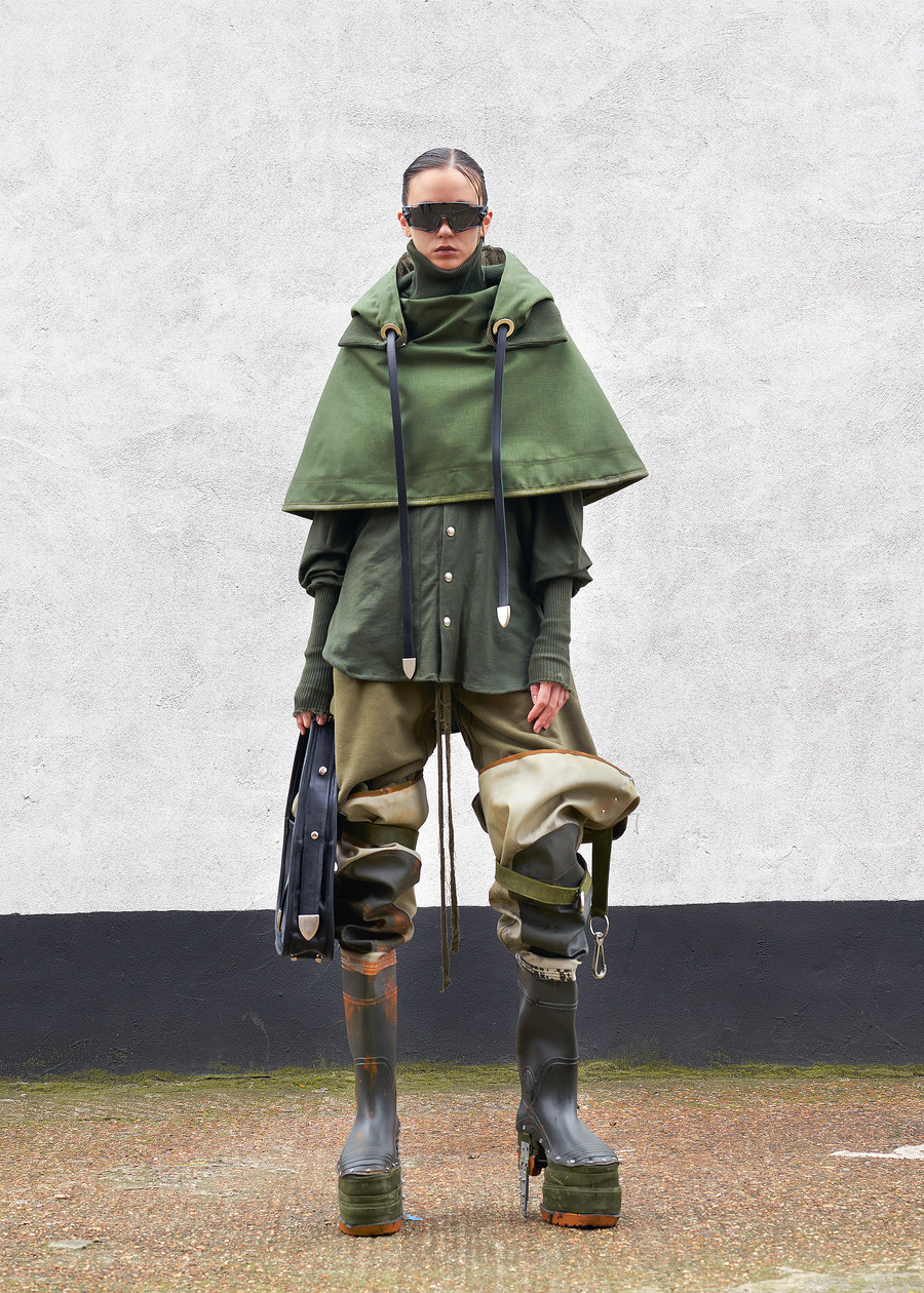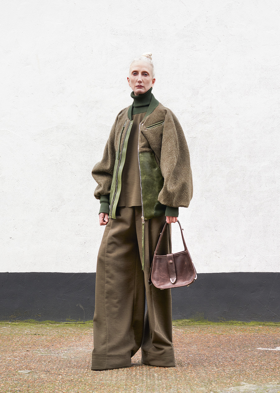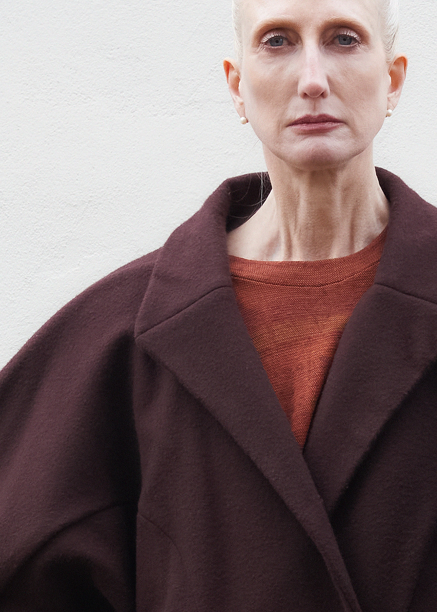 Not content to let the past inform only the fabric, the designer’s innovation shines through the transformation of heavy wool horse blankets into sculptural garments—pieces that reimagine the functional into the abstract. Silhouettes, inspired by Hede Bühl’s evocative sculptures, play with structure and movement, allowing for an organic fit that feels both intentional and fluid.