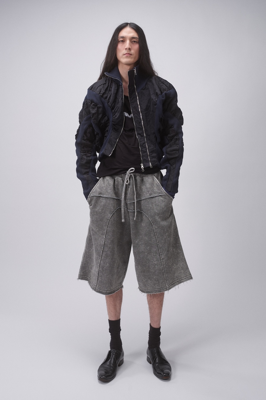 Material innovation shines at the heart of this collection. For the first time, LUEDER introduces pinstriped suiting, seamlessly drawing from a heritage steeped in bespoke tailoring. Yet, in a refreshing twist, these fabrics are used in a relaxed, unexpected manner—elevating the pinstripe from mere tradition into a symbol of nuanced formality. This season also boasts a striking collaboration with an Italian mill that supplied an avant-garde, lightweight flocked nylon in camouflage, adding a futuristic edge and sharp contrast to the overall aesthetic.