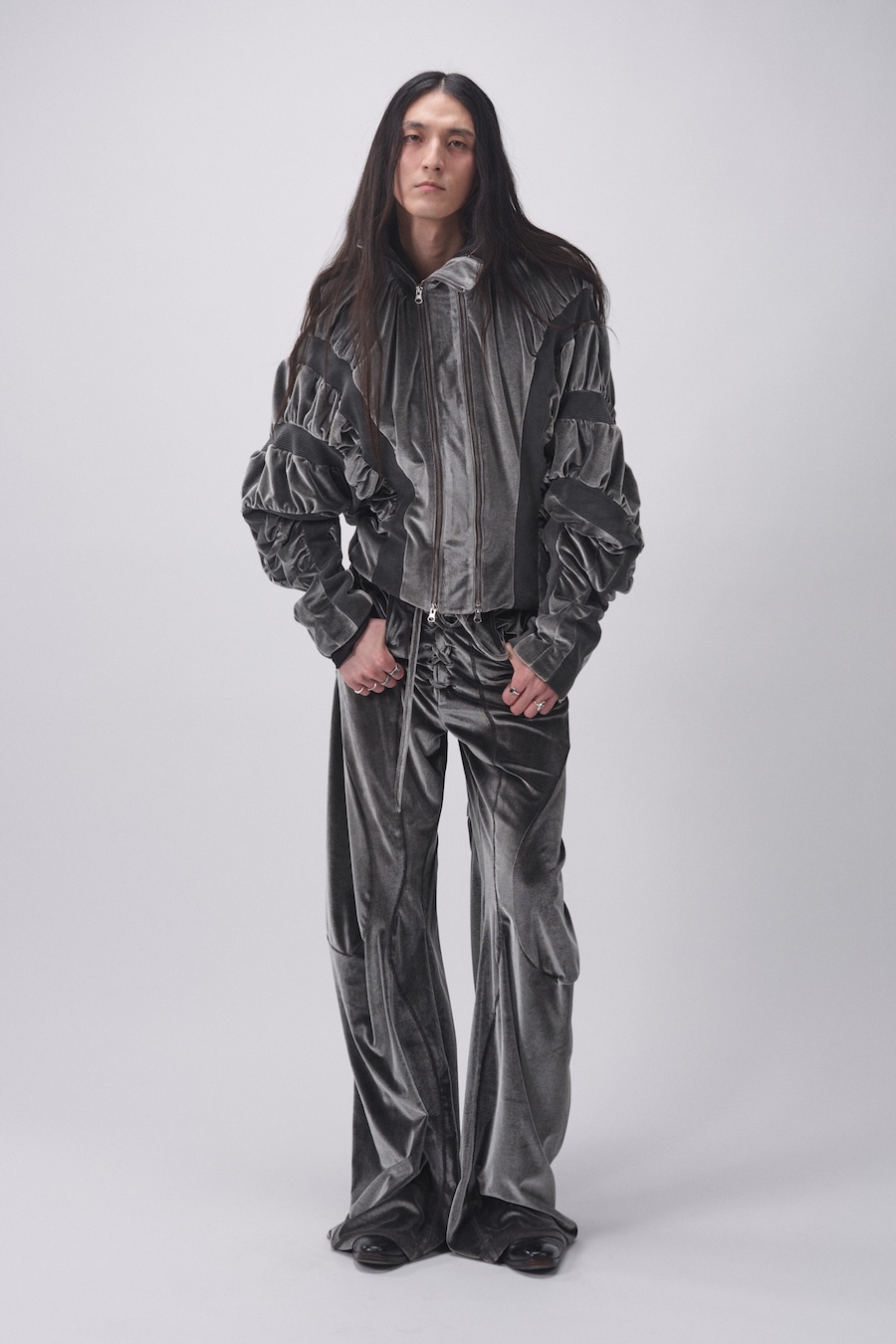 Material innovation shines at the heart of this collection. For the first time, LUEDER introduces pinstriped suiting, seamlessly drawing from a heritage steeped in bespoke tailoring. Yet, in a refreshing twist, these fabrics are used in a relaxed, unexpected manner—elevating the pinstripe from mere tradition into a symbol of nuanced formality. This season also boasts a striking collaboration with an Italian mill that supplied an avant-garde, lightweight flocked nylon in camouflage, adding a futuristic edge and sharp contrast to the overall aesthetic.
