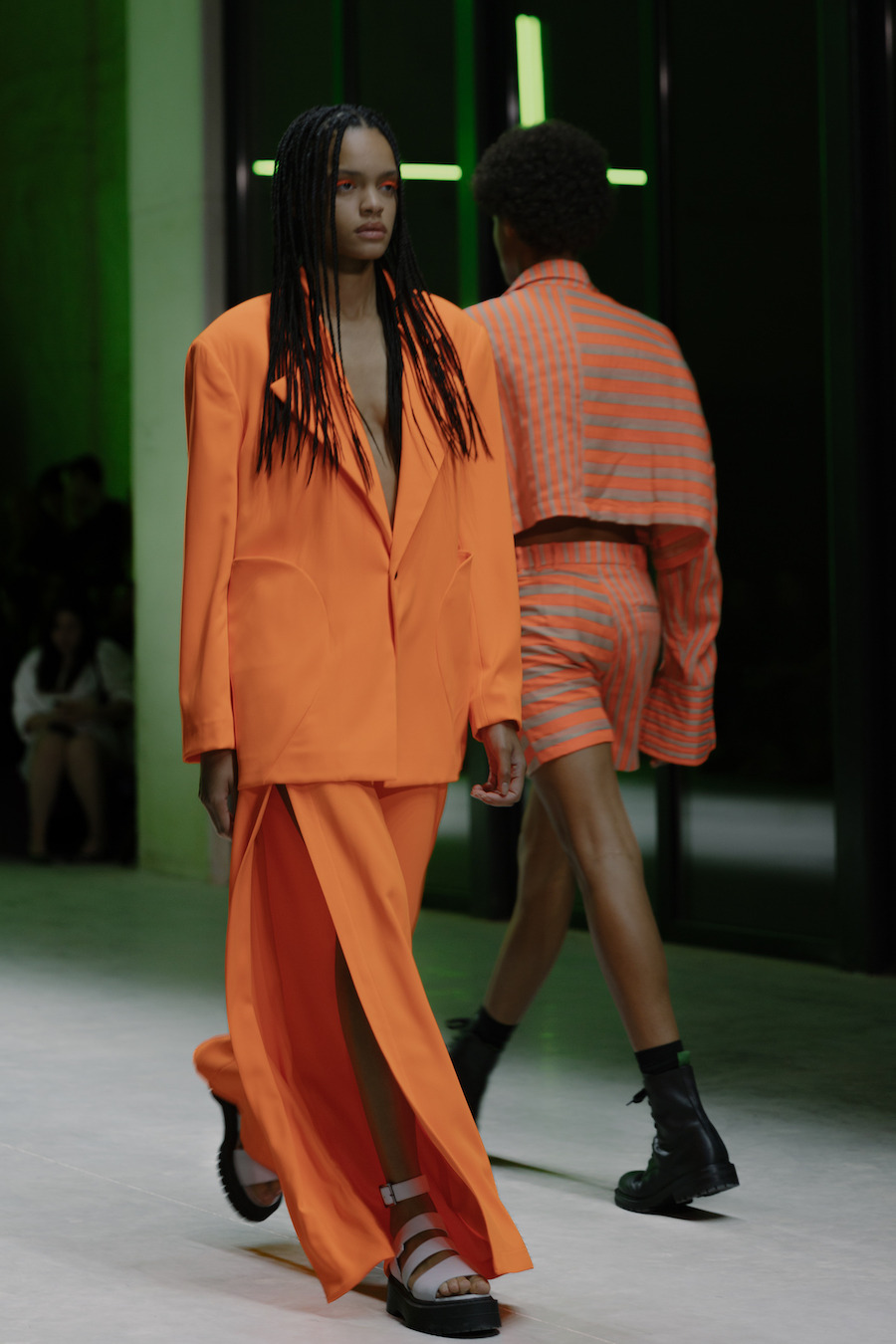 The edges and structures of the buildings, suggest oversized and straight silhouettes, as do the details worked on the pieces. The colours gain light and shine, with white, grey and fluor orange in line and striped patterns, worked over materials such as brocade, taffeta, twill and poplin.