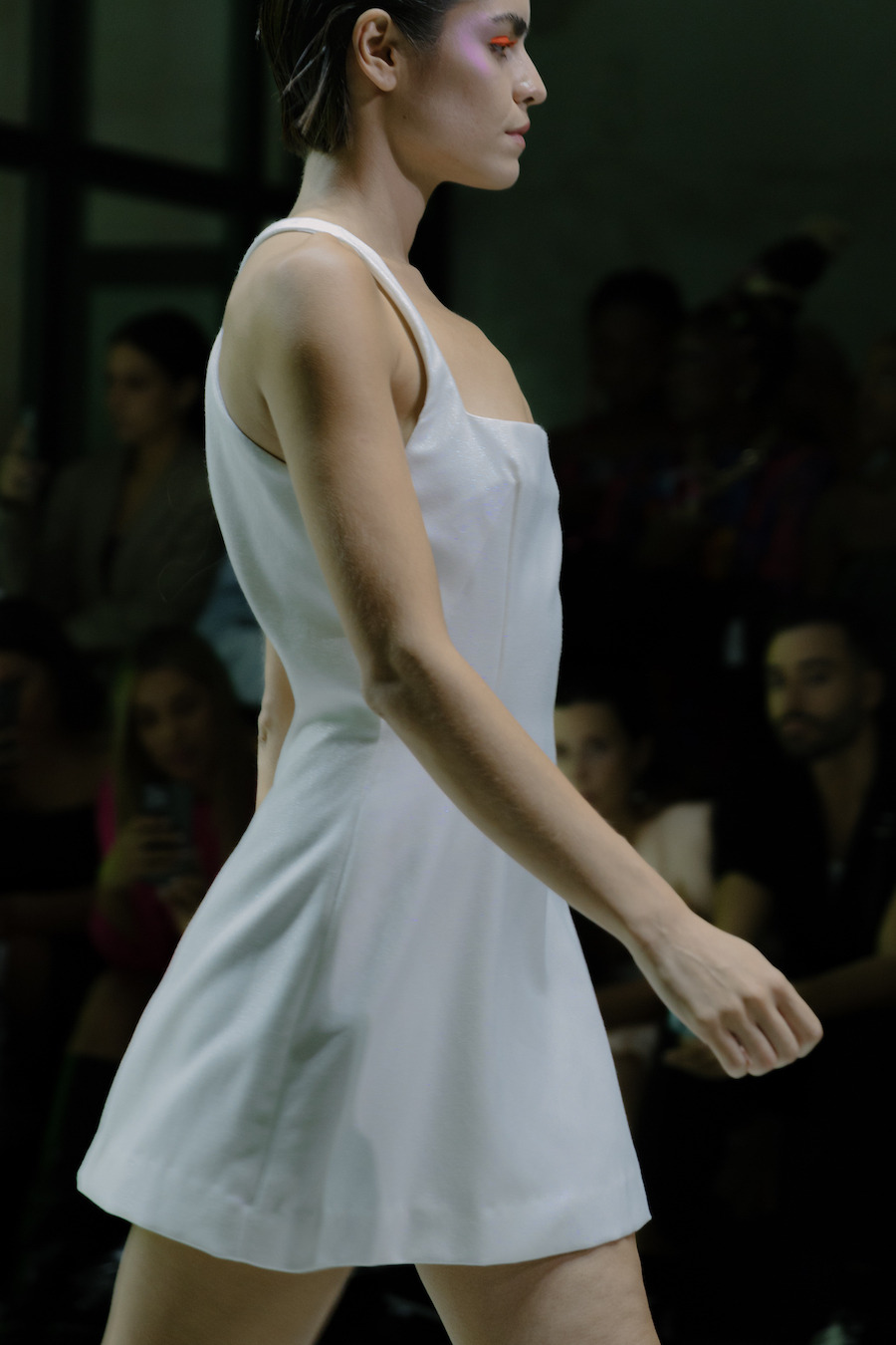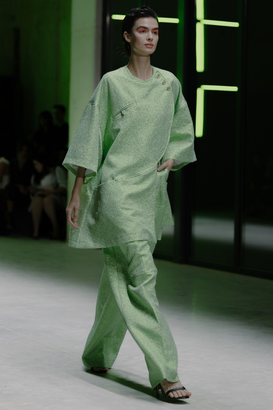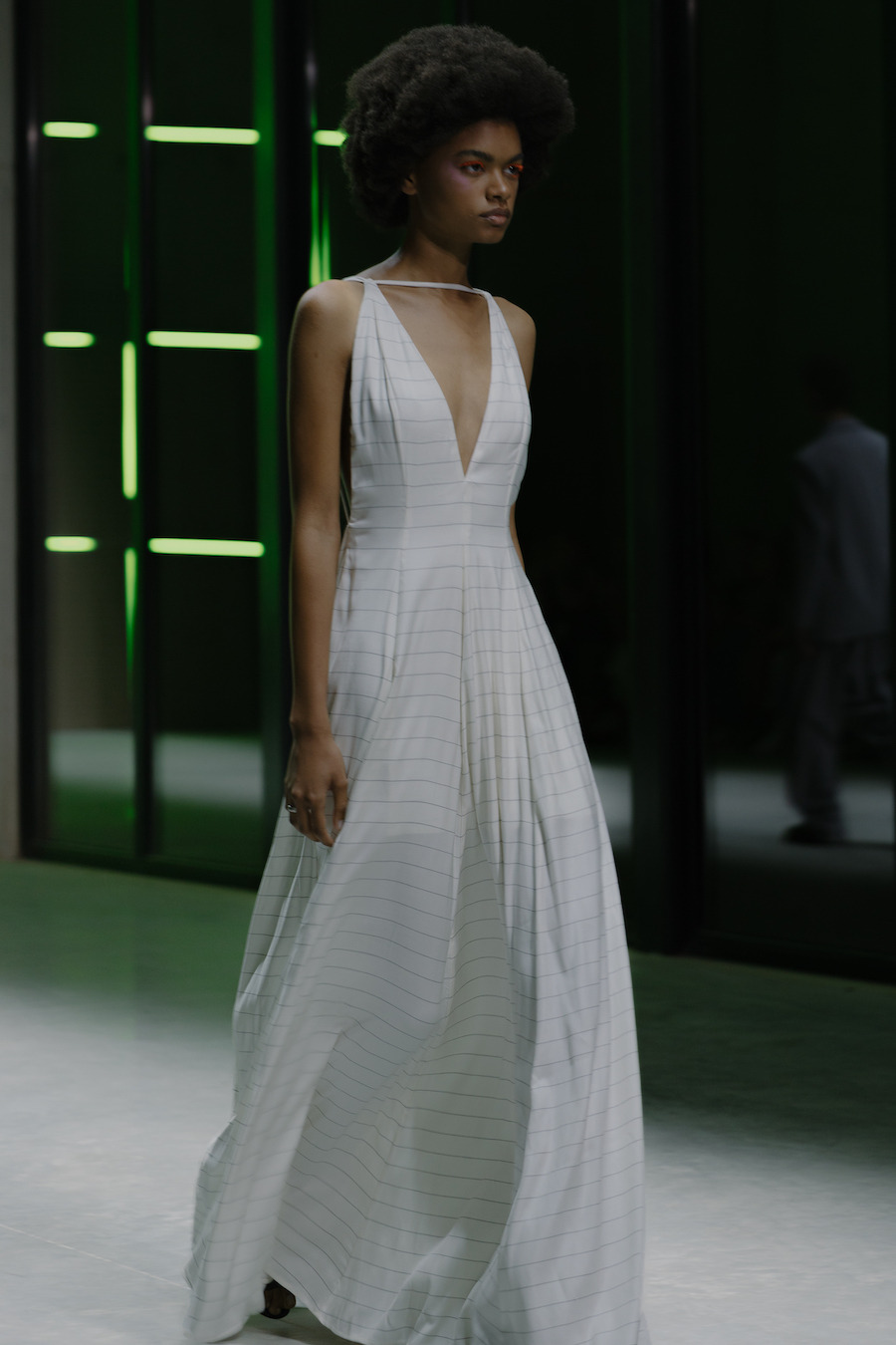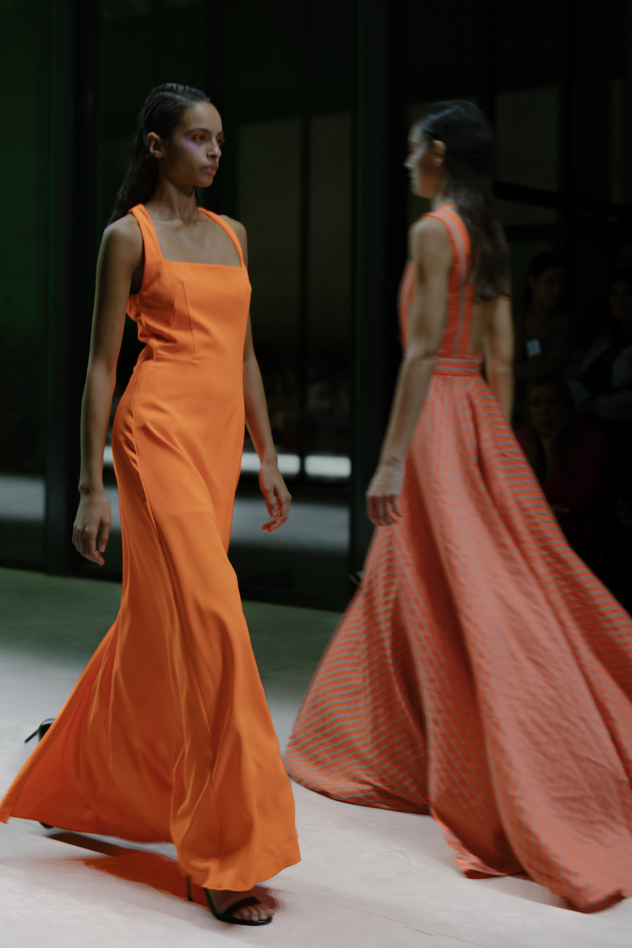 The edges and structures of the buildings, suggest oversized and straight silhouettes, as do the details worked on the pieces. The colours gain light and shine, with white, grey and fluor orange in line and striped patterns, worked over materials such as brocade, taffeta, twill and poplin.