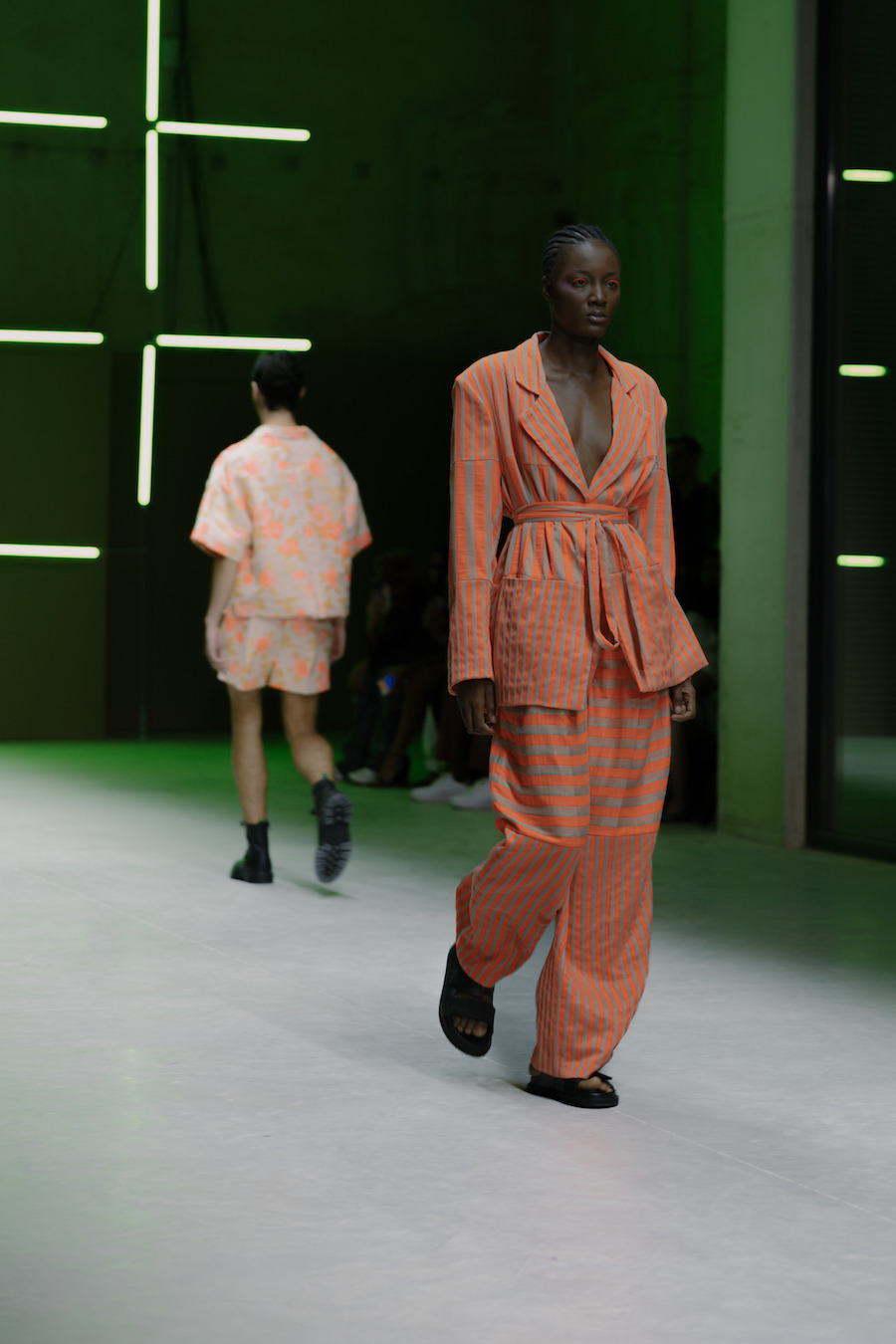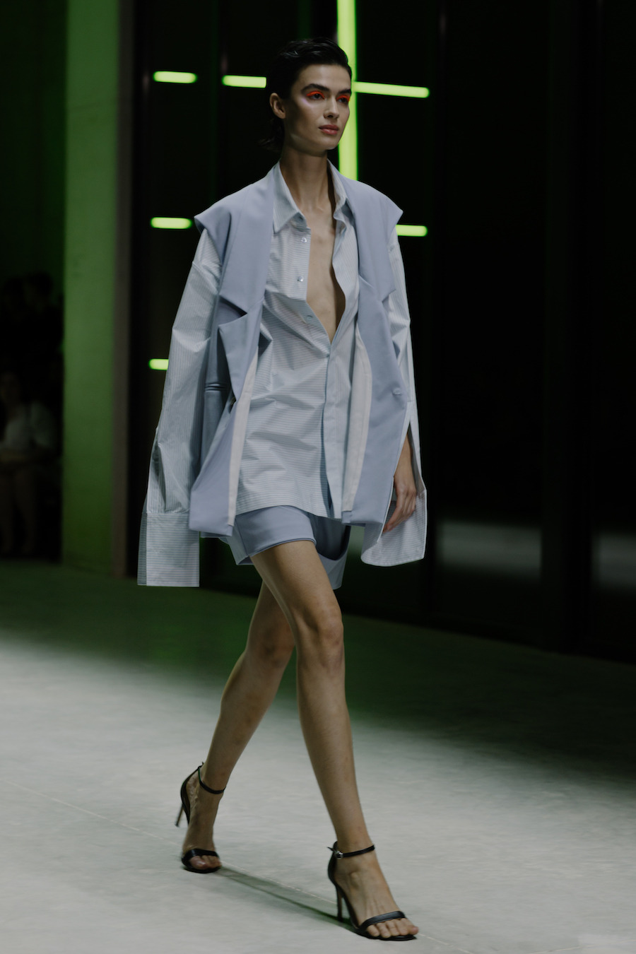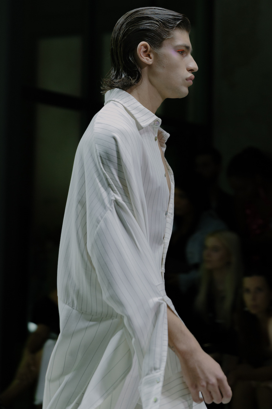 The edges and structures of the buildings, suggest oversized and straight silhouettes, as do the details worked on the pieces. The colours gain light and shine, with white, grey and fluor orange in line and striped patterns, worked over materials such as brocade, taffeta, twill and poplin.
