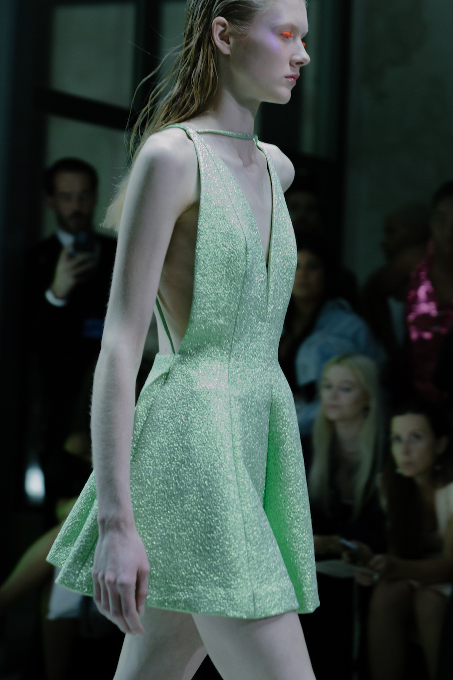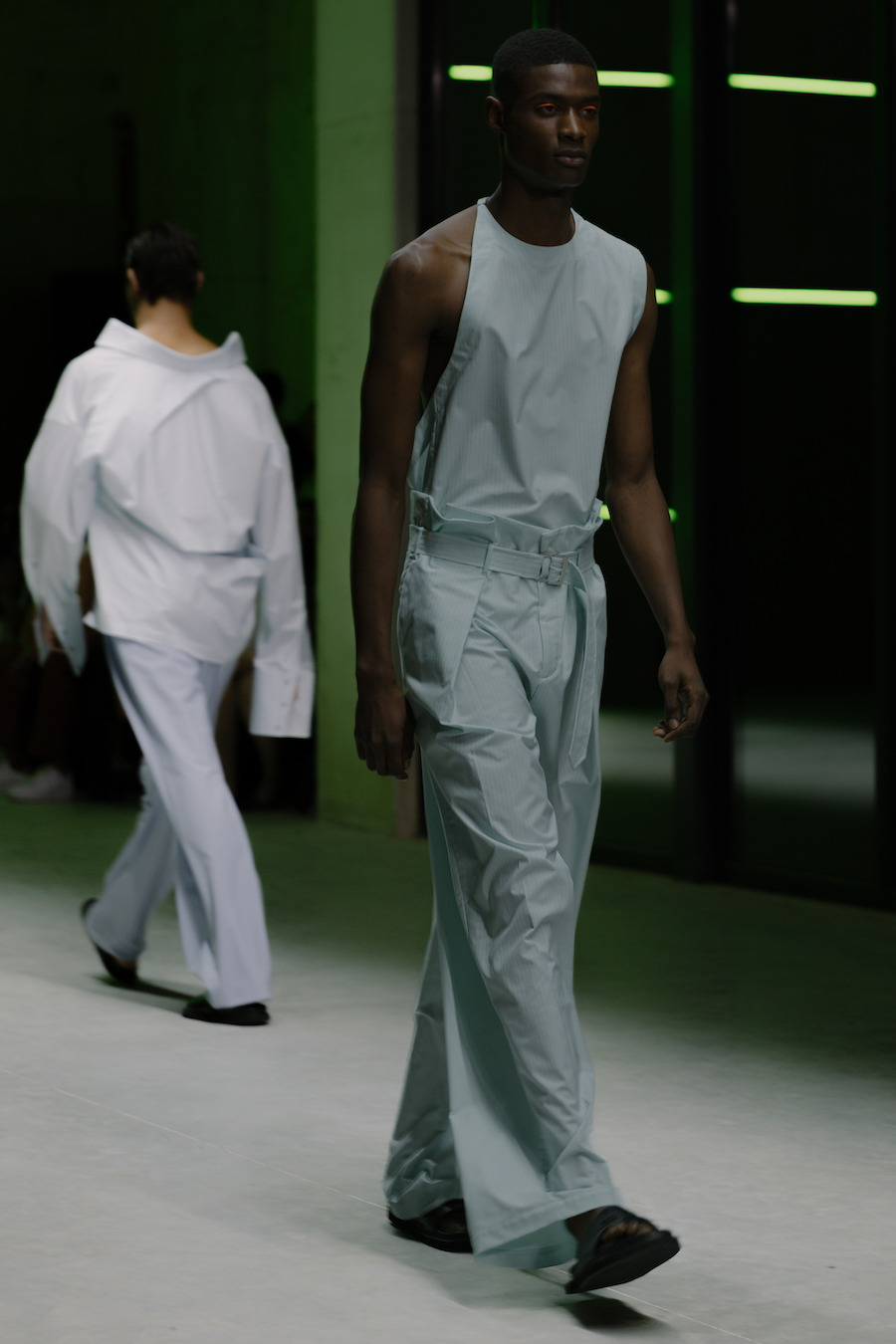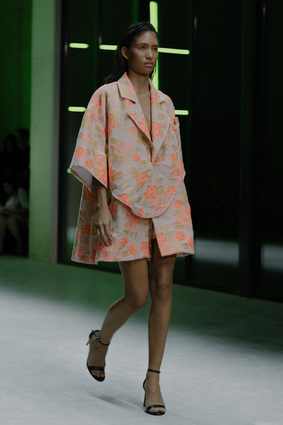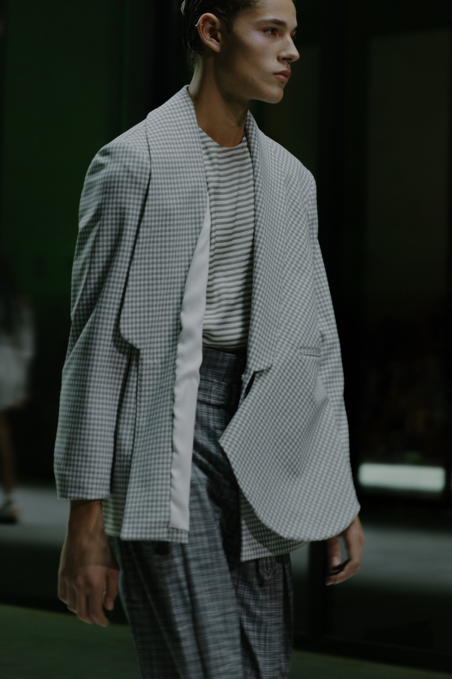 The edges and structures of the buildings, suggest oversized and straight silhouettes, as do the details worked on the pieces. The colours gain light and shine, with white, grey and fluor orange in line and striped patterns, worked over materials such as brocade, taffeta, twill and poplin.