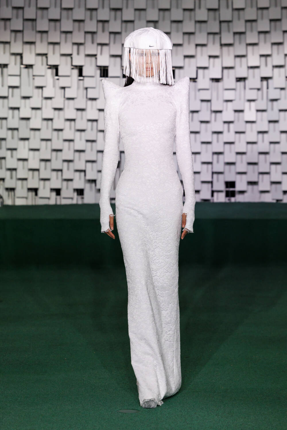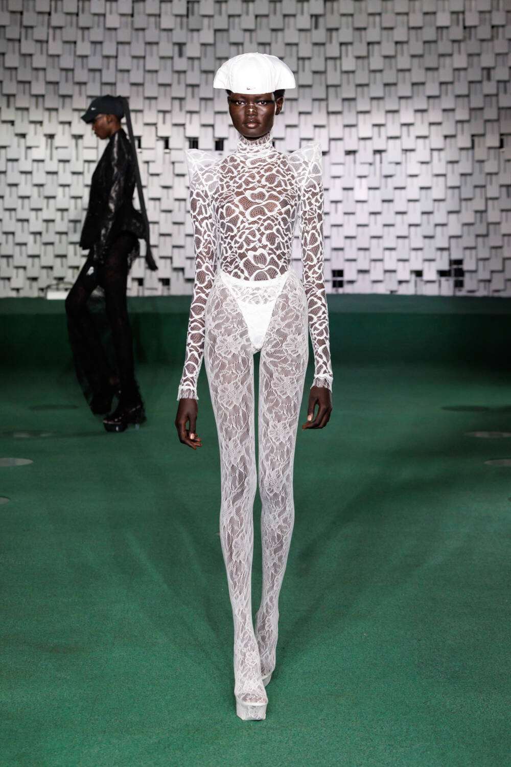 Let’s talk about the looks, though—because, wow breath-taking much? We’re talking virginal sheer lace catsuits that somehow balanced ethereal and fierce, dangerously low-cut skirts paired with matching thongs and a faux fur overcoat with shoulder pads so extra, they were practically their personality. And of course, he brought his iconic 3D horn-like structures, giving us all the theatrical, avant-garde vibes we could ask for.