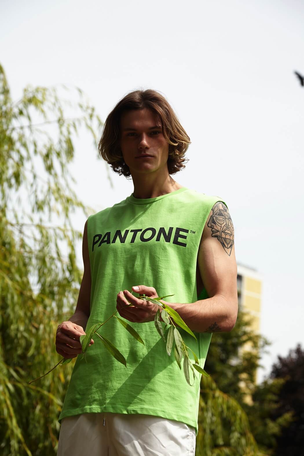 Cameron wears Bershka PANTONE sleeveless t-shirt & Penfield Seal Swim Shorts.