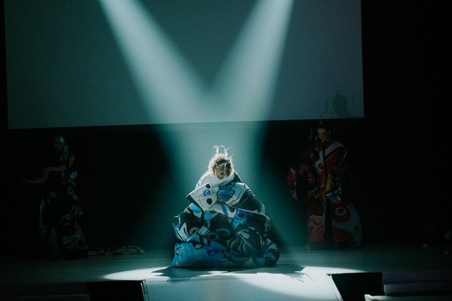 Danata Shaikenova of brzkna took the audience on a poignant exploration with her performance, “DID I?”, which traversed through the delicate terrain of personal experiences, intertwining bodily frames and fractures in a deeply personal narrative. Megan van Engelen’s “Berry” channelled nostalgic childhood memories, with fashion items and a blackberry bush drawing parallels to her experiences of family fragmentation. Alongside the live performance, she also premiered her fashion film “Berry,” further enriching the narrative.