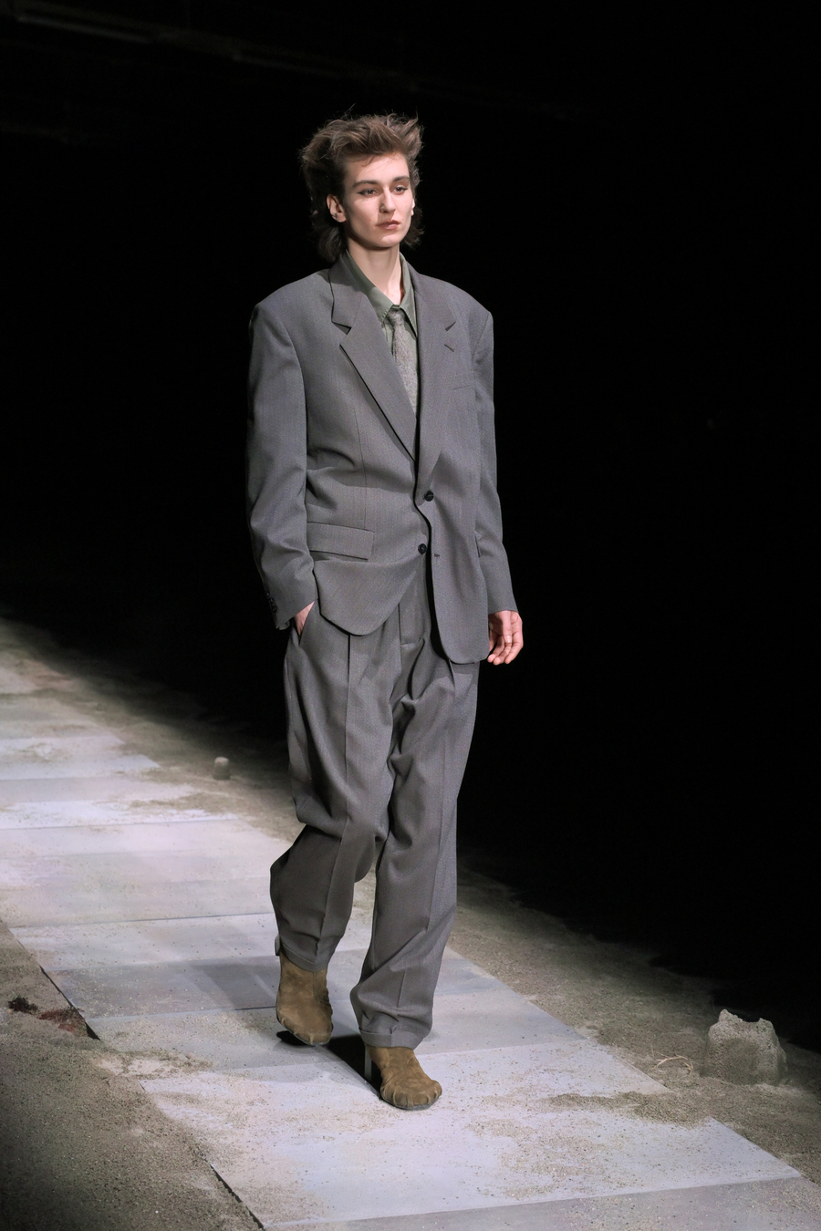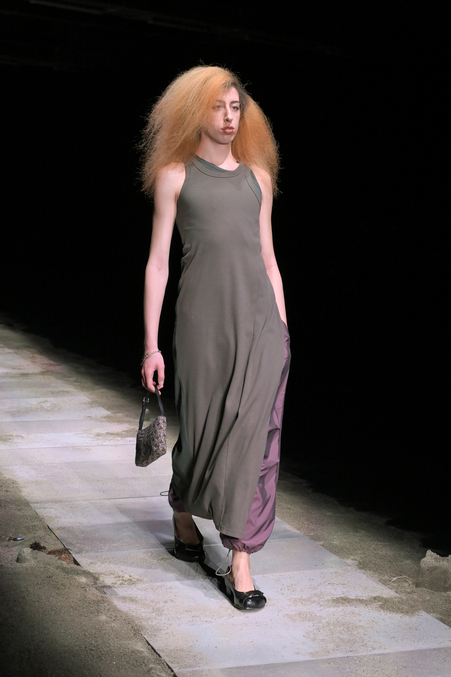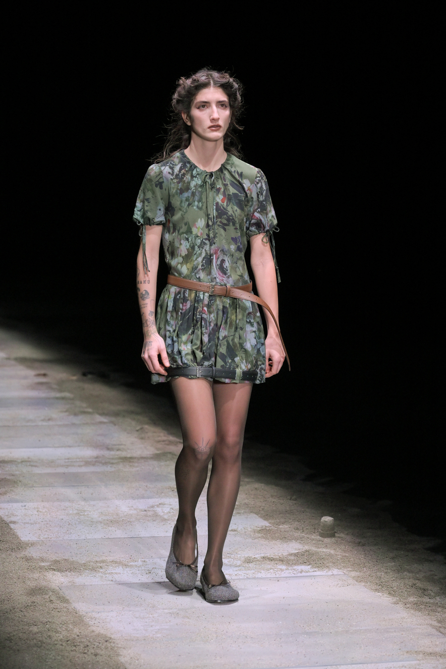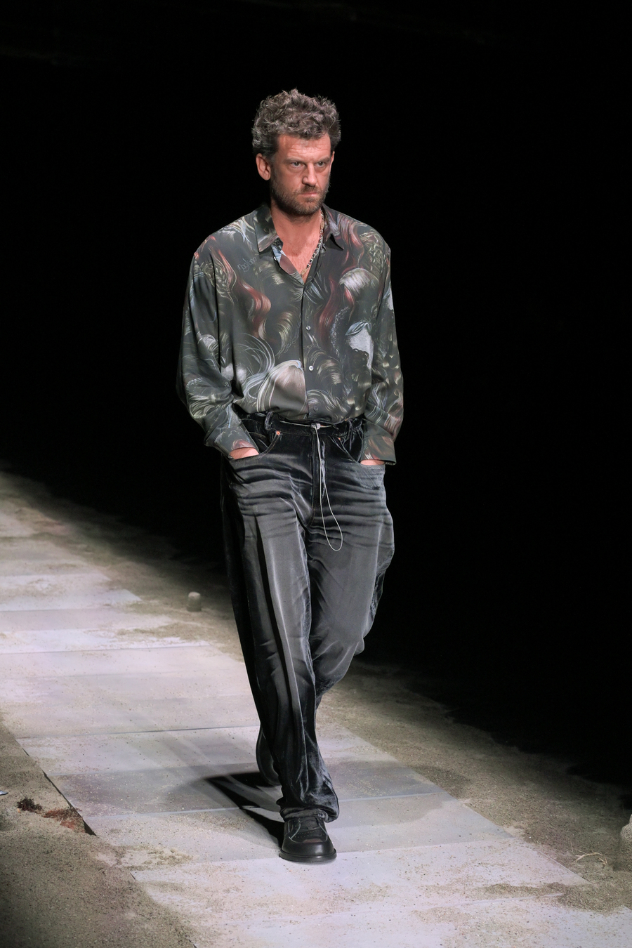 The prints featured throughout the show told stories of bygone eras; remnants of lost civilizations, echoes of mythological nightclubs, and fragments of cherished youth seamlessly blended into the fabric of the garments. Antique-like jewellery emerged as treasure unearthed from the sands of time: sweat-drenched chains and bracelets glimmering with mystique.