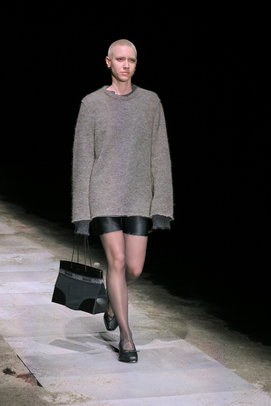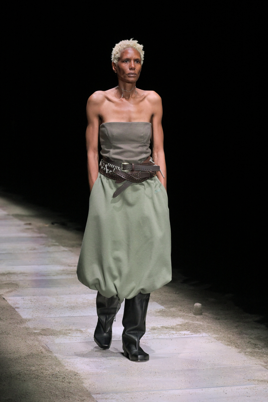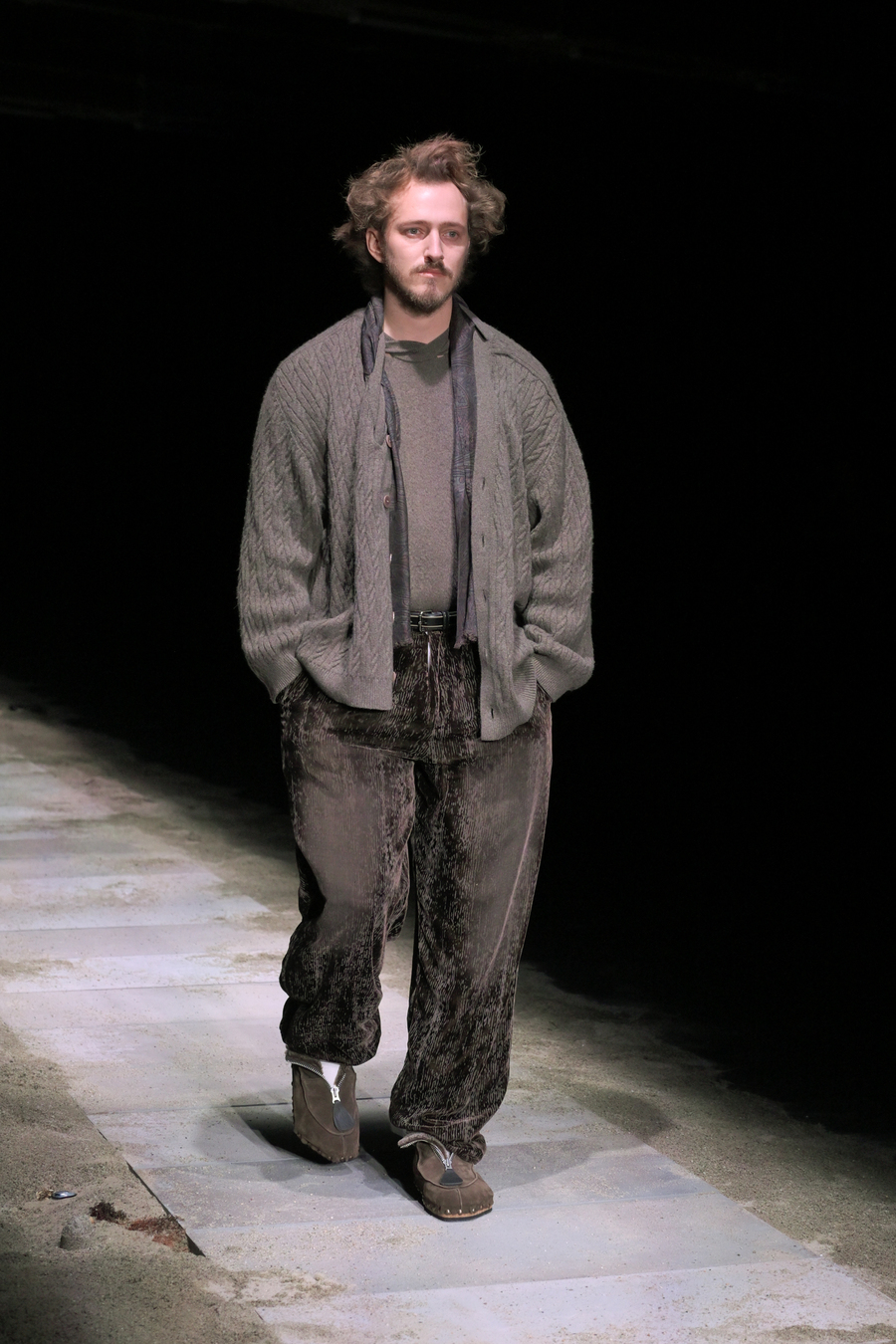 In a testament to the beauty found in decay, the knitwear adorned with sparkling Swarovski crystals projected a lunar radiance that captivated the audience. The evening was further enhanced by the enthralling soundscape composed by Aase Nielsen—an aural journey oscillating between aggression and serenity, tracing the horizon like an endless, rippling movement.
