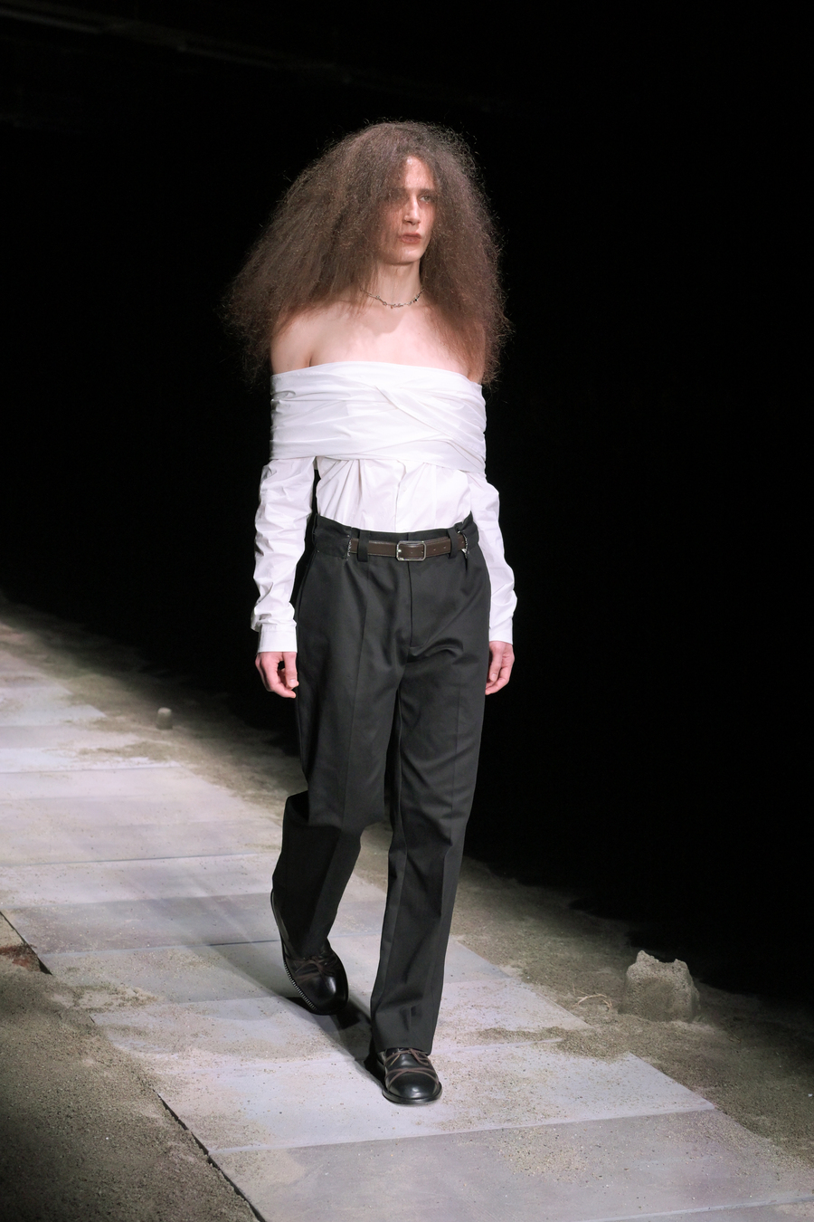In this new chapter of desire, the organic becomes an evocative challenge, blissfully disregarding comforting familiarity. The focus shifted to the décolleté—a stark, unyielding cut that dramatically exposes skin, reminiscent of a form of contemporary, fabric guillotine. This bold interruption serves as a powerful statement within the collection.