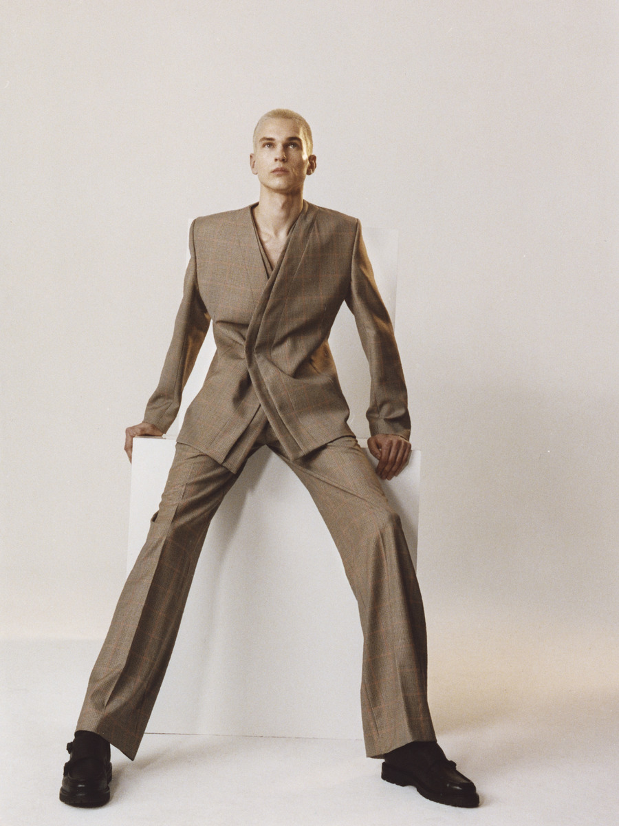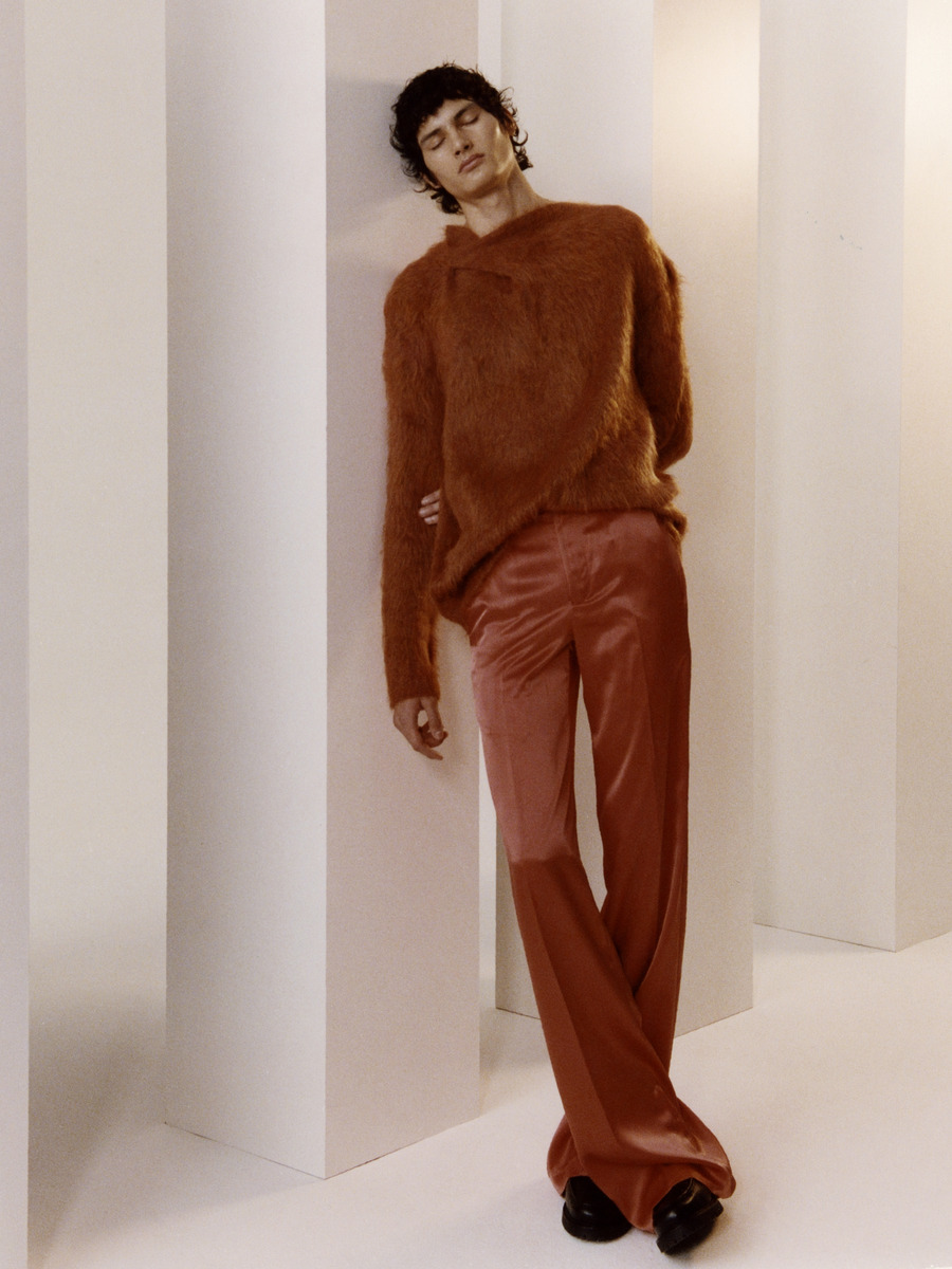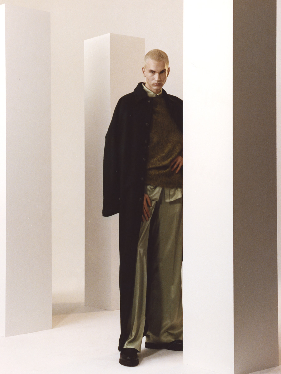A lineup of elevated everyday pieces; crisp cotton shirts, knits, trousers, overcoats, and an array of tailored jackets – an inherent characteristic of Mans. Some whose construction is more traditional with a classic crossing reminiscent of the school jacket or a double-crossing as well as the Mans Classic with a ’20s inspired eight-button sleeve vent. Since minimalism and the discard of abstractions is at the centre of attention in the collection the chest pockets are eliminated and the closures are concealed. With or without a lapel the jackets over the flowing trousers are impeccably-cut and create a sleek look – traditional fit on men, and oversized on women.