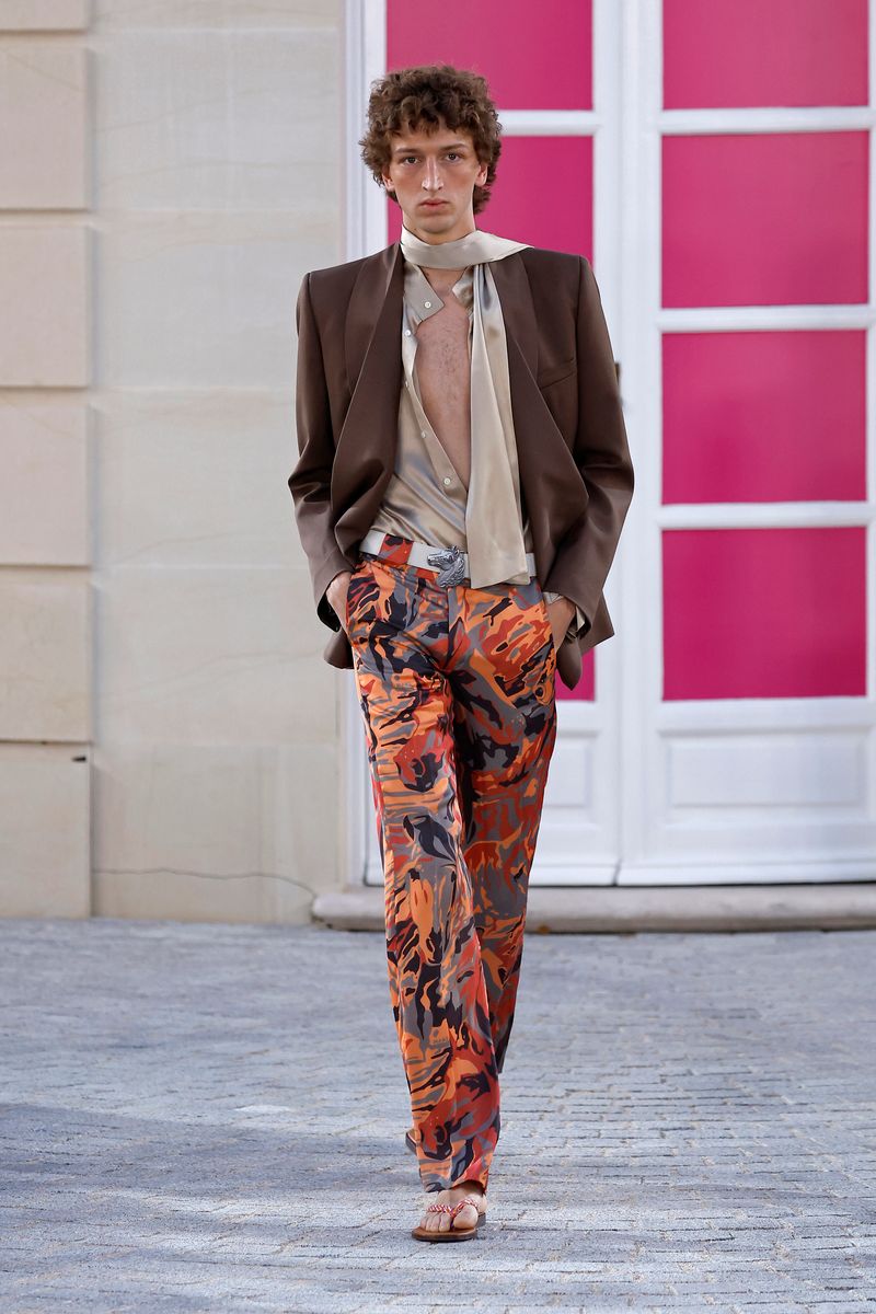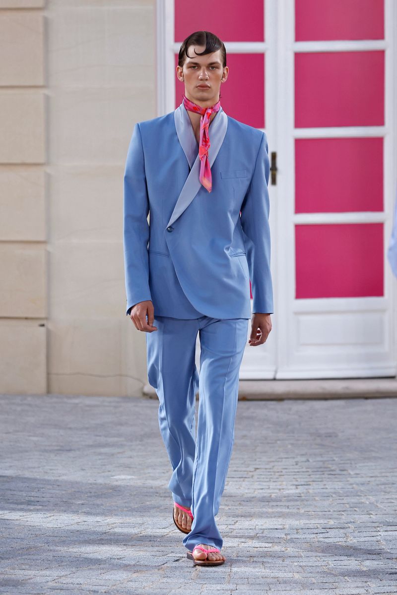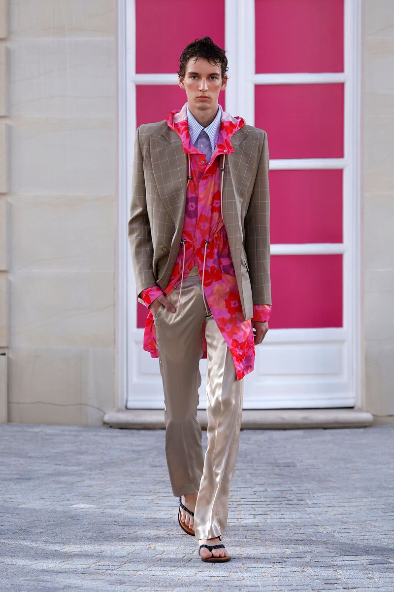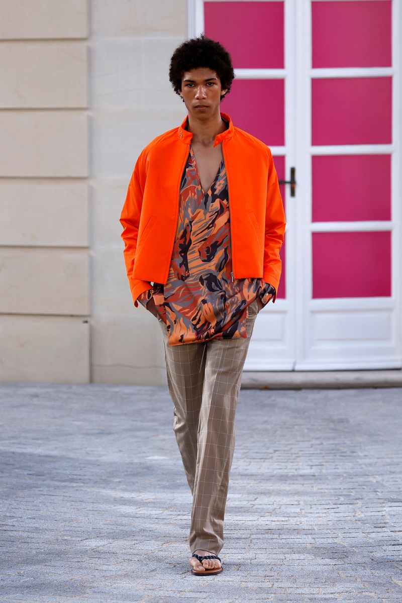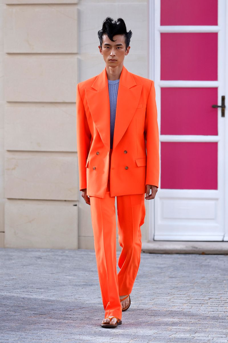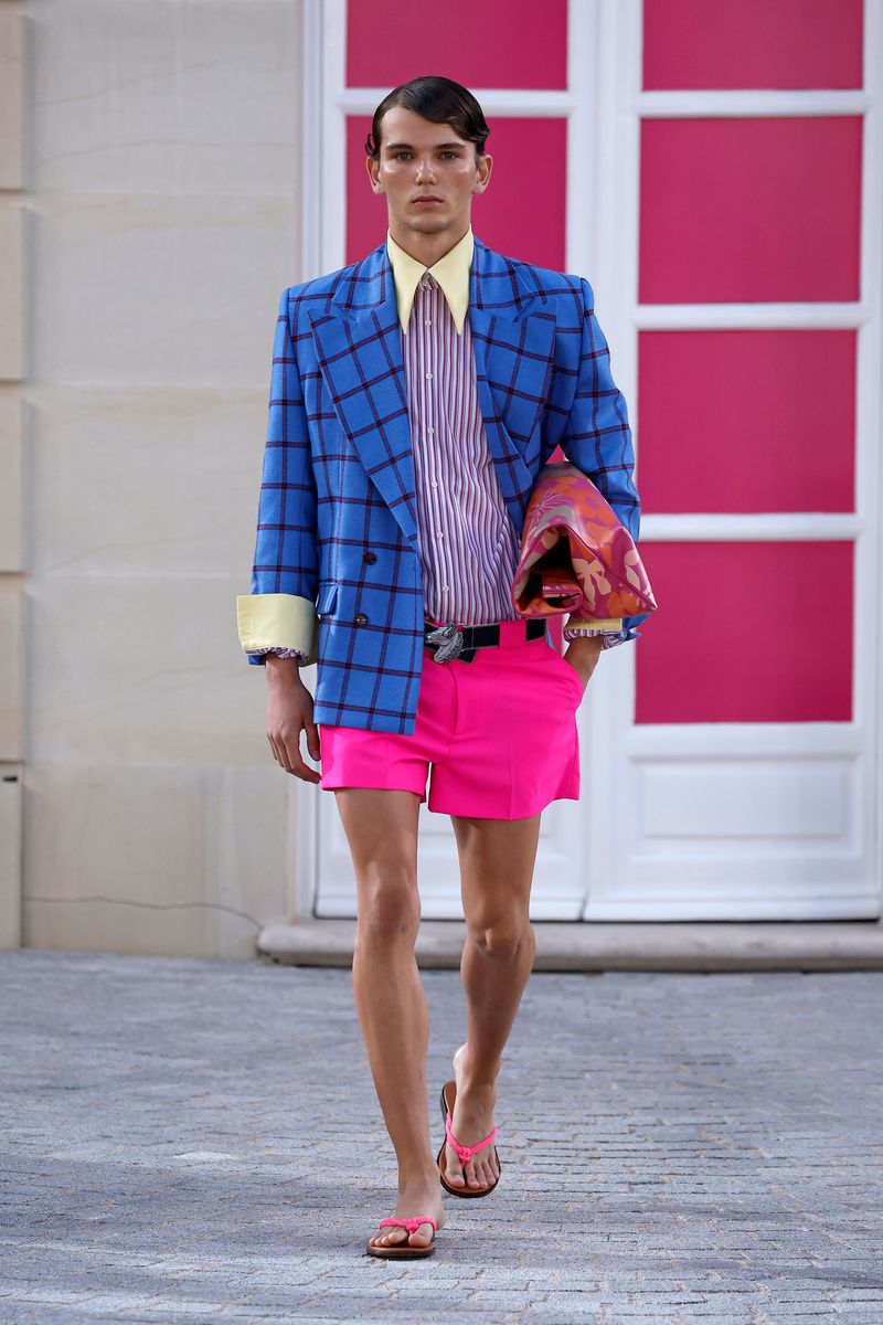 Bright pink, orange, purple, and light blue. In the colourful garden, the clothing matches the setting perfectly, with accompanying accessories adding a further touch of style, such as horse belt buckles, printed oversized leather tote bags, printed silk scarves, sailor knot flip-flops and hats far chicer than pork pie hat. The collection progresses from day to fiesta, office to club, summer in the city to the riviera. The lapels are enlarged and the jackets are in different lengths, either cropped as the traditional flamenco uniform or a double-breasted blazer with pleated detail of British influence with matching pleated pants without losing the modern essence that the designer wants to transmit from the culturally rich region of Sevilla.