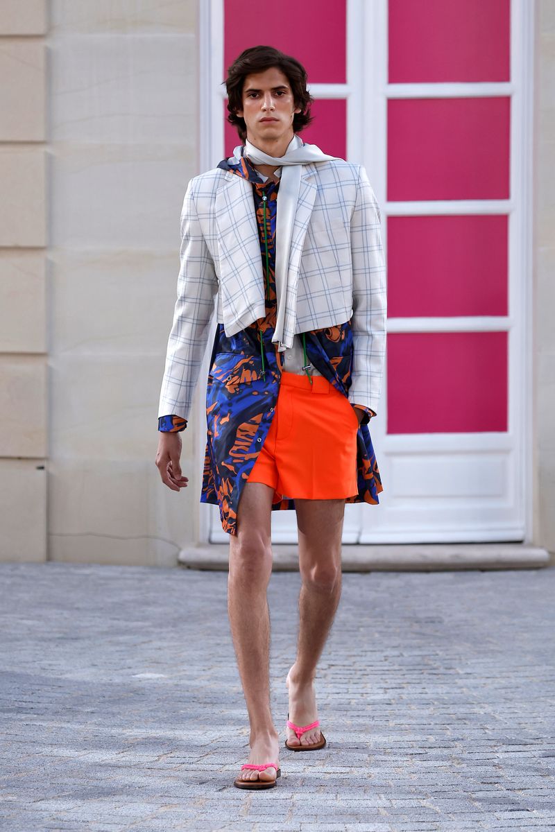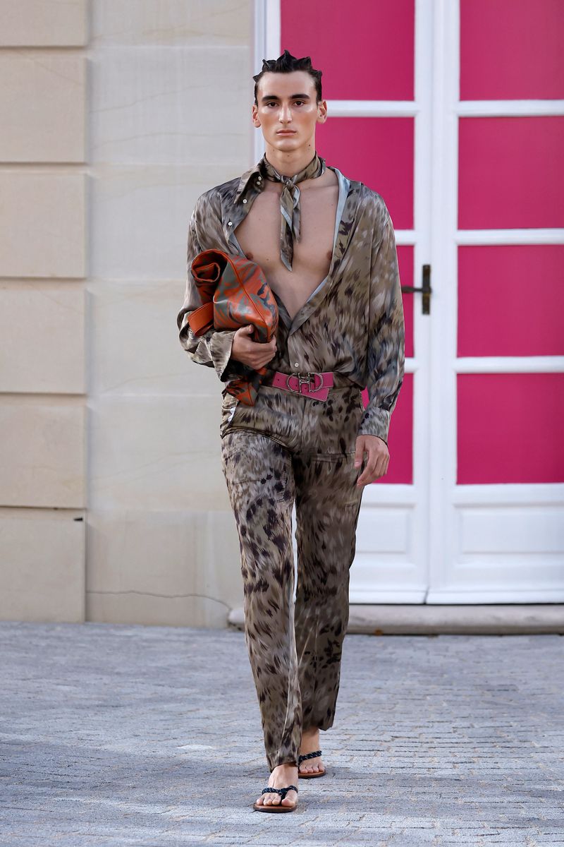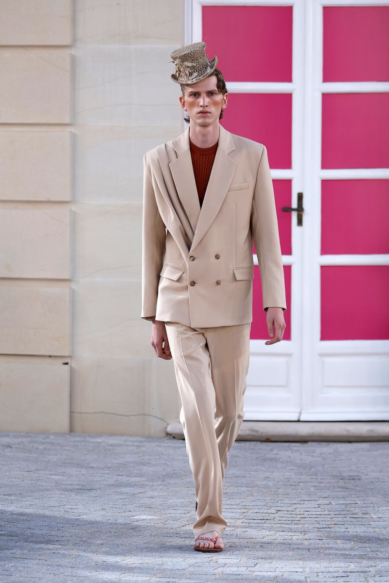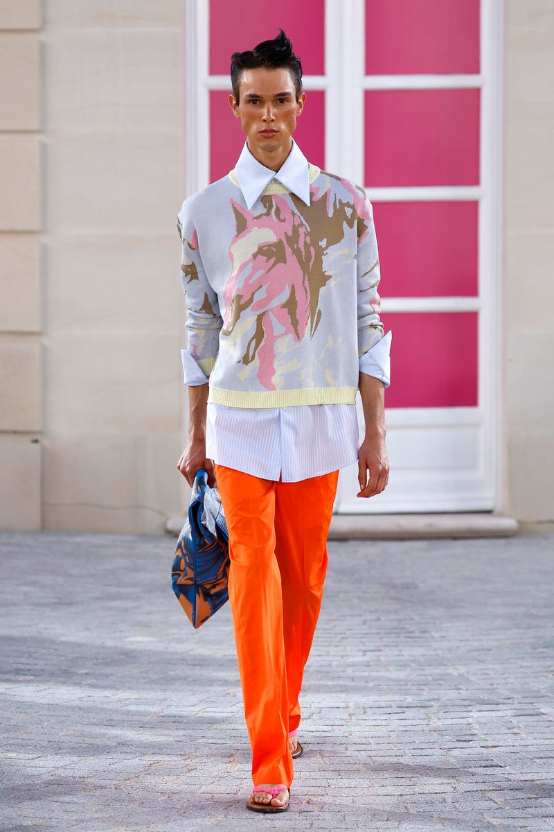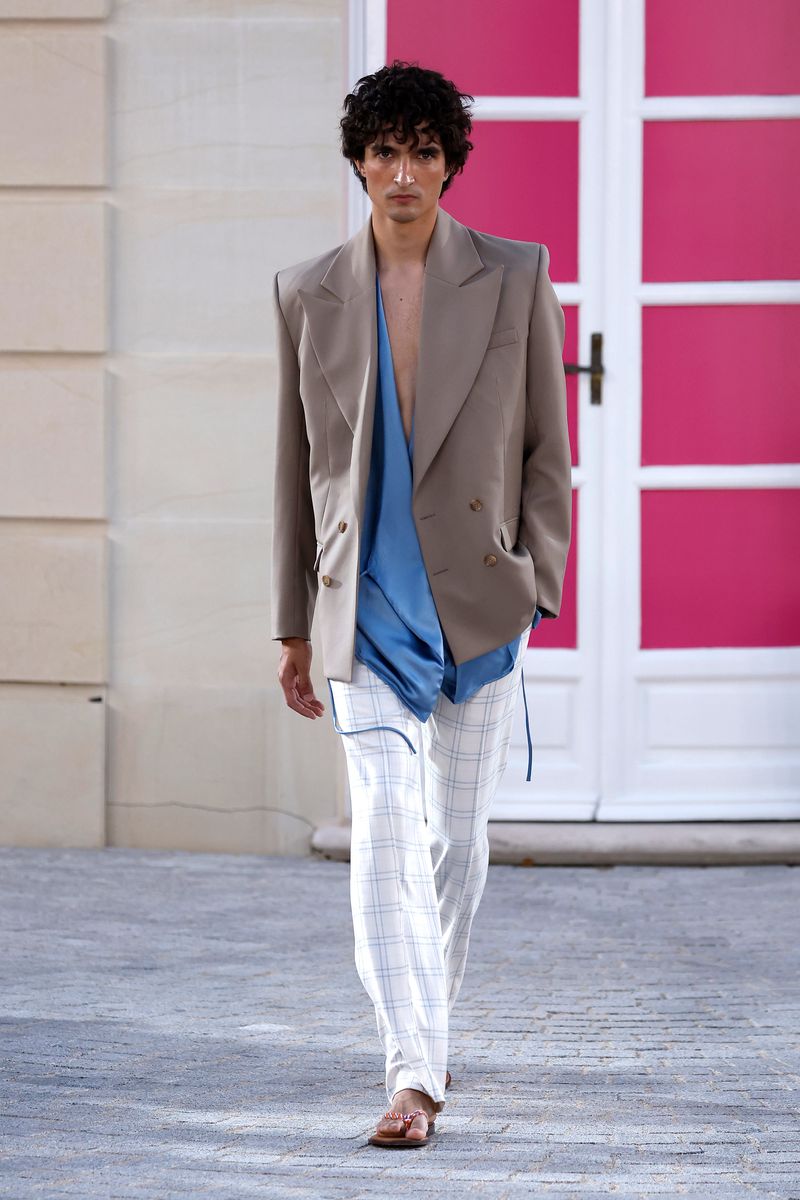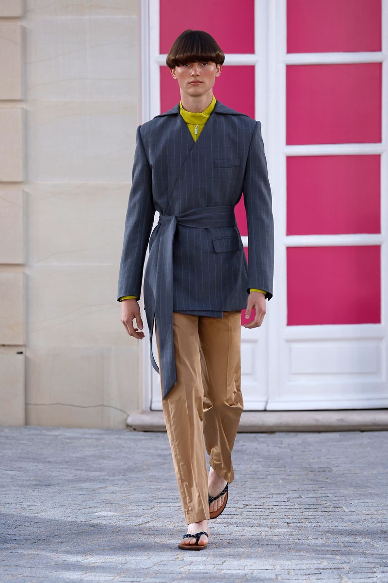 Bright pink, orange, purple, and light blue. In the colourful garden, the clothing matches the setting perfectly, with accompanying accessories adding a further touch of style, such as horse belt buckles, printed oversized leather tote bags, printed silk scarves, sailor knot flip-flops and hats far chicer than pork pie hat. The collection progresses from day to fiesta, office to club, summer in the city to the riviera. The lapels are enlarged and the jackets are in different lengths, either cropped as the traditional flamenco uniform or a double-breasted blazer with pleated detail of British influence with matching pleated pants without losing the modern essence that the designer wants to transmit from the culturally rich region of Sevilla.