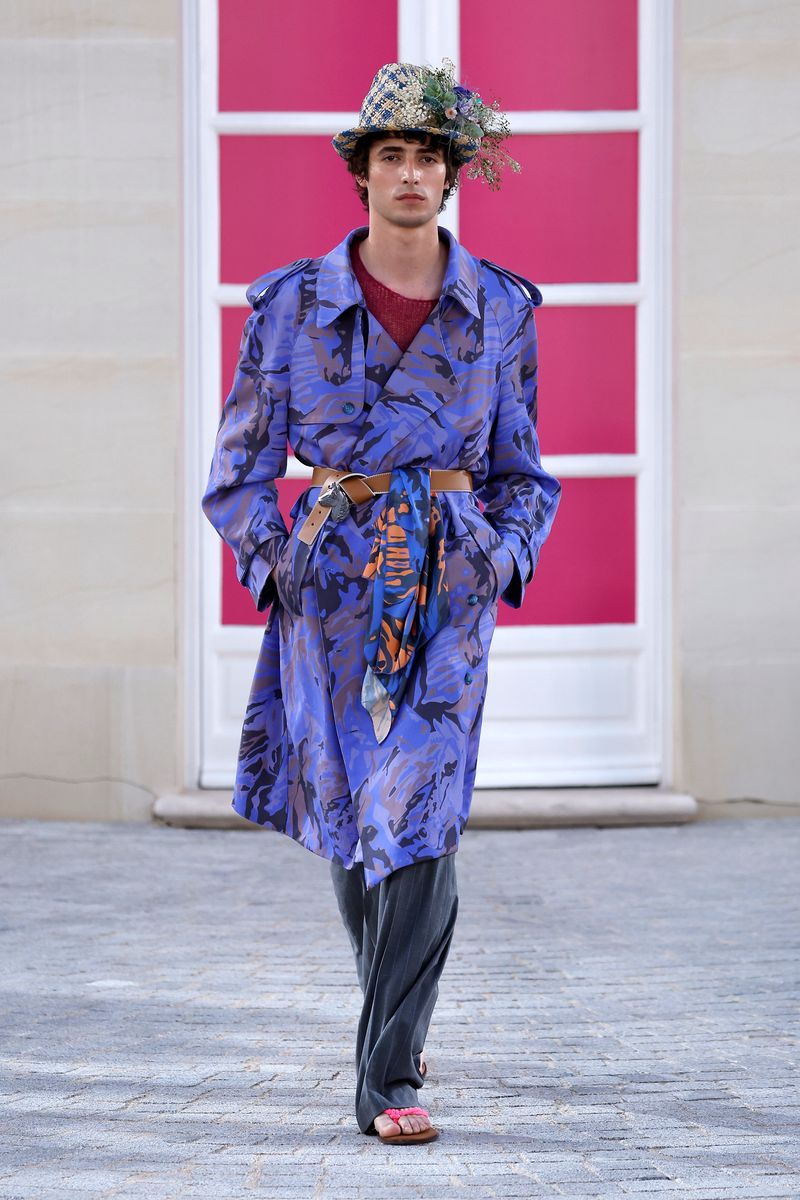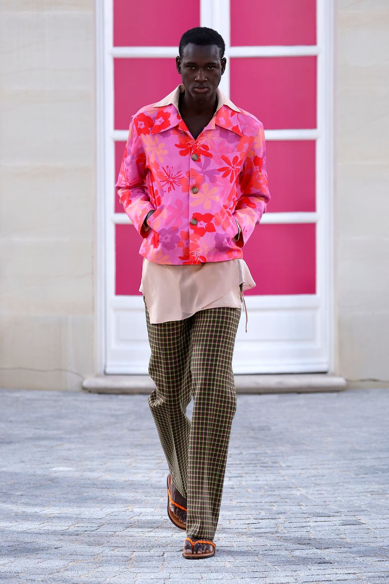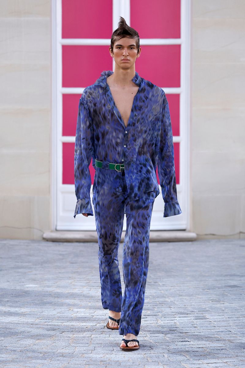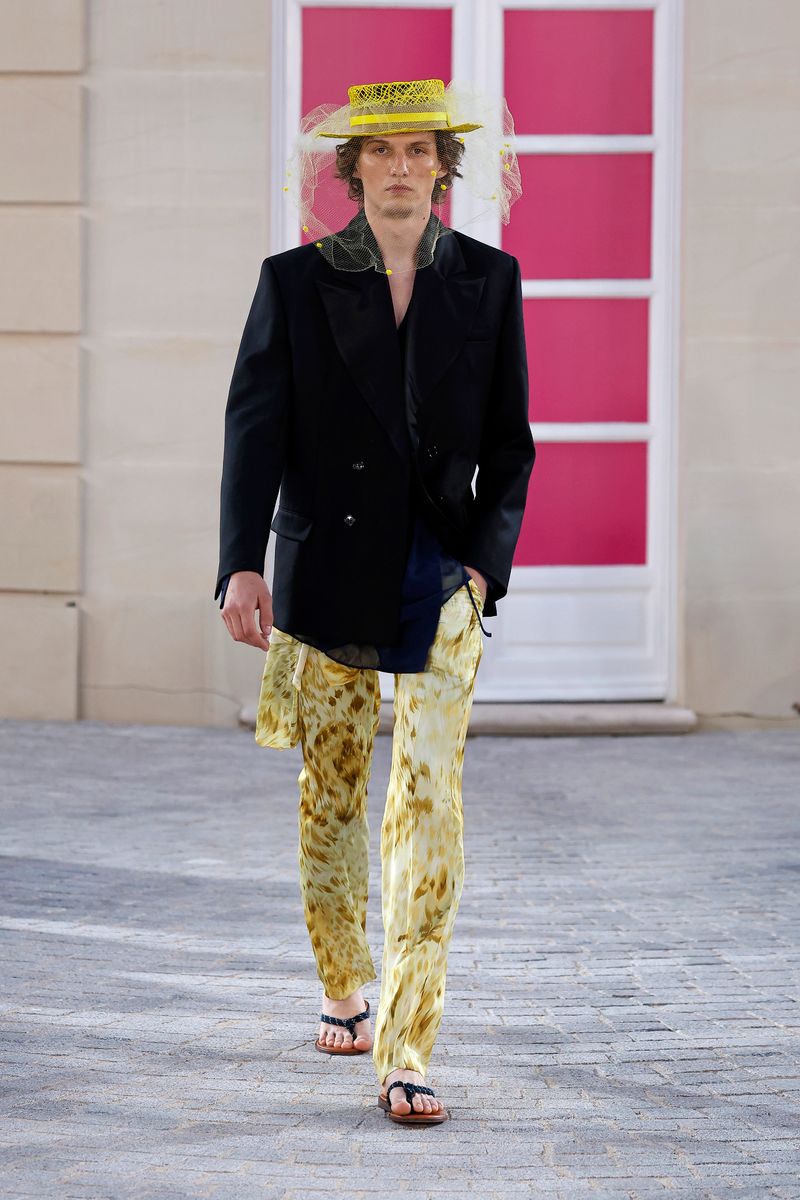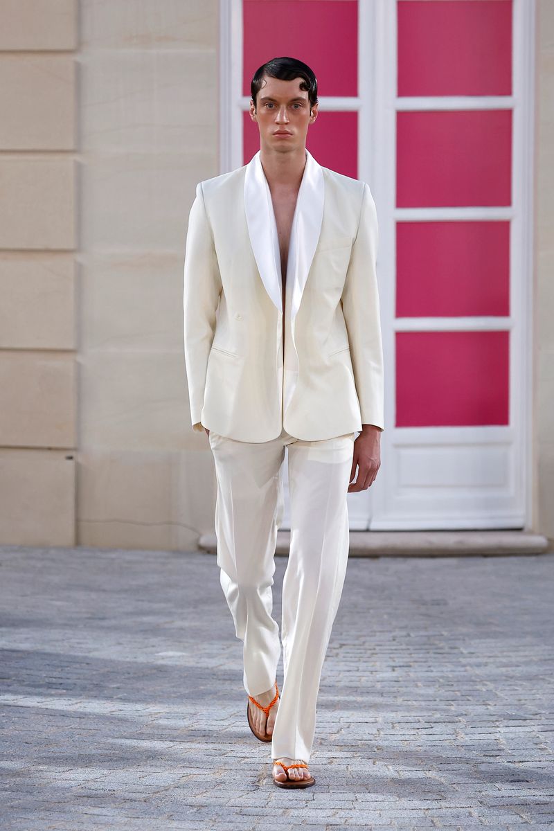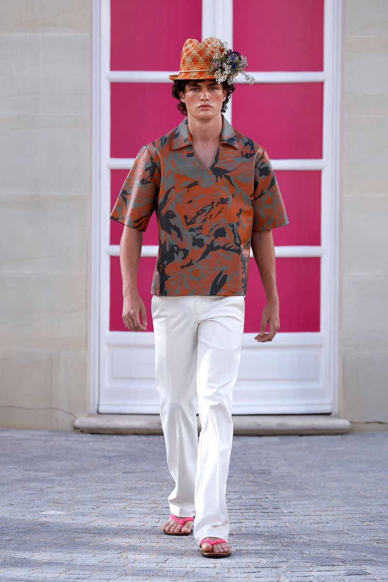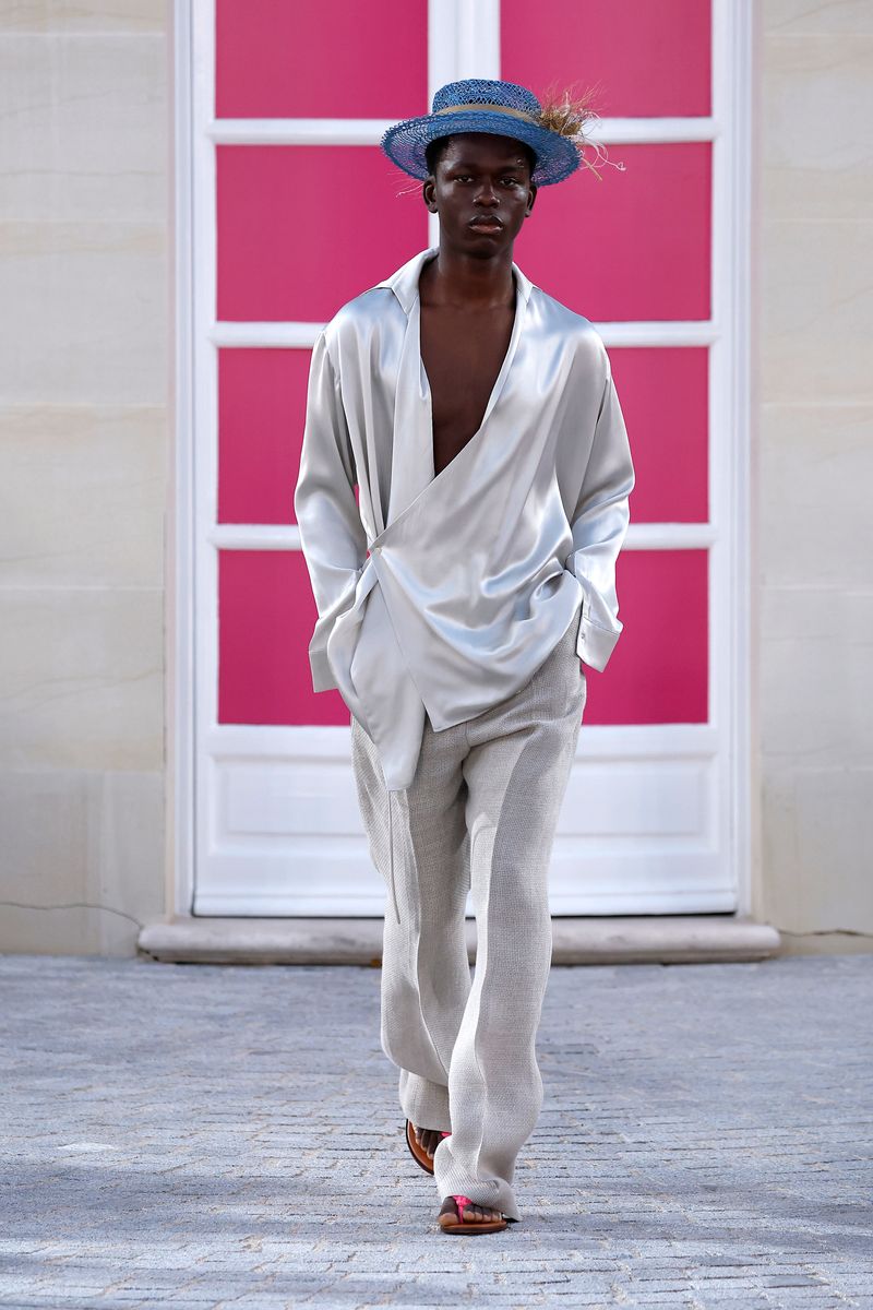 Bright pink, orange, purple, and light blue. In the colourful garden, the clothing matches the setting perfectly, with accompanying accessories adding a further touch of style, such as horse belt buckles, printed oversized leather tote bags, printed silk scarves, sailor knot flip-flops and hats far chicer than pork pie hat. The collection progresses from day to fiesta, office to club, summer in the city to the riviera. The lapels are enlarged and the jackets are in different lengths, either cropped as the traditional flamenco uniform or a double-breasted blazer with pleated detail of British influence with matching pleated pants without losing the modern essence that the designer wants to transmit from the culturally rich region of Sevilla.
