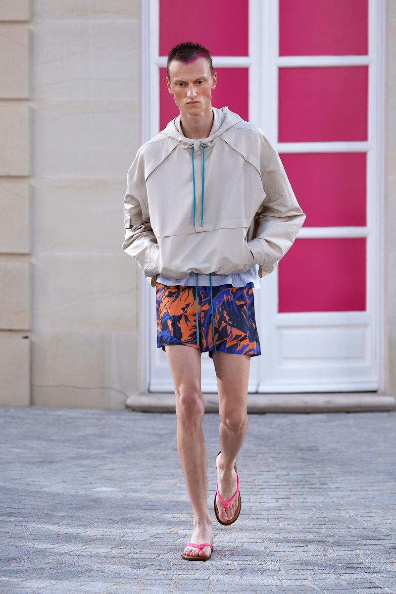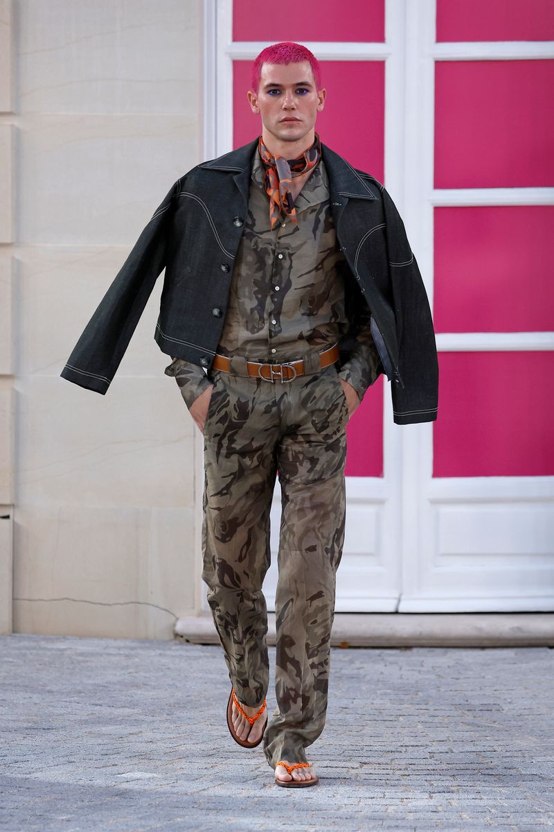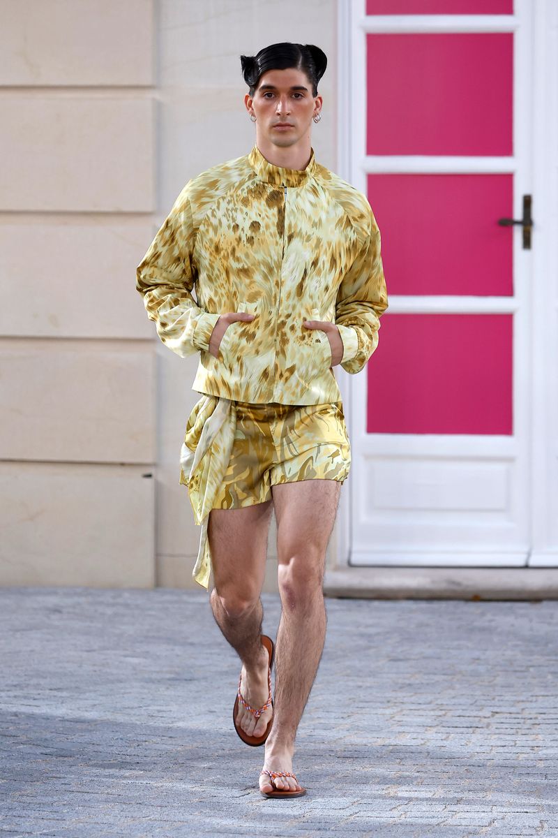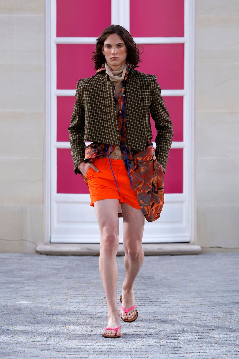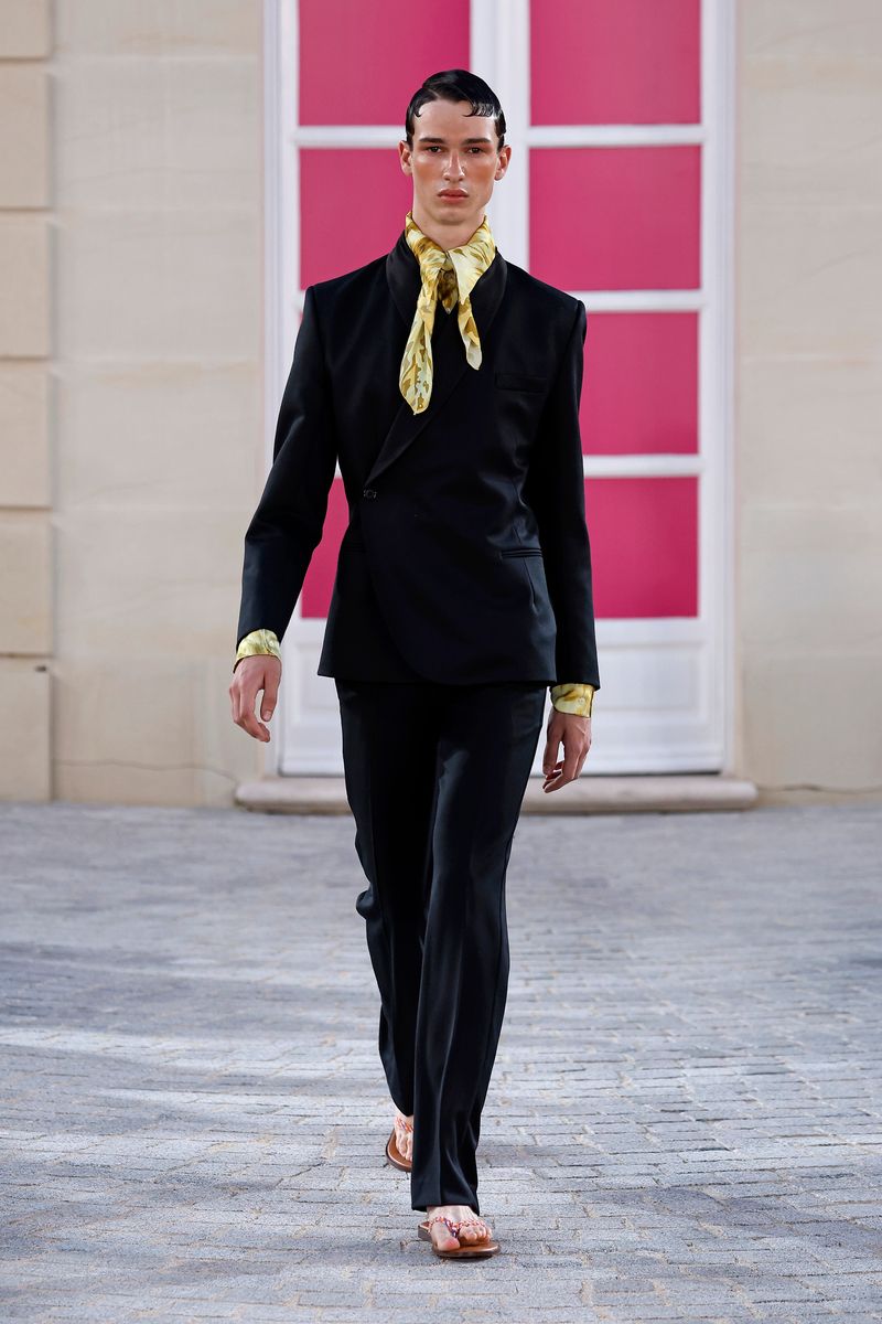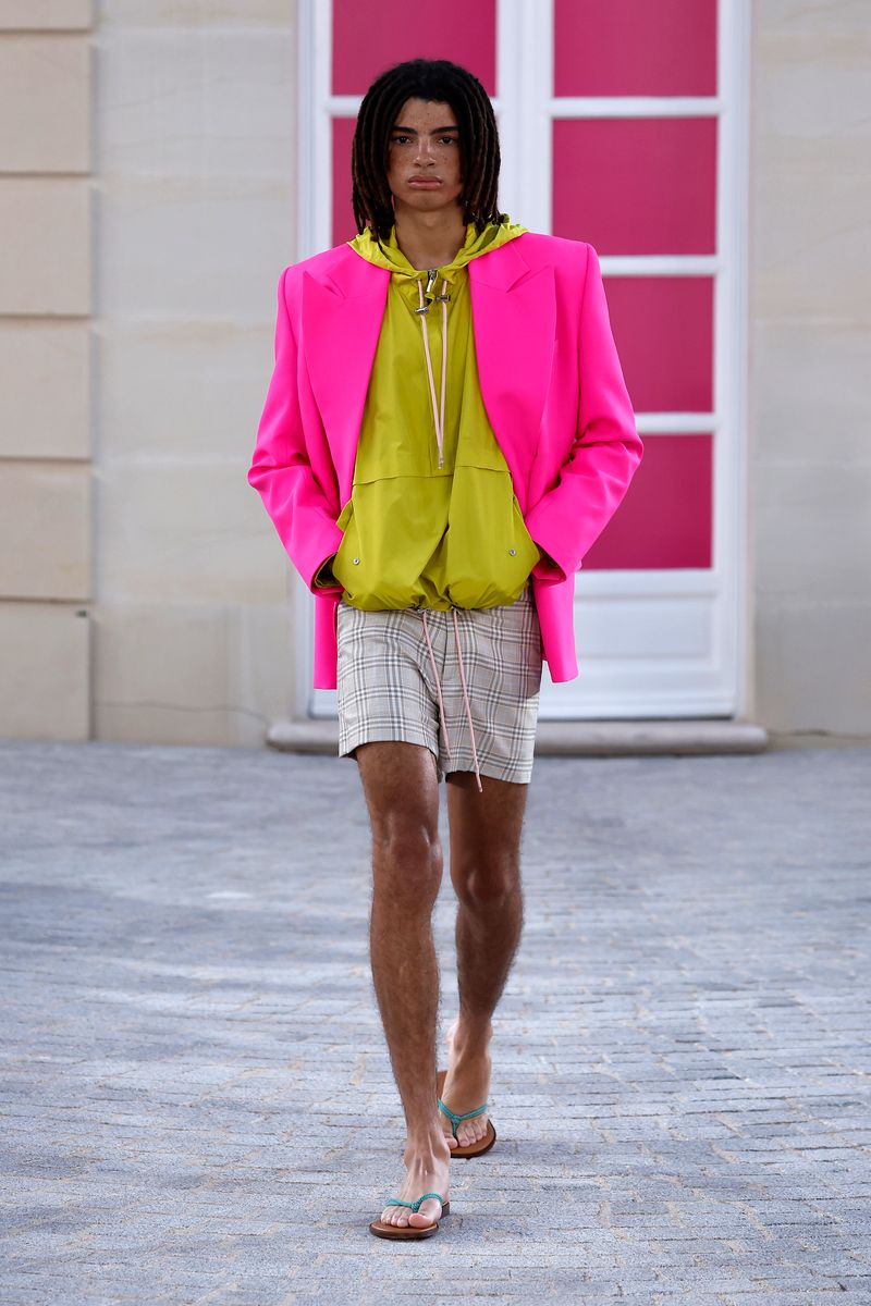 Bright pink, orange, purple, and light blue. In the colourful garden, the clothing matches the setting perfectly, with accompanying accessories adding a further touch of style, such as horse belt buckles, printed oversized leather tote bags, printed silk scarves, sailor knot flip-flops and hats far chicer than pork pie hat. The collection progresses from day to fiesta, office to club, summer in the city to the riviera. The lapels are enlarged and the jackets are in different lengths, either cropped as the traditional flamenco uniform or a double-breasted blazer with pleated detail of British influence with matching pleated pants without losing the modern essence that the designer wants to transmit from the culturally rich region of Sevilla.